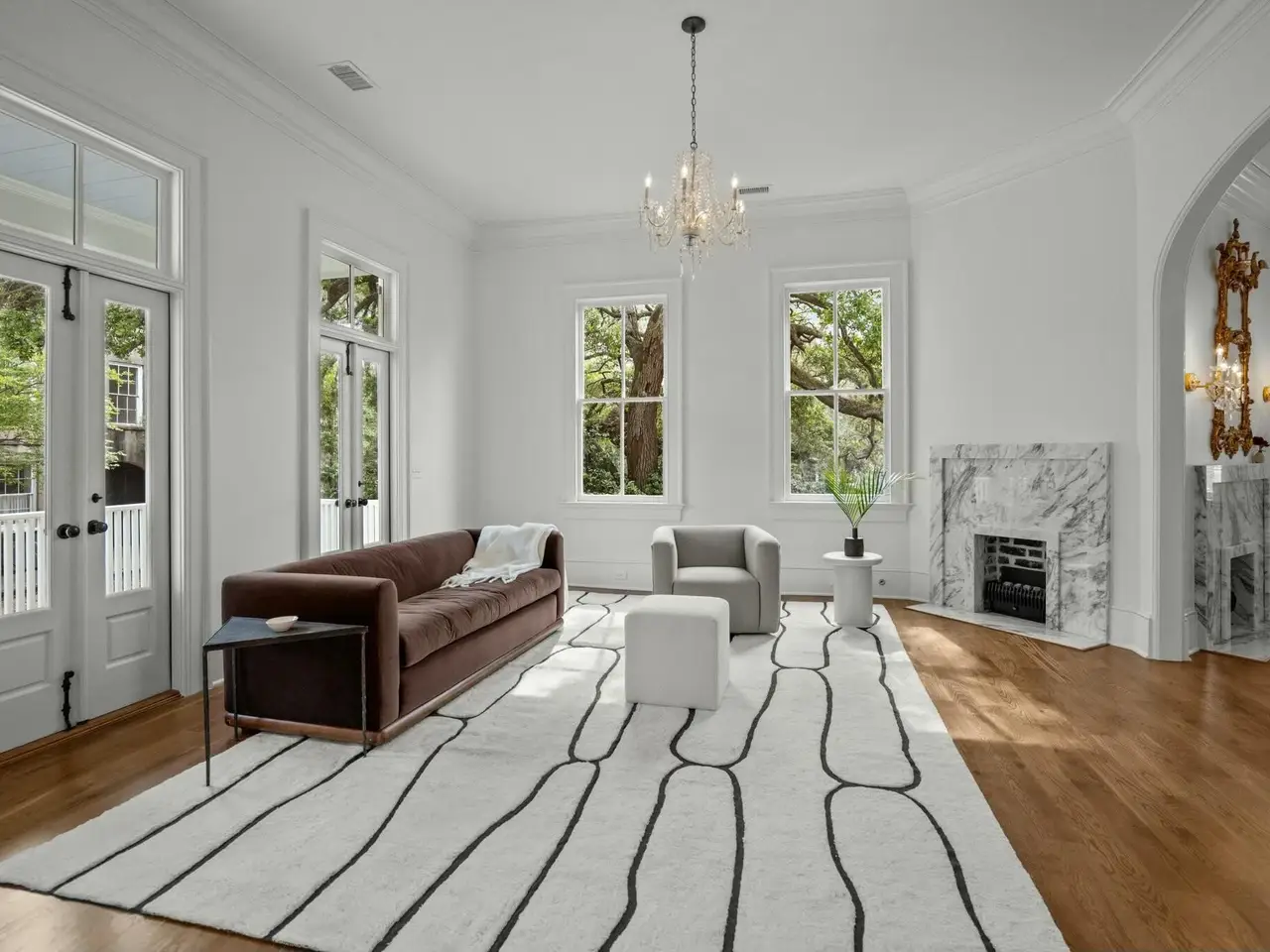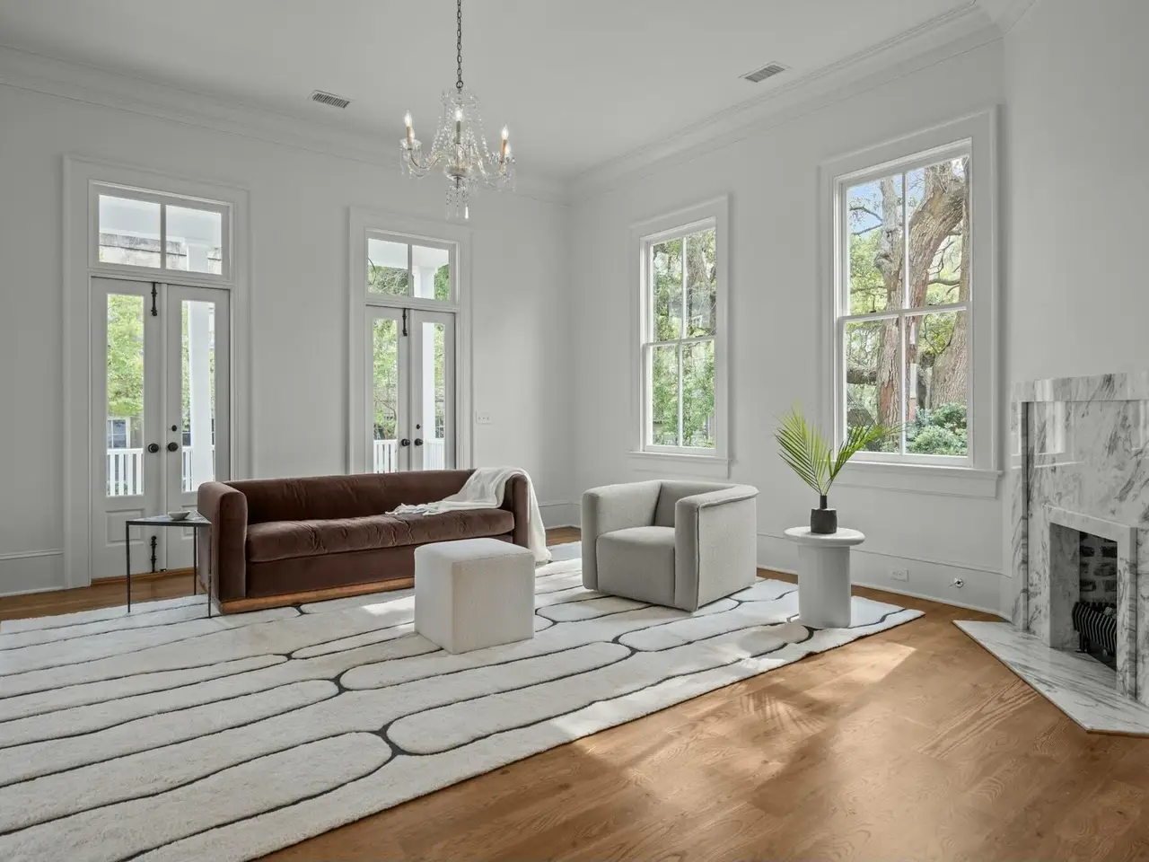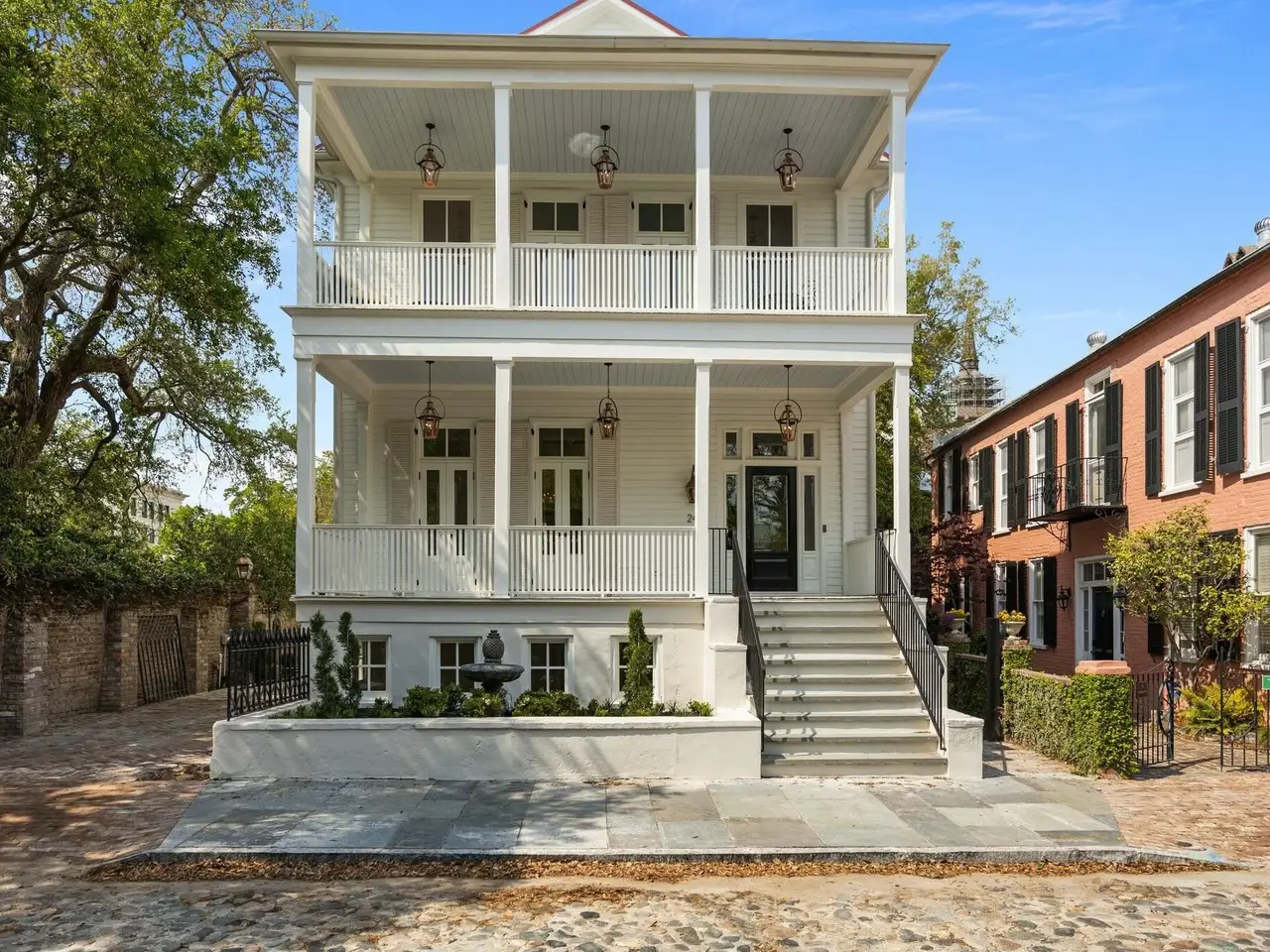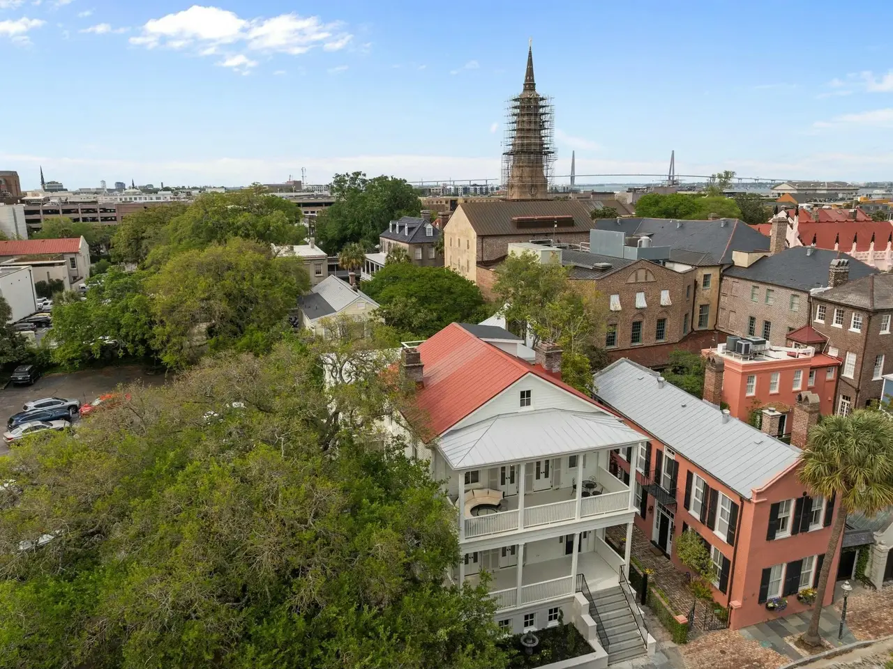 Welcome to La Belle Maison. Completely and thoughtfully renovated, this gracious home, sited on high ground (X Zone) within the original Walled City on Charleston's longest cobblestone street, is turn-key and move-in ready. 24 Chalmers boasts unusual wide, front to back views, from the sunny south-facing piazza, through parlors and dining room, to the gourmet kitchen with La Cornue range and Calacatta marble cladding. Four gas fireplaces throughout the home will make chilly nights cozy. There are primary suites on both the first and second floors. Each of the five ensuite bathrooms has access to private outdoor space which boast views of the many churches and landmarks in the French Quarter. The roof deck provides iconic views of St. Philip's Church, the Mills House, Circular Congregational Church, and the Dock Street Theatre. A secluded patio and garden lie behind secured gated parking for two cars. A spacious guest apartment is accessible at street level, with its own gated entrance and electric meter, perfect for visitors or a rental. Also at street level is a large family room/media room with a catering kitchen, bathroom, and elevator to make living easy. Main residence has 6 bedrooms, 6.5 baths and approximately 5300 SqFt. Guest suite/apartment has 2 bedrooms, 1 bath and approximately 1000 SqFt. 24 Chalmers will be featured as the 2025 Charleston Symphony Orchestra League showhouse.