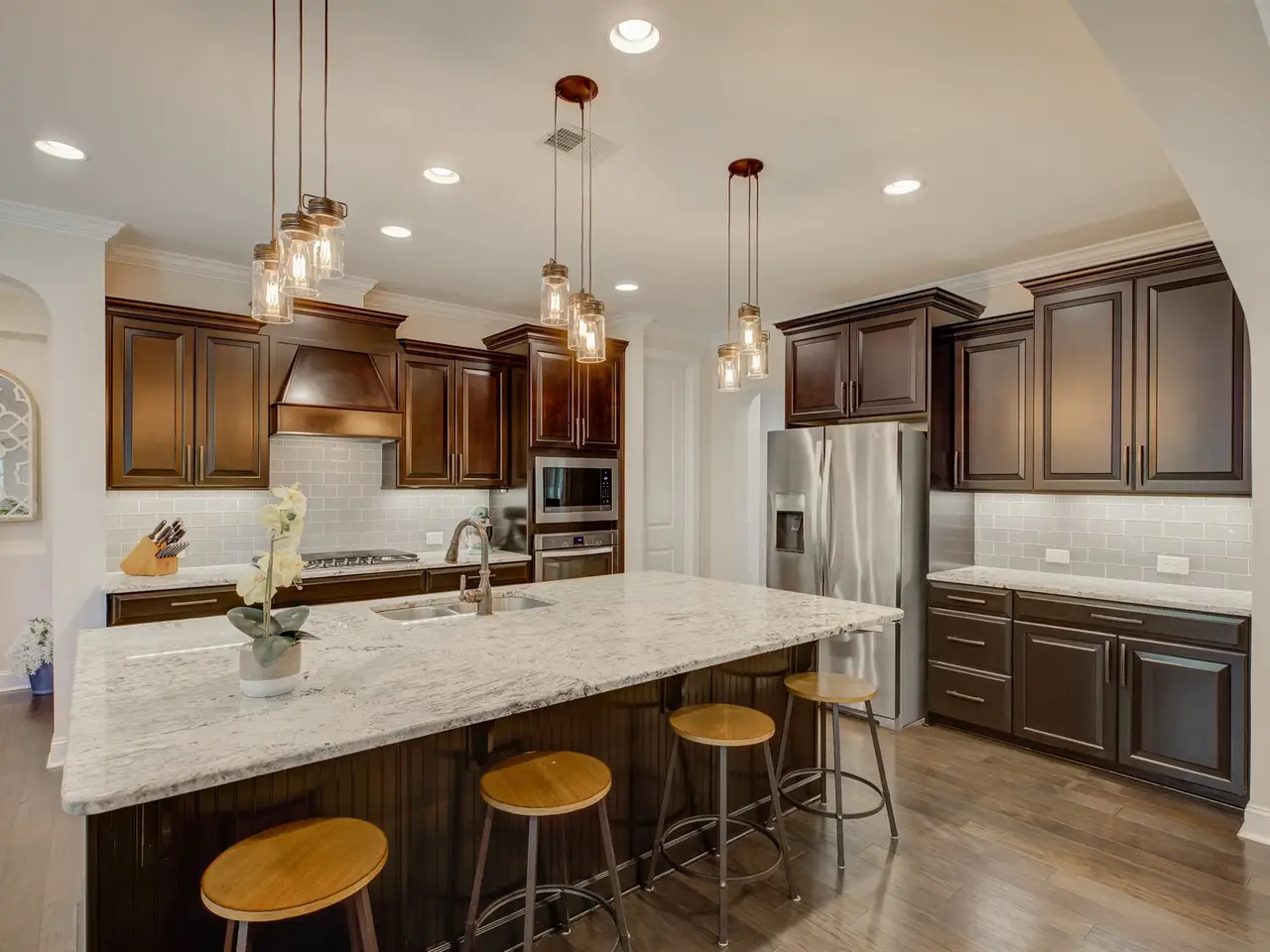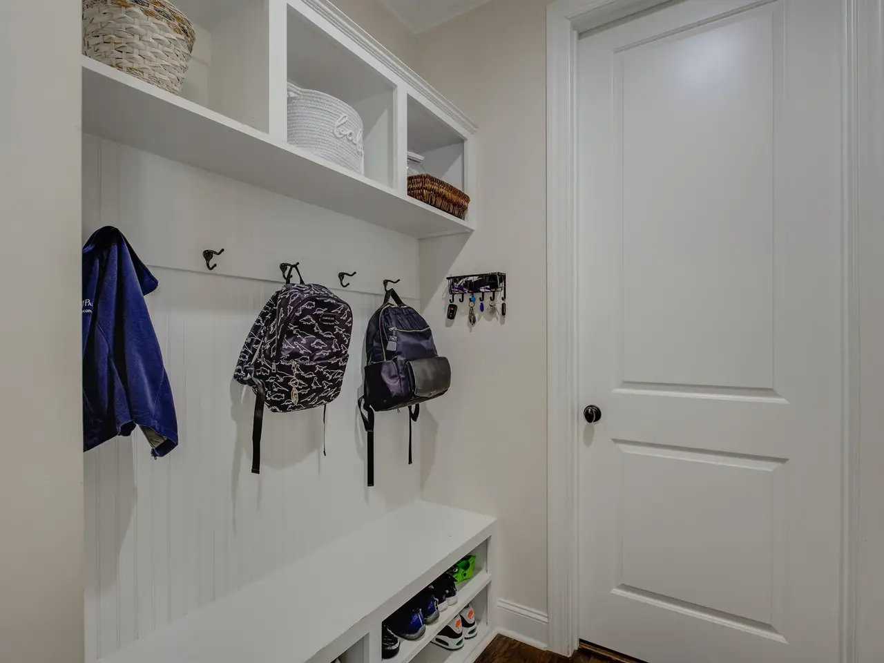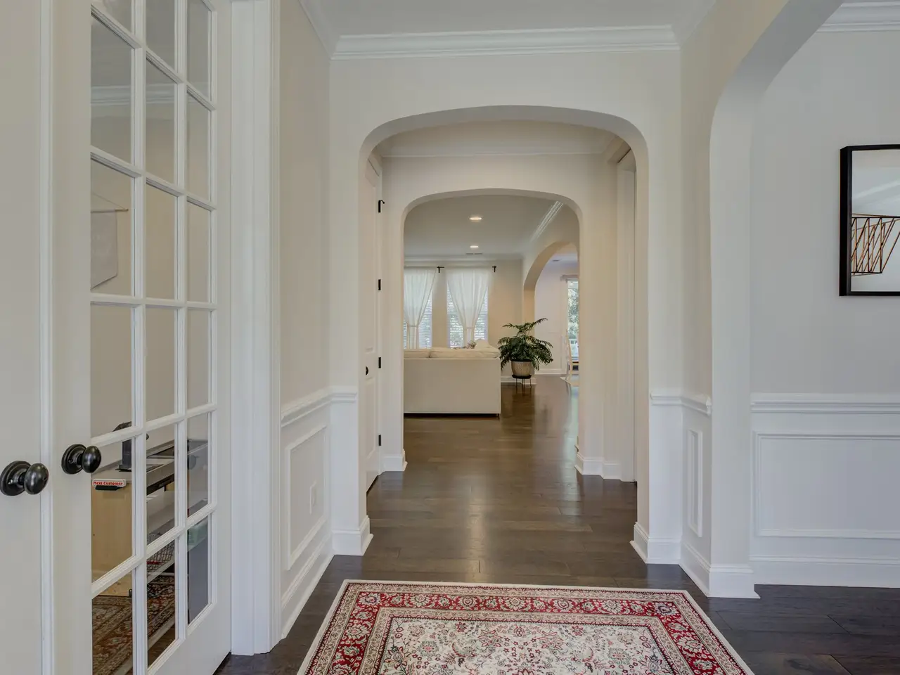Located in the exclusive gated community of Bear Creek within the amenity-rich Palisades, this home offers the perfect balance of elegance, comfort, and country club living. A welcoming rocking chair front porch opens into a grand foyer, where a private French door study sits opposite the formal dining room. The elegant dining room showcases a coffered ceiling and wainscoting, details that carry down the hall into the great room. Rich hardwood floors connect the open-concept main level. A butler's pantry with a beverage refrigerator leads to the gourmet kitchen, featuring espresso cabinetry, a large prep island, granite countertops, pendant lighting, a gas cooktop, and a wall oven. The spacious great room is anchored by a gas fireplace and filled with natural light. The breakfast area opens to a screened porch, perfect for year-round enjoyment. Outside, enjoy a private wooded and fenced backyard complete with an expansive paver patio, built-in firepit, and in-ground irrigation. The main-level primary suite is a true retreat, featuring a coffered ceiling, a spa-like bath with a soaking tub, a glass-enclosed shower, dual vanities, and a walk-in closet. Upstairs, four bedrooms include one with a private bath, two sharing a hall bath, and a fifth expansive bedroom that could also function as a fantastic bonus room. A 2-car garage plus a separate 1-car garage provide ample parking and storage. Bear Creek residents enjoy a private gated enclave while also accessing The Palisades' incredible lifestyle amenities: homeowners' clubhouse, fitness center, outdoor pool, pickleball and basketball courts, and miles of scenic walking trails. Optional golf and social memberships at The Palisades Country Club elevate the experience, offering championship golf, dining, and events just minutes from home.