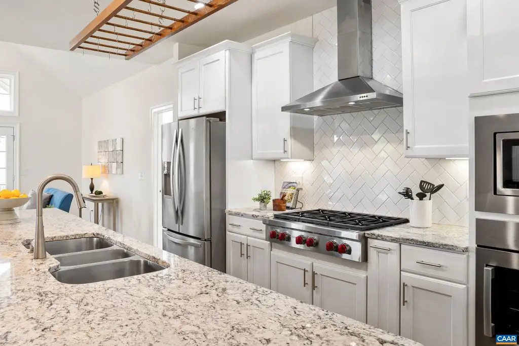 Wolf range and custom pot rack in chef's kitchen