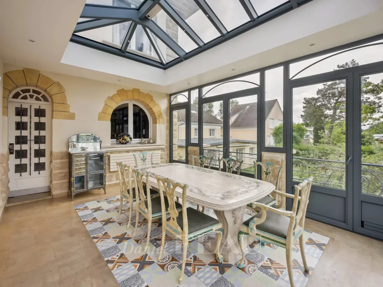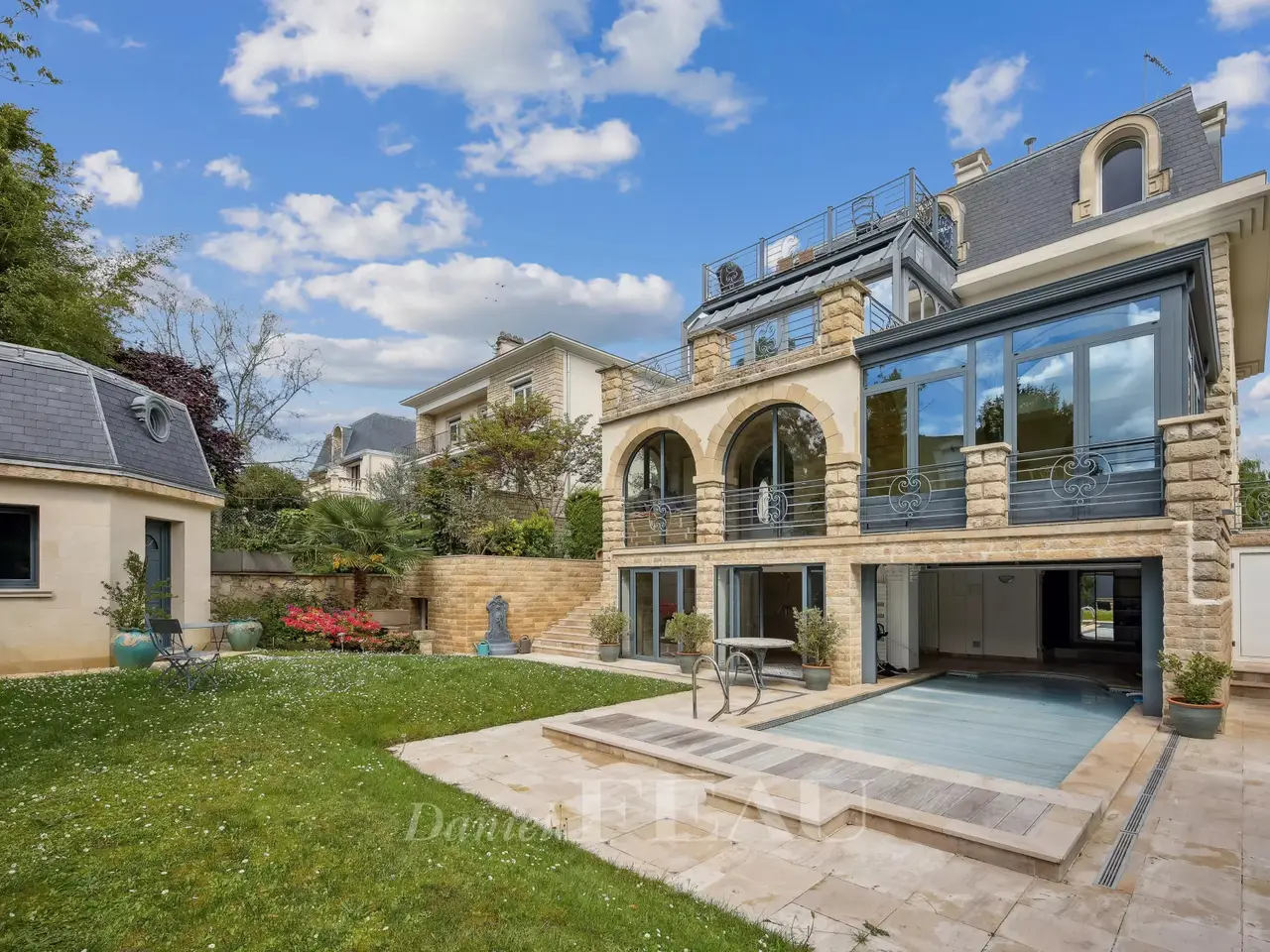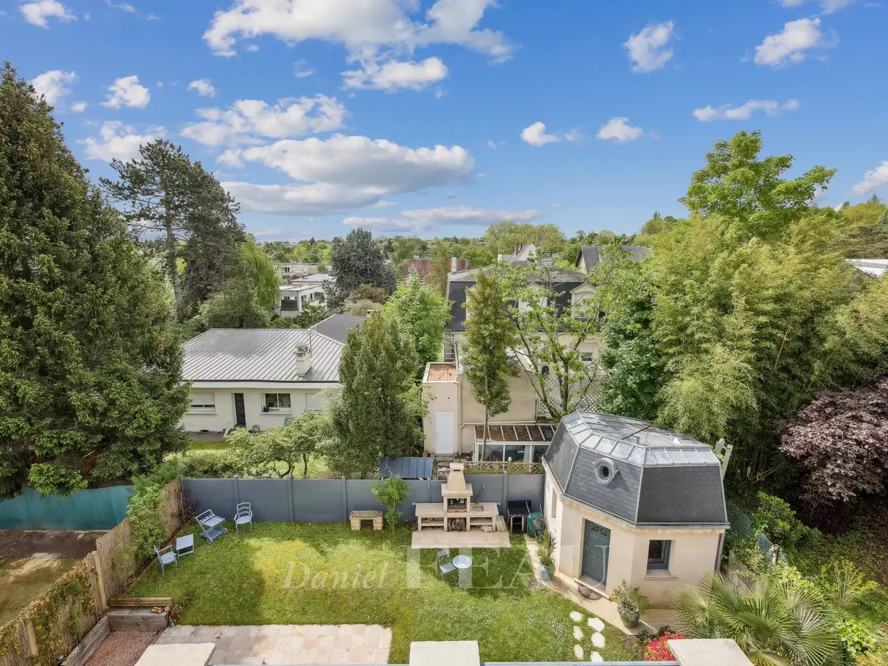 This exceptional 614 sqm mid 20th century property nestled in a cocoon of leafy greenery and benefiting from a landscaped garden is located in the sought-after Domaine de la Prairie d'Aulnay residence on the edge of the Parc de Sceaux and a few minutes from the station. 437 sqm of living space includes a spacious living/reception room with a dining room in a veranda bathed in sunshine, a kitchen with dining facilities, a spacious study and a bathroom. The 1st floor comprises two spacious suites with bath/shower rooms and a south-facing terrace. An entirely renovated split-level and self-contained loft-style apartment includes a spacious living/reception room, a dining room and open-plan kitchen opening onto a terrace, three bedrooms including a master suite with a bathroom and dressing room, and a second bathroom. Ample fitted storage space. The garden-level comprises a self-contained studio apartment. With an indoor swimming pool partially opening onto the exterior, a terrace, a caretaker’s lodge, a sauna with a shower, a utility room, a boiler room and four parking spaces. With easy access to the trunk roads and Orly Airport.