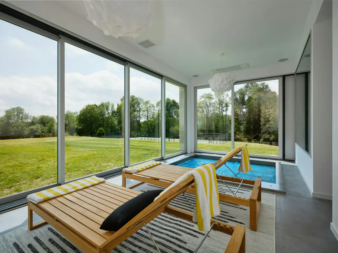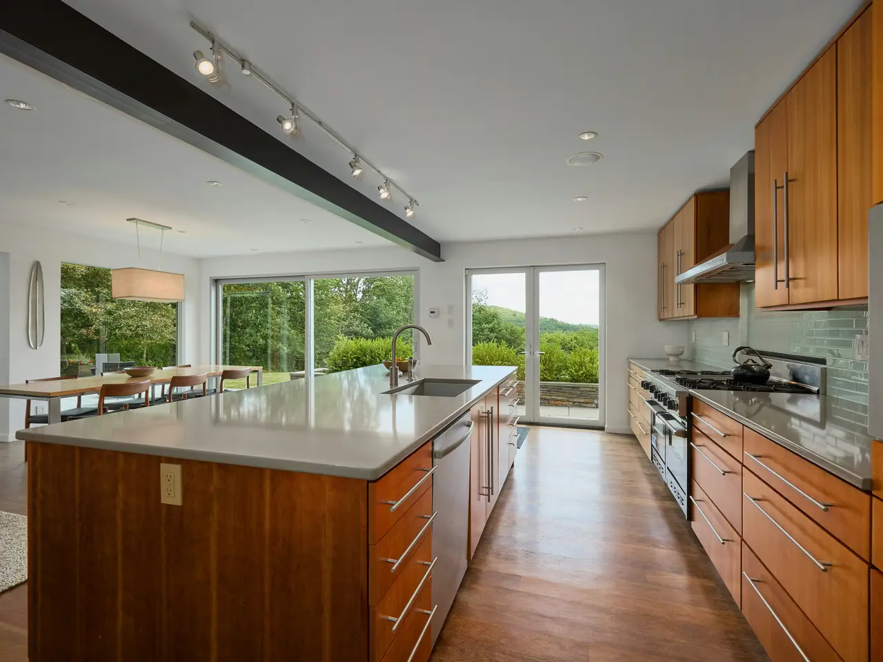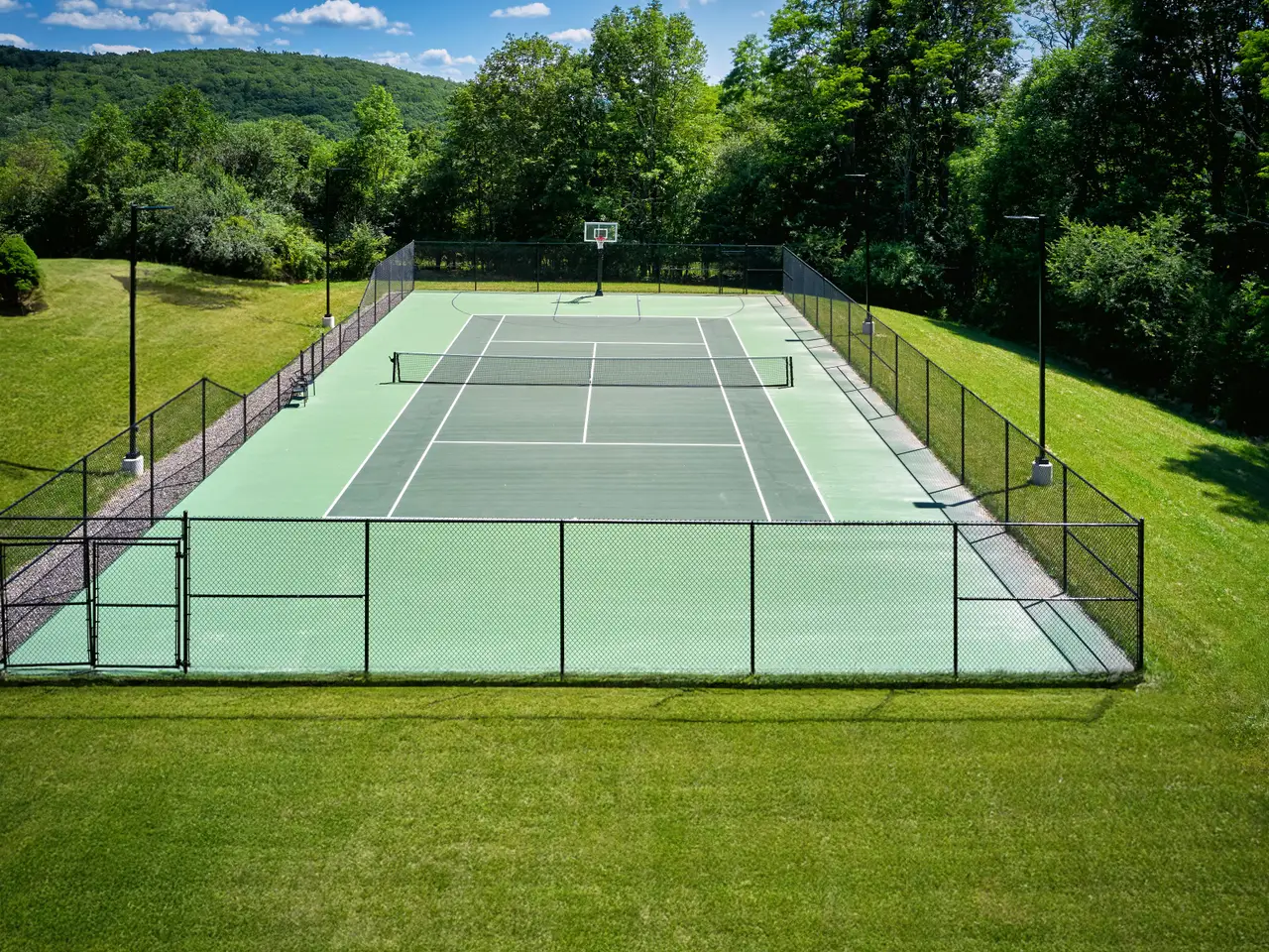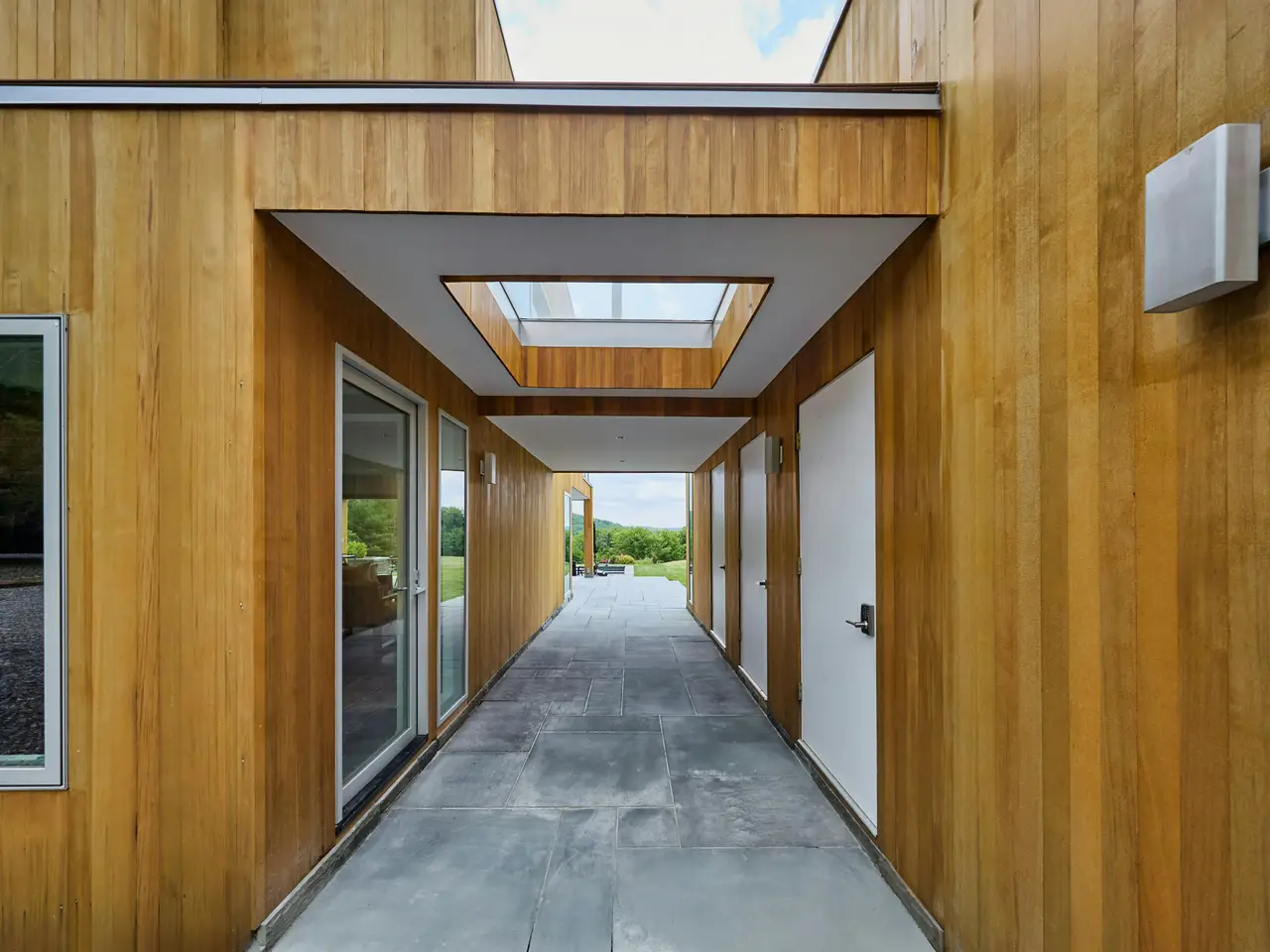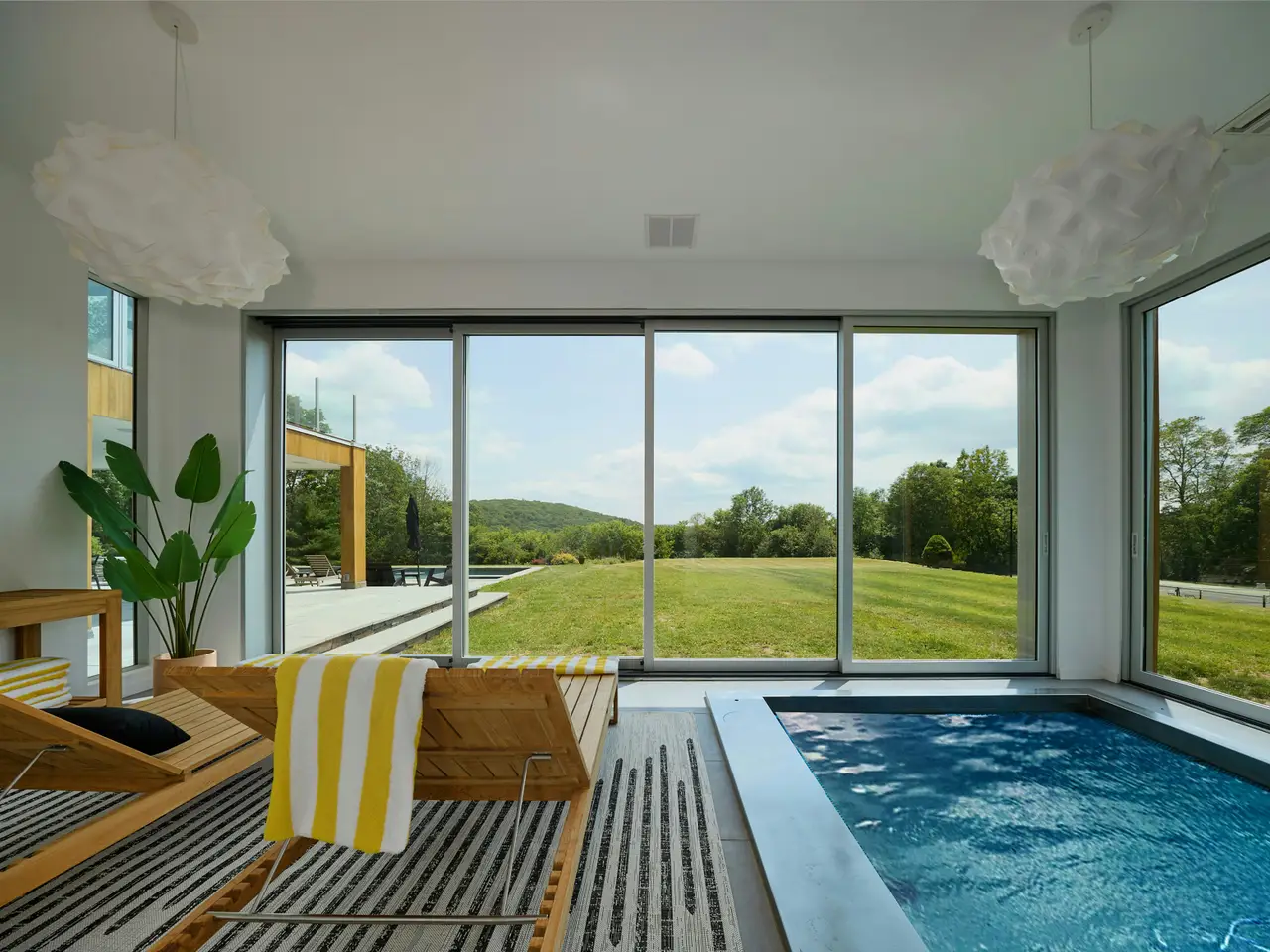 Bathed in sunlight, this graceful architectural masterwork is perfectly sited on ten private acres with awe-inspiring panoramic southern mountain views stretching endlessly, offering an ever-changing magical canvas of light and landscape. A home for all seasons, this newly re-built and expanded cedar house stands as if it rose from the landscape. A porte cochere and formal entry welcome you to a dramatic, sun-drenched living space where serenity meets sophistication. Impressive for entertaining or just for quiet reflection, the soaring ceilings, wood-burning fireplace, and walls of glass showcase each season's magic. Breathtaking views unfold throughout the home's effortless flow between interior comfort and nature's beauty. The house, wrapped to the south, east and west with 3000 sf of bluestone patios, supports a fire pit, open-air or covered dining, around the pool, and endless lounging areas. At the heart of the home, an expansive modern kitchen - with butler's pantry - opens to gracious dining and a separate living area centered around a second wood-burning fireplace. A continued wall of glass doors opens to the sweeping bluestone patios; an invitation to dine under the stars with fresh organics from the garden or savor quiet morning light. Also on the main floor is the spacious entertainment / game room that opens to a grand covered patio overlooking the heated 50 x 17 gunite pool with built-in hot tub. The truly extraordinary mudroom with main level laundry and great storage is a dream entered via your second entrance, found through an impressive architecturally beautiful breezeway. Across the breezway you will find the separately housed spa, with stainless custom hot tub, cedar sauna, shower and bath, an indoor lounge with floor-to-ceiling windows capturing the south views and west views to the floodlit Dura-Ace tennis court. The sleeping quarters include a main-floor bedroom and full bath, a second-floor primary suite with sweeping views and expansive glass doors for continued indoor-outdoor interaction with a glass-walled deck. Four additional bedrooms (or flex spaces), full bath, laundry and a bonus room - ideal for gym, studio, office or den - overlooking the main living space, or closed for privacy with a huge deck of its own, complete the second floor. Throughout the home, you will find the finest of finishes and high-end systems for comfort and efficiency. There is a whole-house grid-connected solar system and multiple electric car-charging stations.. The radiant-heated three-car garage with ample storage and work space is a dream convenience. This idyllic property is ideally located for access to all the Hudson Valley and Berkshires have to offer. Whether your passions are hiking, skiing, biking, art, shopping, yoga, theatre, or indulging in farm-to-table markets and celebrated gems or just relaxing, this rare offering in historic Old Chatham surrounded by New York's most scenic and storied countryside, Cedar Hill is the perfect home for your adventures and memories.