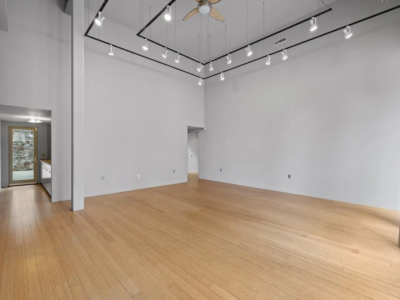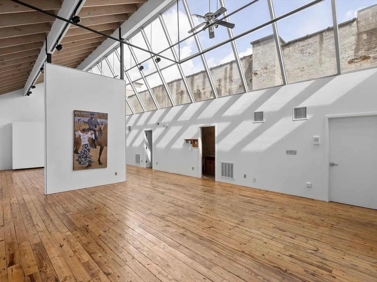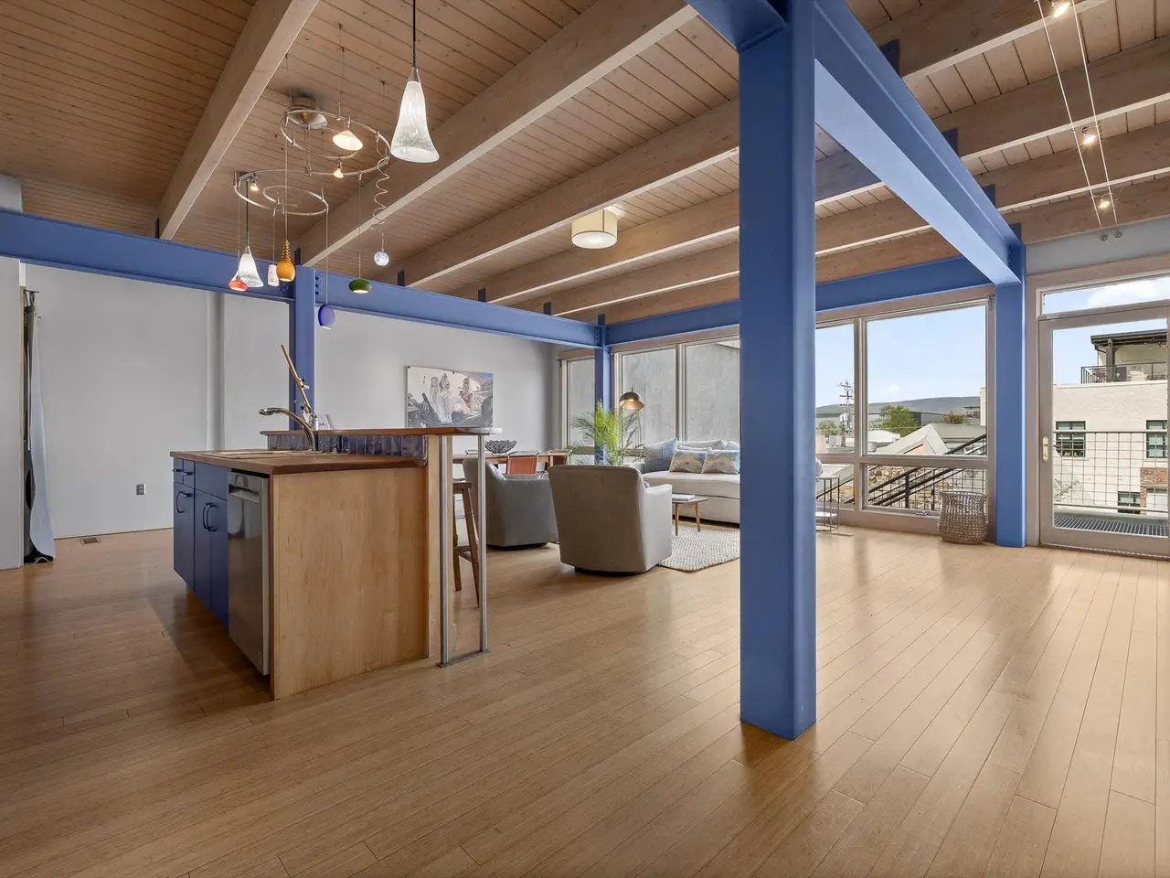 Facing Williams Street, the three-story facade has an industrial feel with a limestone and zinc exterior and a dramatic series of 10-foot doors opening into the vaulted gallery. The second level is a great room with a wall of windows and full bath. The residence is on the top floor and has an open living space with floor-to-ceiling windows highlighting the mountains.