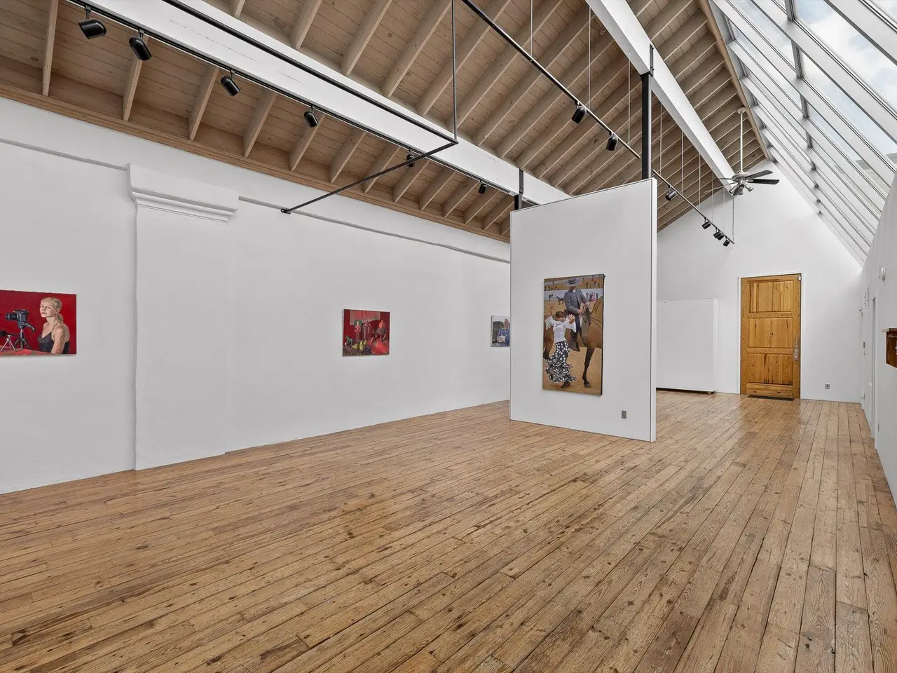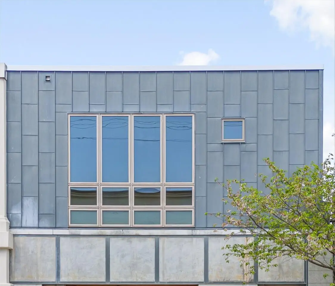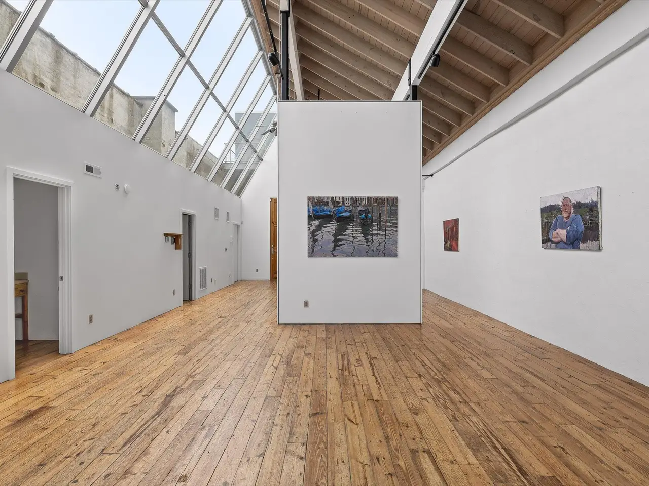 Facing Williams Street, the three-story facade has an industrial feel with a limestone and zinc exterior and a dramatic series of 10-foot doors opening into the vaulted gallery. The second level is a great room with a wall of windows and full bath. The residence is on the top floor and has an open living space with floor-to-ceiling windows highlighting the mountains.