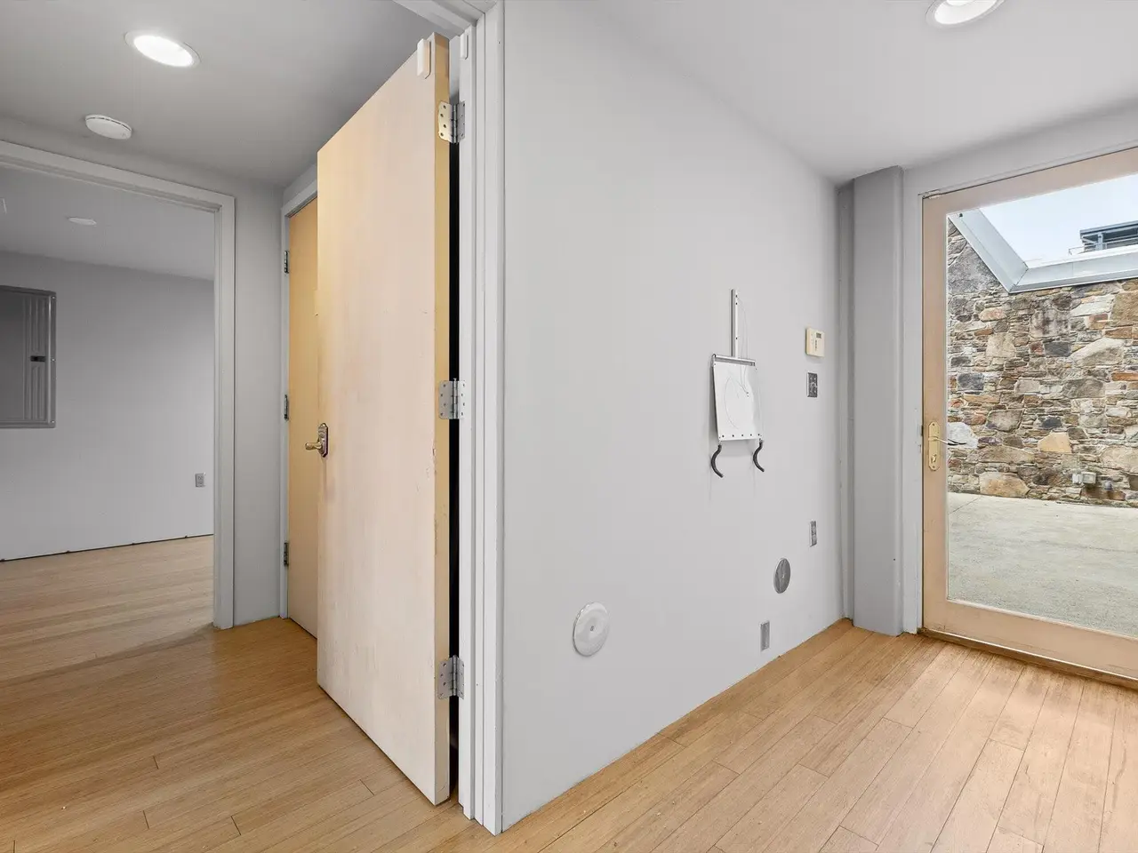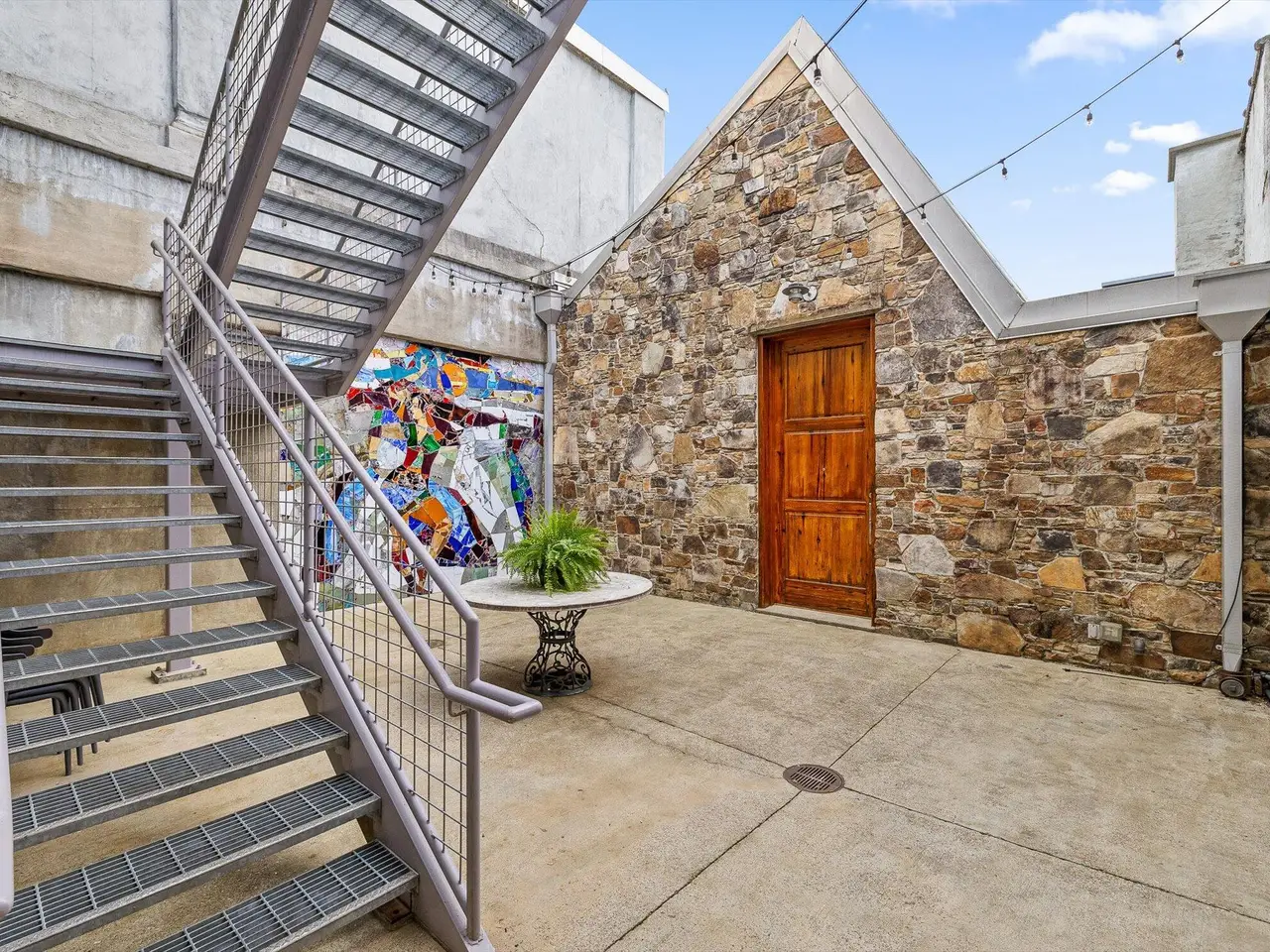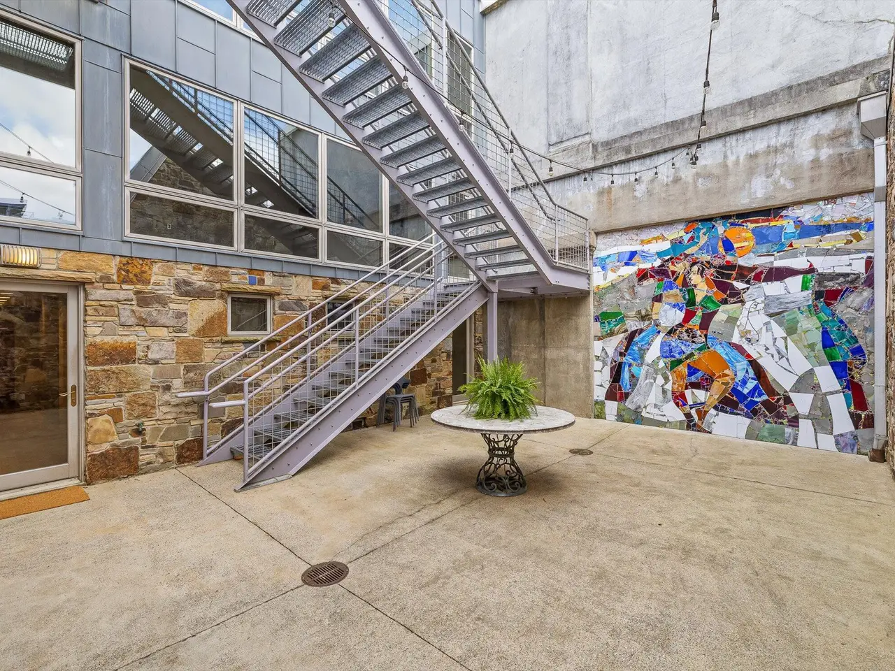 An intimate, European-inspired courtyard connects the front building with the rear studio. This courtyard features beautiful stonework as well as a mosaic mural covering the entire south wall. These mosaics, and others interspersed throughout the property, are originals created by the owners. This central space is perfect for quiet reflection or big parties (but the adjoining catering kitchen encourages entertaining)