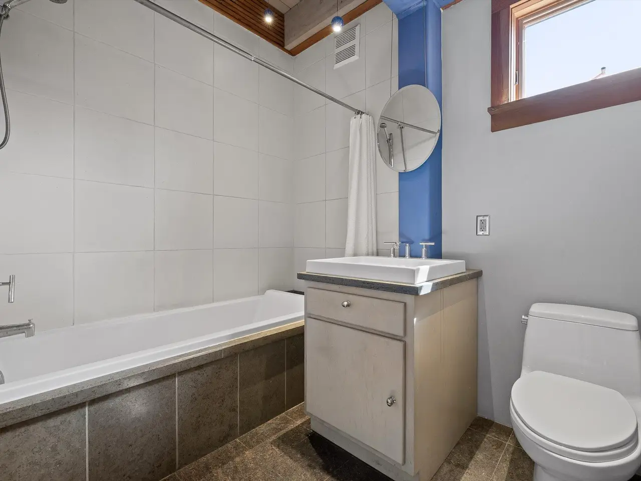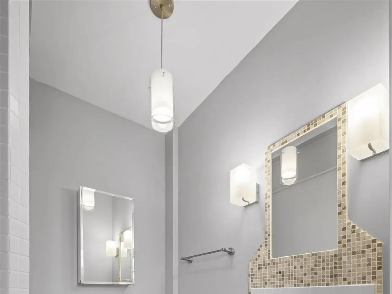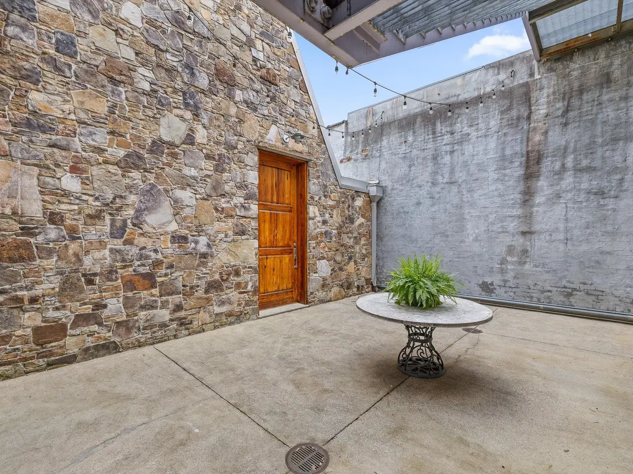 An intimate, European-inspired courtyard connects the front building with the rear studio. This courtyard features beautiful stonework as well as a mosaic mural covering the entire south wall. These mosaics, and others interspersed throughout the property, are originals created by the owners. This central space is perfect for quiet reflection or big parties (but the adjoining catering kitchen encourages entertaining)