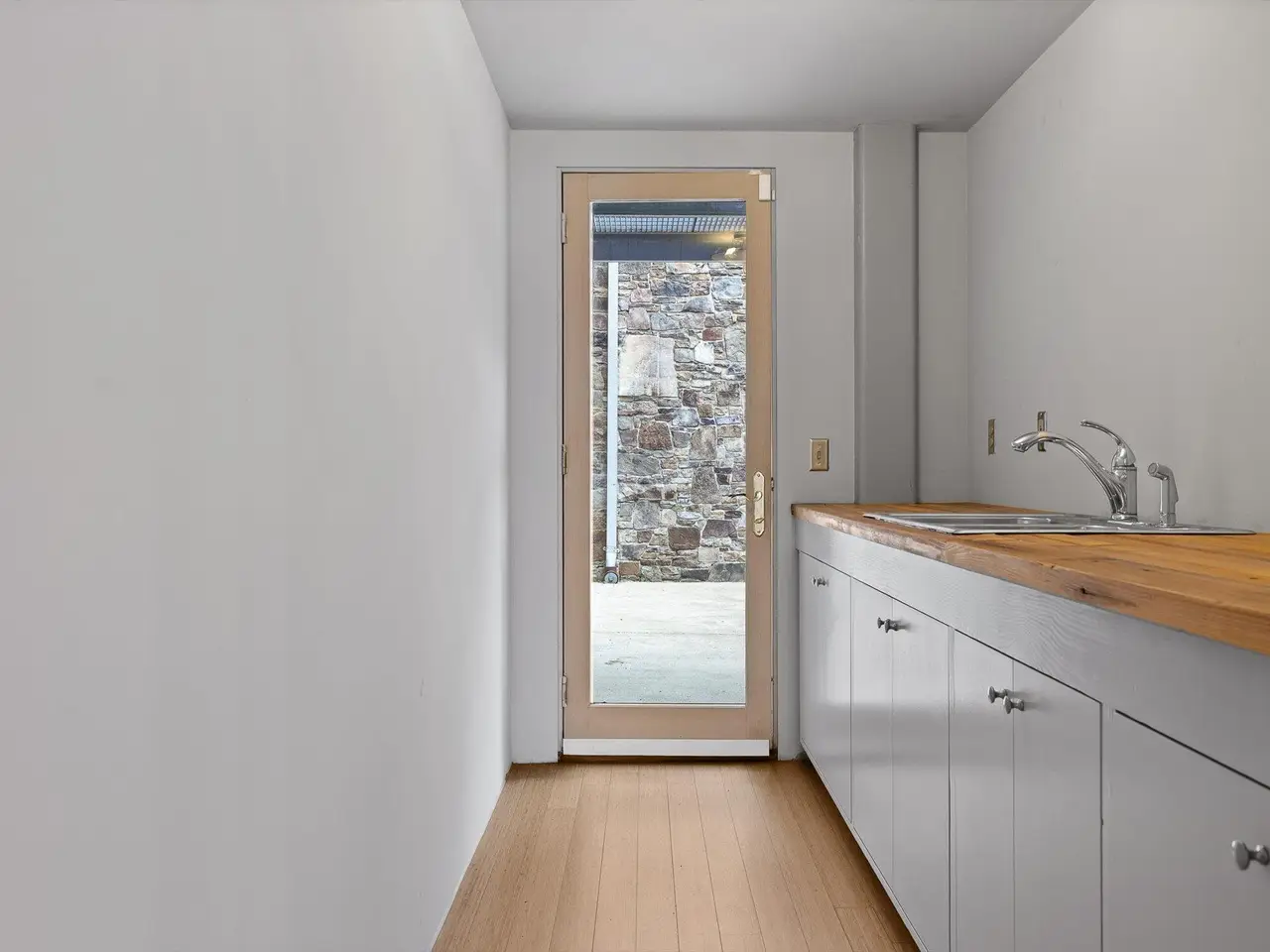 The rear building, a large rectangular studio bathed in light, was inspired by the artist Constantin Brancusi's Parisian studio. This magical, creative space is constructed with locally-quarried stones, salvaged pine floors, 10-foot heart pine doors, and most strikingly, rows of angular, north-facing windows.
