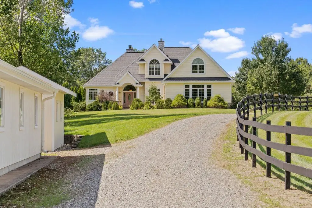 Beautiful country home on 55 acres for sale near historic Chelsea, MI. Custom built in 2007, this stunning house is situated atop a hill overlooking a 1/4 acre spring fed pond and hundreds of acres of high quality nature preserves. Scenic views throughout the home advertise the true beauty of this incredible property. With peaceful areas of woodland, pastures, marsh, fen and field, this is a nature lover's paradise! Step inside this small country estate and you will be enamored by the craftsmanship and attention to detail. Complete with 4 bedrooms and 3 full baths, this home boasts nearly 3,400sq/ft of finished living space. Walking through the front entry, there is a tiled foyer with storage closet, as well as a small family room/den with gas fireplace. The spacious primary level master suite offers comfort and convenience, with 2 walk in closets and a master bath complete with bubble tub and walk-in shower. The living room has cathedral ceilings, large bay windows, a marble-tiled wood burning fireplace, and an open floor plan that flows seamlessly into the kitchen and dining area. The charming kitchen has granite counter tops, cherry stained wood cabinets, stainless steel appliances and double French doors leading out to the 1,200sqft composite deck. Just around the corner is an elegant "butler style" room with utility sink, laundry closet, and full bathroom. This leads out to the 2-1/2 car garage that is fully insulated and heated/cooled. The cherry wood staircase takes you up to the second floor complete with the remaining 3 bedrooms and full bath. The walkout basement with french doors offers another whole living area. This finished space has 9' ceilings, a large family room, library, office space, and 2 storage closets. The utility room houses a 3 zone furnace, large hot water heater, full house vacuum, and is plumbed for additional bathroom. The property also comes with a large tobacco style pole barn that features a workshop, horse stalls, and a partially finished studio apartment with full kitchenette, bathroom, stacked laundry and pantry. Additionally, there is a garden shed and chicken coop with fenced in run. Conveniently located just 4 miles from downtown Chelsea, 16 miles from Ann Arbor, and just minutes away from the Waterloo Recreational area, this unique property offers the perfect blend of country living and accessibility. Exceptional location and incomparable views truly make this home one of a kind. Property sale includes 2 parcels. F-06-28-100-027 & F-06-28-100-028. 50 acre parcel is under conservation easement with the Washtenaw County Parks and Recreation Department.