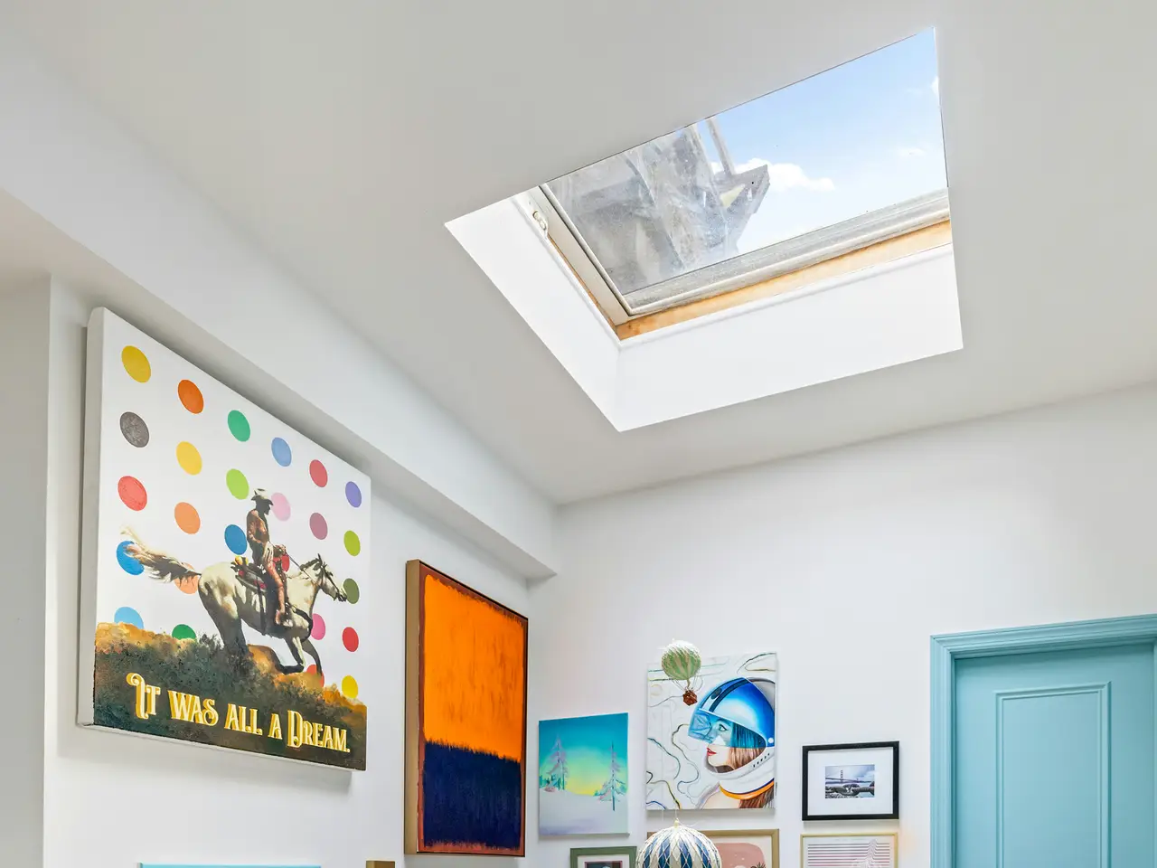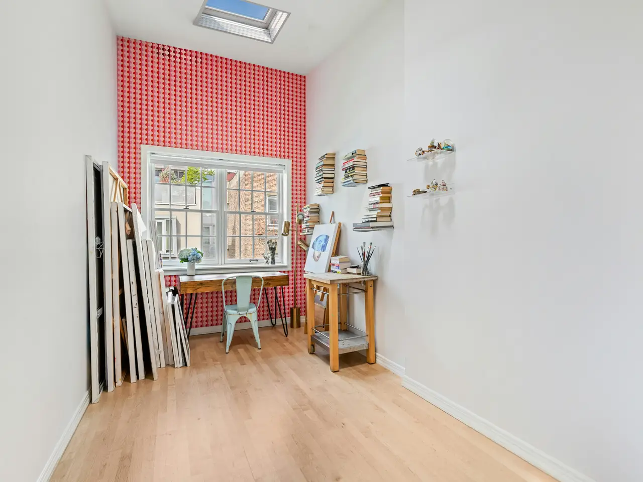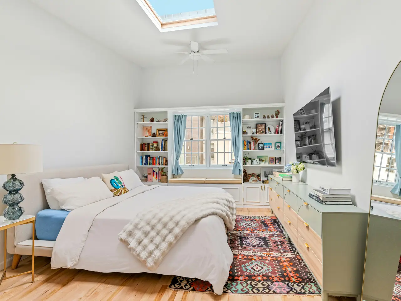 Charm doesn't even begin to describe this sun-drenched duplex with large balcony and ROOF RIGHTS on one of Chelsea's most picturesque blocks. Thoughtfully restored and elevated with authentic vintage details and designer upgrades, this bright and airy residence spans two floors. Enter the main level and you're greeted by 9-foot ceilings, wide-plank diagonal maple floors, and steady northern light pouring in through French doors that open to a large, treetop balcony - perfect for morning coffee or golden hour wine. The living and dining area is anchored by a proper wood-burning fireplace and a sculptural staircase illuminated by a skylight overhead. The large open kitchen features a one-of-a-kind, original porcelain-glazed sink, vintage brass hardware, new marble countertops, a warming drawer, large pantry, counter seating, and high-end stainless appliances, including a Sub-Zero fridge. A full bathroom with a step-in shower honors the period details of the home while providing modern comfort. Upstairs, a curved solid wood staircase leads to the second floor with soaring 11'6" ceilings and three skylights - one in each room. The primary bedroom is oversized and bright, with a cozy window seat and room for a super-king bed plus a desk or reading nook. The second bedroom, currently used as an art studio, fits a queen bed and additional furnishings, plus its own walk-in closet. A beautiful second full bathroom - worthy of a five-star hotel - features an XL soaking tub, linen closet, and deep under-tub storage, completing the upstairs layout. Additional features include a brand-new side-by-side washer/dryer, maple flooring throughout, a private storage unit and abundant closet space. Located just minutes from Whole Foods, Chelsea Market, Eataly, the High Line, Hudson Yards, the Whitney, and the Meatpacking District, this is a rare opportunity to own a character-rich, design-forward duplex in one of New York's most iconic neighborhoods. This boutique, self-managed coop is pet-friendly, allows rentals and pieds-à-terre, and includes a laundry room.