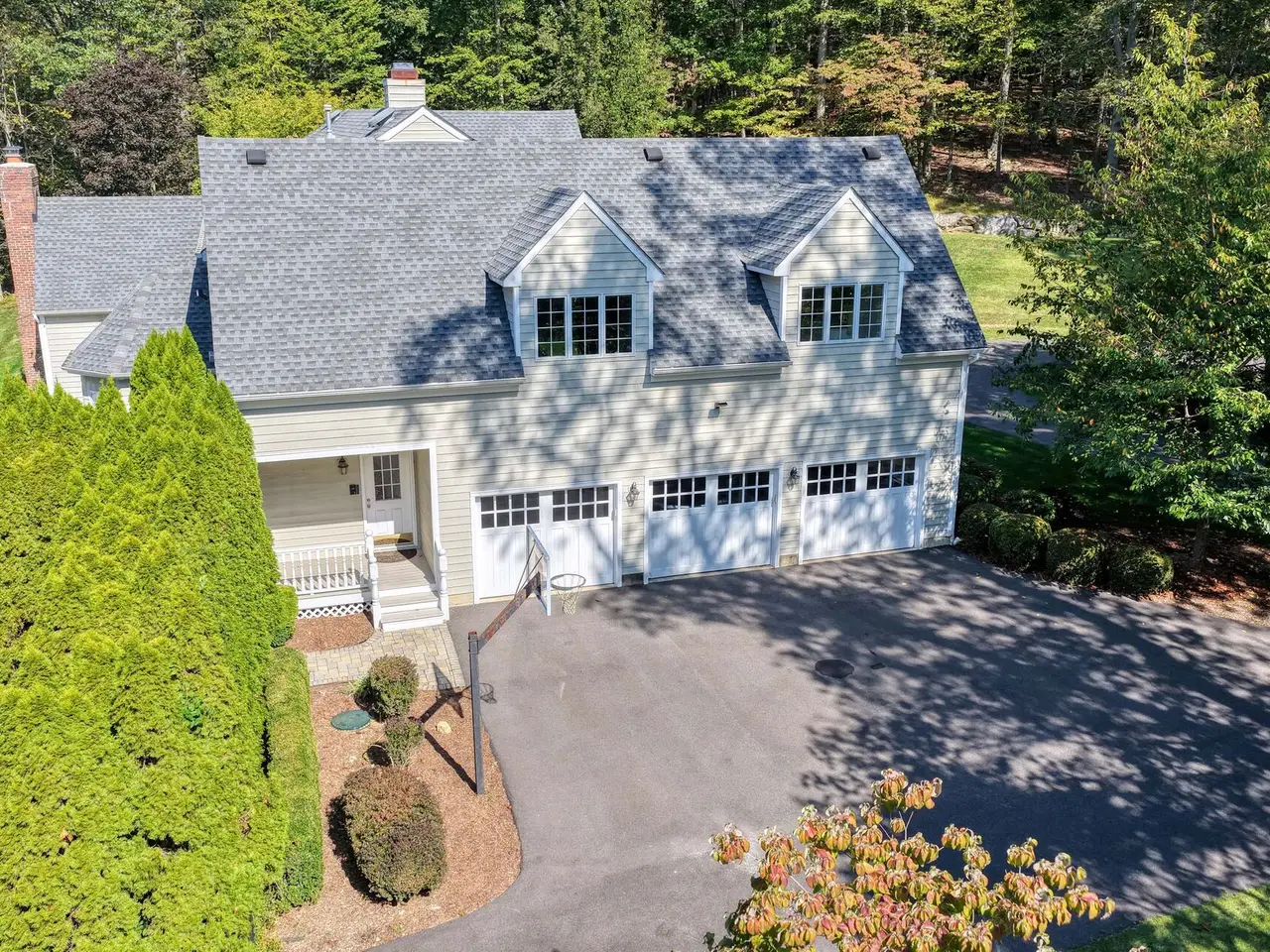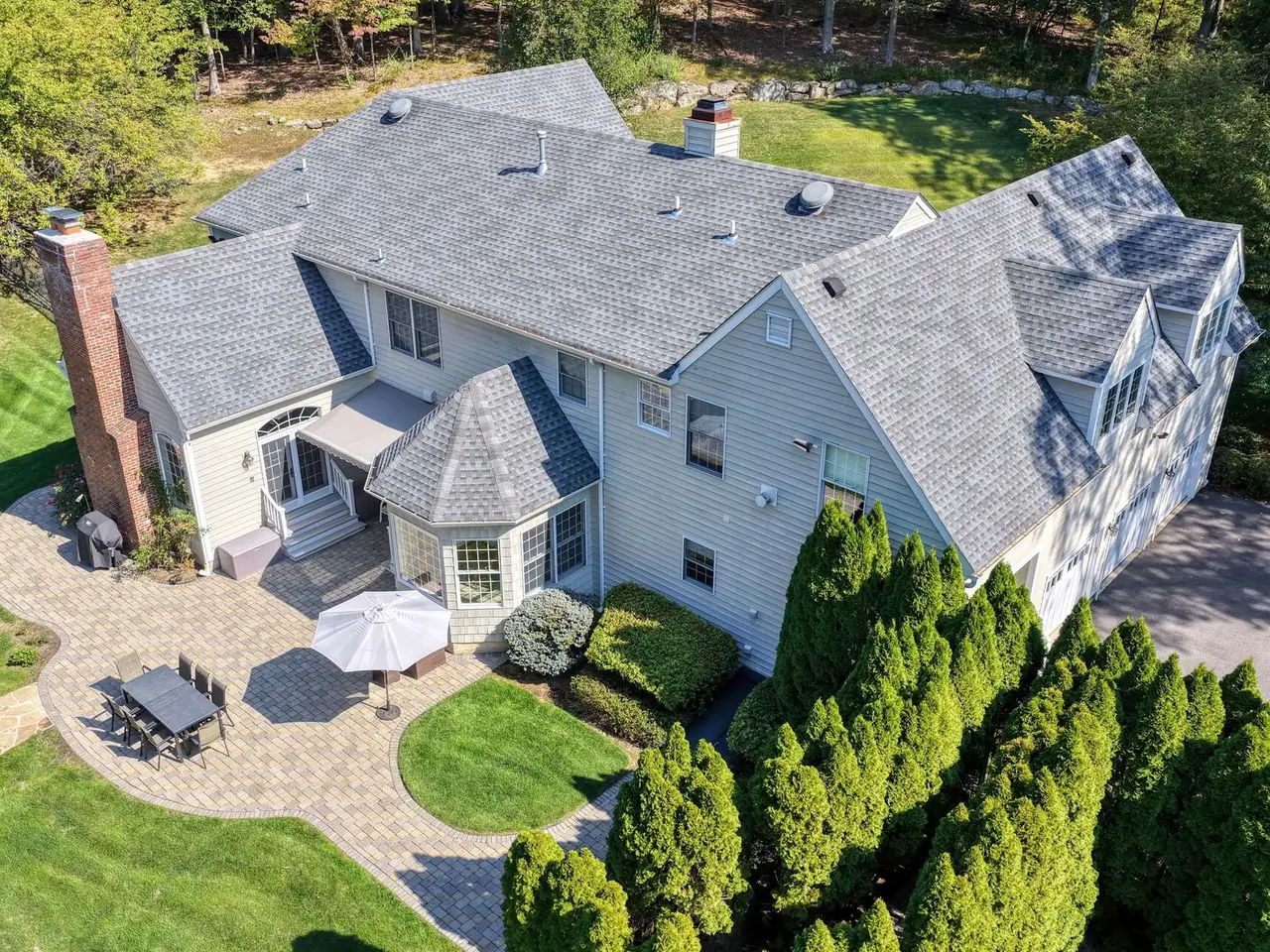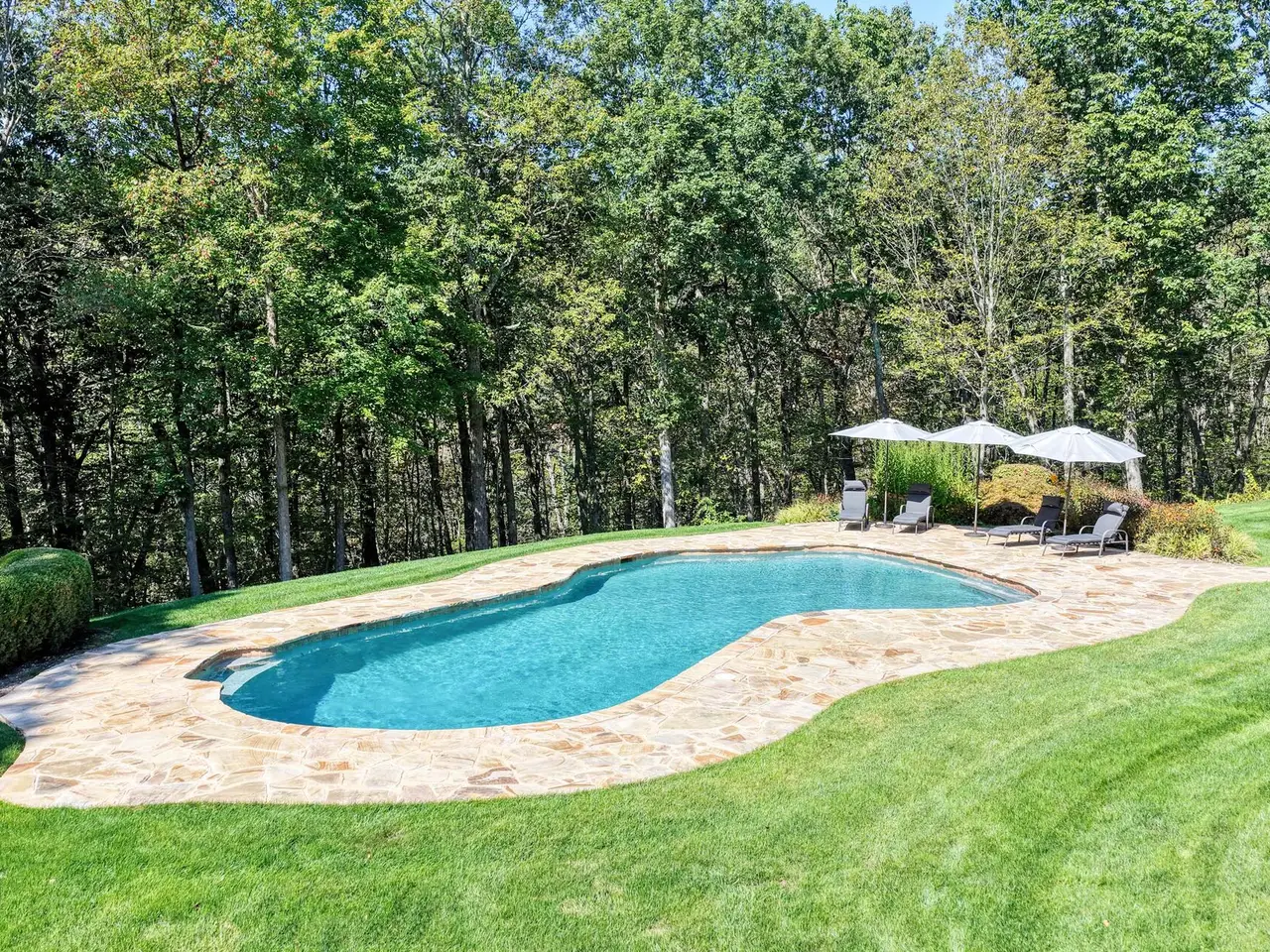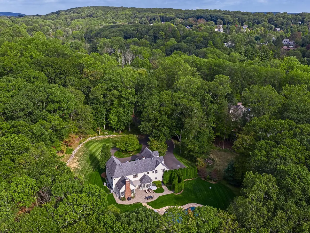 Privately sited on a quiet cul-de-sac, this striking stone and cedar residence, complemented by a three-car garage, is gracefully set on 5+ acres of manicured grounds surrounded by conservation land for lasting privacy. From the circular drive, the property unfolds to a backyard paradise with a saltwater pool, Tennessee sandstone patios, and deer fencing that preserves the landscaping's beauty. Inside, a two-story foyer opens to the formal dining and living rooms, enhanced by French doors and custom millwork. The expansive kitchen, breakfast room, and family room form the heart of the home, where walls of windows and a soaring fieldstone fireplace create warmth and connection to the outdoors. A mudroom with laundry, informal powder room, and back staircase ensure convenience. Upstairs, the primary suite offers a sitting area with gas fireplace, dual walk-in closets, and a spa-like bath. Two bedrooms share a Jack-and-Jill bath, with two more bedrooms and another full bath completing the level. The versatile lower level provides recreation space, a wine closet, half bath, storage, and direct walk-out access to the backyard. Backing to the 160-acre MacGregor Preserve with access to Chester's thousands of acres of parkland, hiking trails, equestrian facilities, and sports clubs, this location blends rural tranquility with commuter convenience, just minutes from farm stands, shopping, dining, award-winning schools, and Midtown Direct trains.