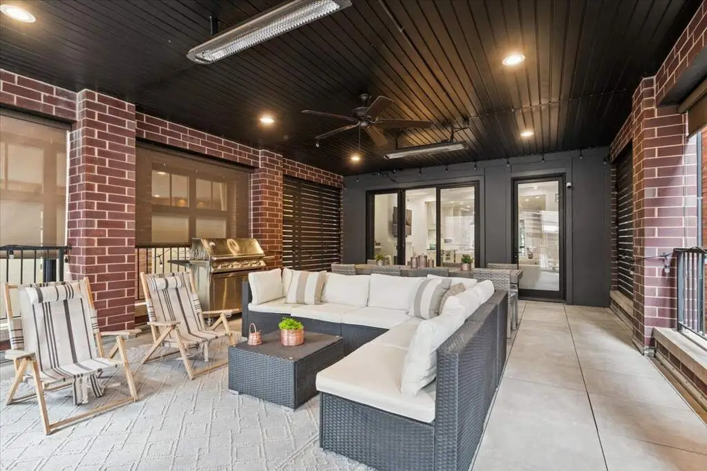 Outdoor covered patio with gas-powered fireplace