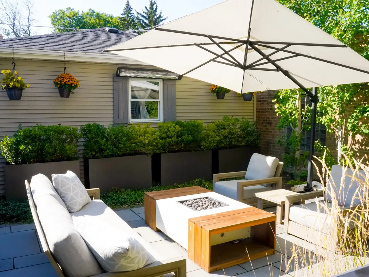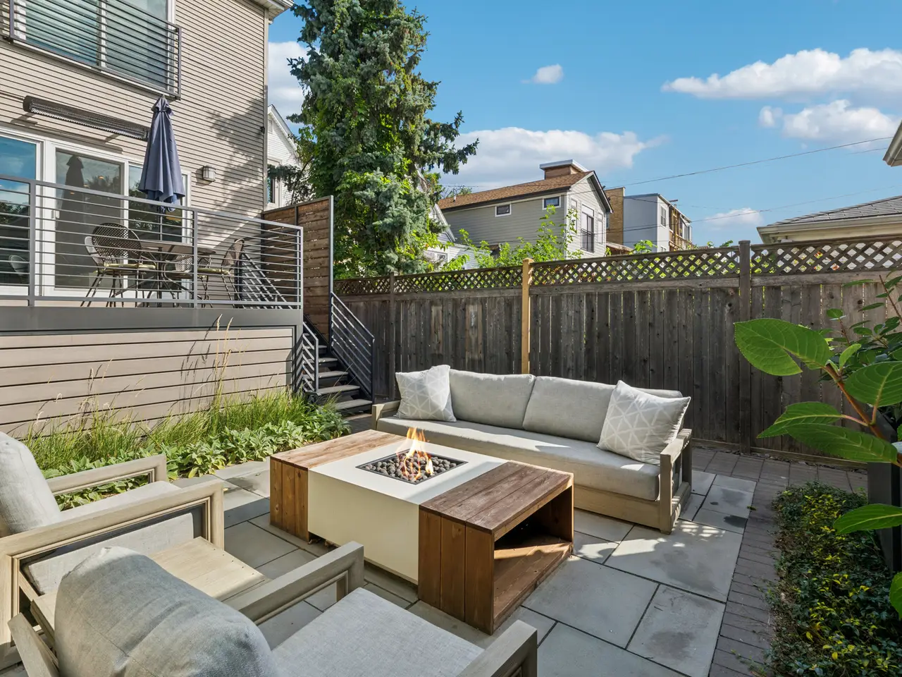 Blue-gray limestone patio with gas fire table