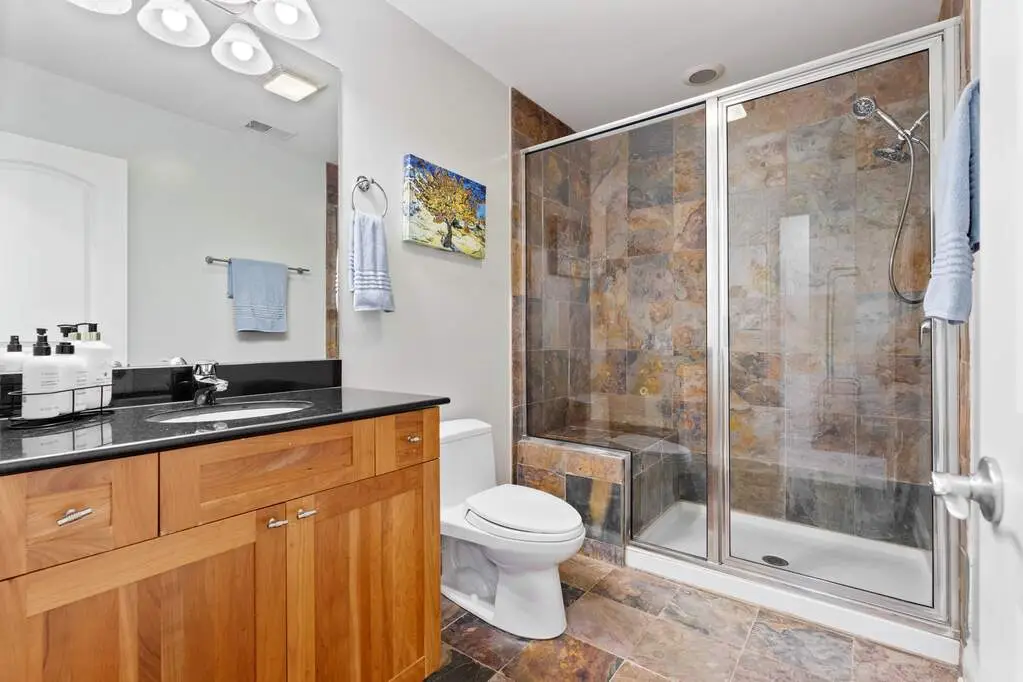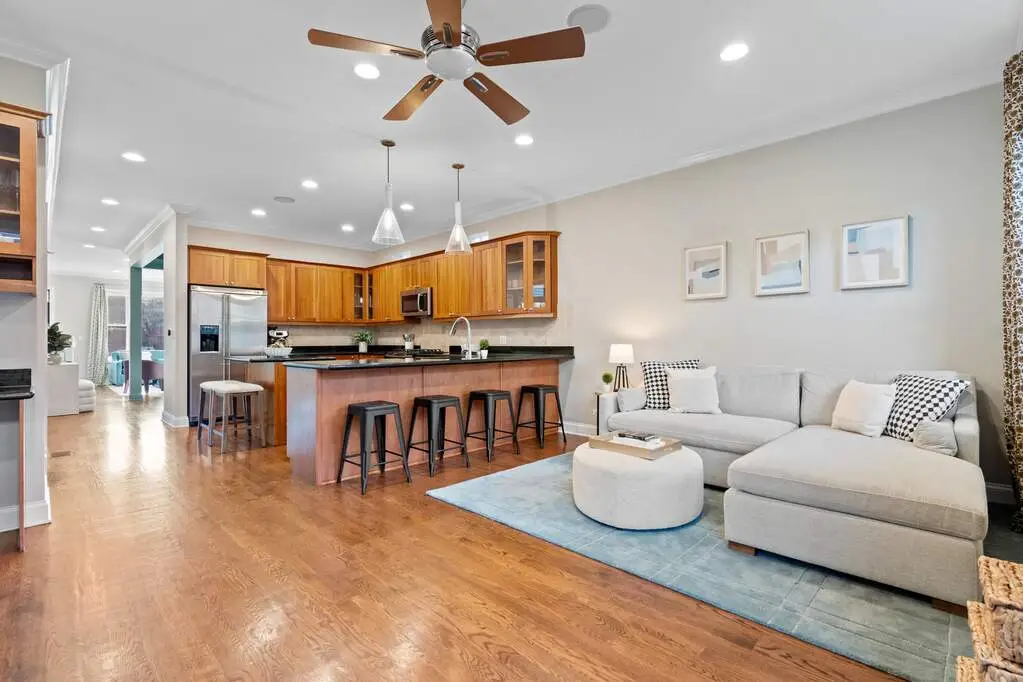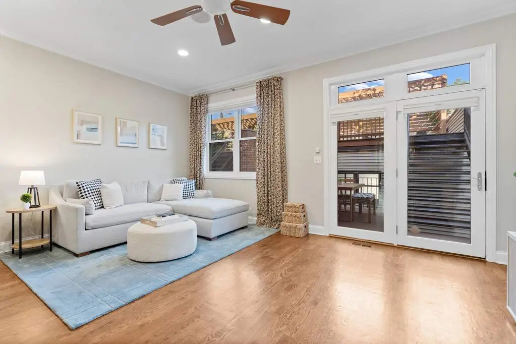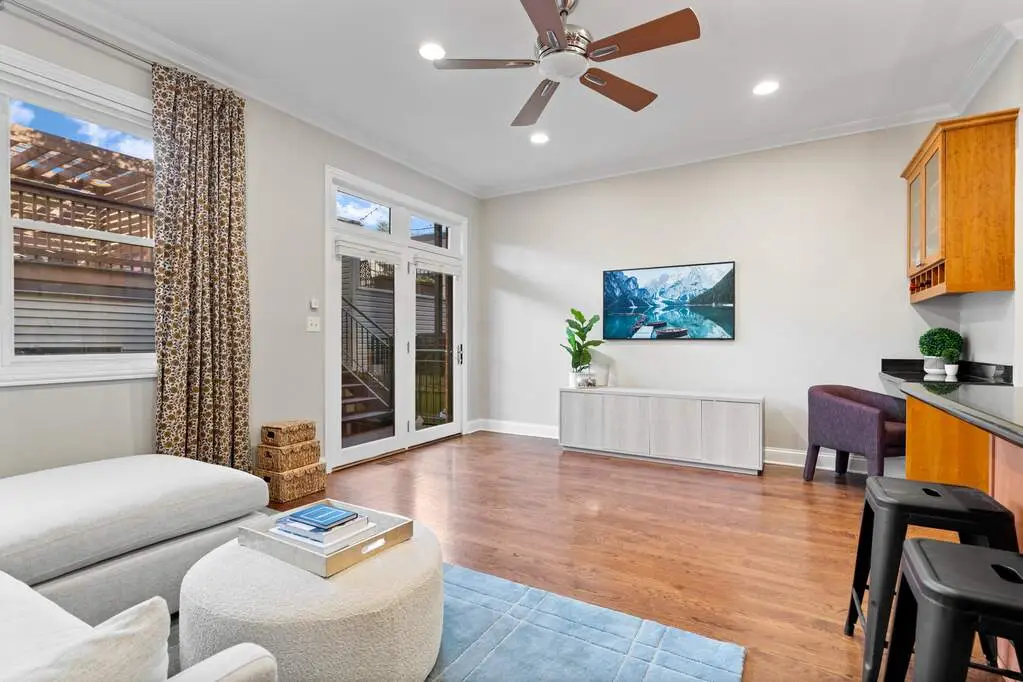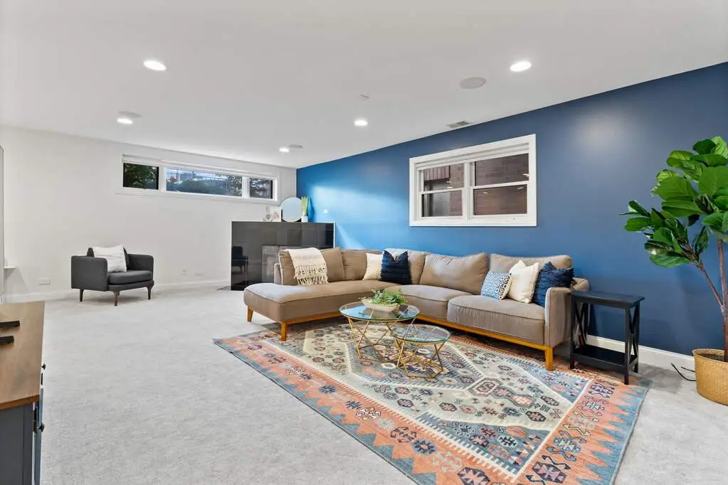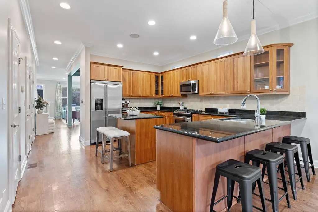 Perfectly positioned in the heart of Bucktown, directly across from Holstein Park, this stunning 4-bedroom, 3.1-bath full masonry home offers the ideal blend of elegance, comfort, and city convenience. Step inside to a sun-drenched living room highlighted by a charming picture window overlooking the park and a cozy wood-burning fireplace, seamlessly flowing into a sophisticated dining area. The chef's kitchen is designed for both everyday living and entertaining, featuring abundant cabinetry, a full pantry, expansive counter space, an eat-in breakfast bar, and a central island that opens into the spacious family room. Sliding glass doors extend the living space outdoors to a large Trex deck-ideal for grilling and al fresco dining-with stairs leading up to a beautifully appointed garage roof deck with pergola. Upstairs, discover three bright bedrooms, including a luxurious primary suite with generous closets and a spa-inspired bath boasting a soaking tub, oversized shower, dual vanities, ample storage, and natural light from a skylight. The two additional bedrooms share a thoughtfully designed bathroom with double sinks and a separate shower/toilet area. The lower level offers exceptional versatility with a sprawling recreation room, gas fireplace, built-in bar with wine fridge, storage closets galore, and space for relaxing or entertaining. A fourth bedroom with a full bath makes an ideal guest suite or home office. Additional highlights include a large laundry room, grand mud area, irrigated front lawn and a two-car garage. Enjoy the vibrant Bucktown lifestyle just outside your door, with Holstein Park's pool, playground, and green spaces serving as an extension of your backyard, plus easy access to the Blue Line for seamless commuting.