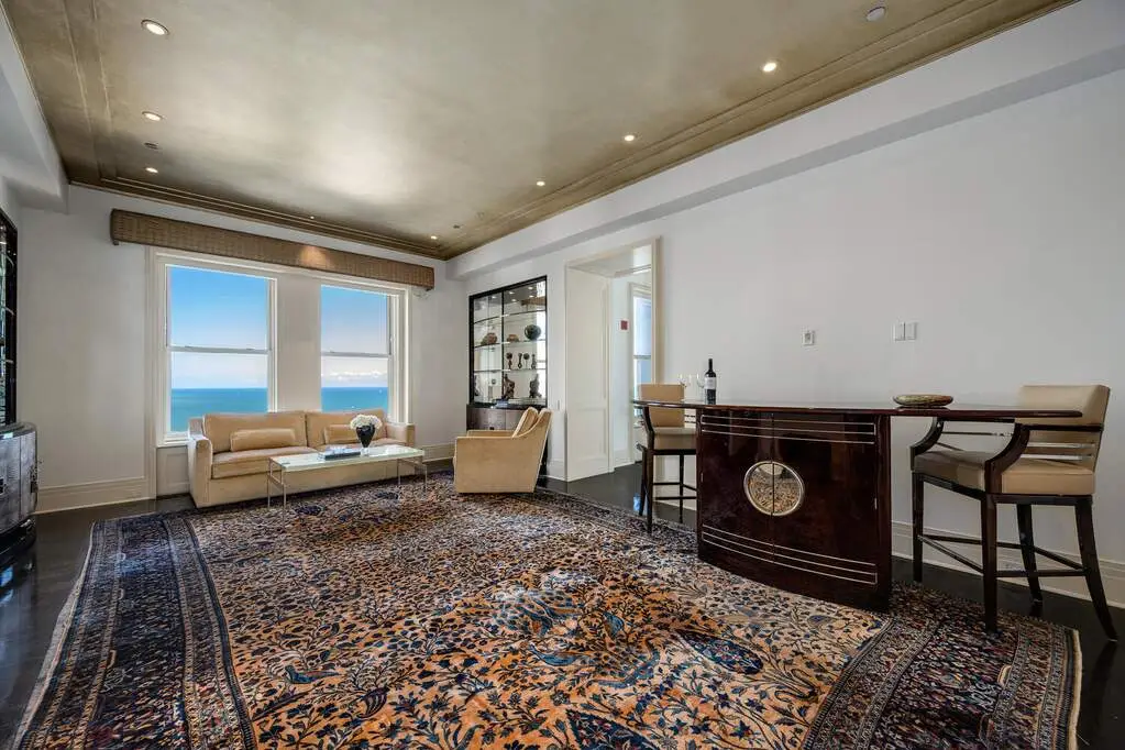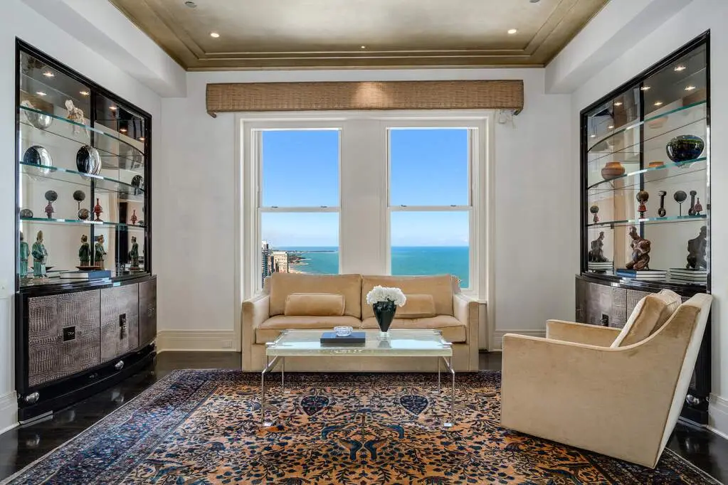 Exquisitely appointed and thoughtfully designed, this 4,700+ square foot full-floor residence on the 34th floor of the iconic Palmolive is not to be missed. Featuring three ensuite bedrooms plus a dramatic corner office/den, along with 3.1 baths, this home offers both scale and sophistication. With graciously proportioned rooms and refined detailing throughout, it lives like a single-family home in the sky ideal for displaying art while capturing sweeping lake and city views. Your private elevator opens directly into an elegant foyer with herringbone floors, leading to a gallery corridor, the perfect setting for showcasing an art collection and setting the tone for the timeless design within. Bathed in natural light, the formal living and dining spaces are perfectly suited for both grand entertaining and intimate gatherings. At the northeast corner, a showstopping office/den wrapped in luxurious wood and anchored by a fireplace with a striking art deco surround provides corner windows and panoramic views of the lake and skyline an inspiring setting for work or retreat. The eat-in kitchen is a chef's dream, appointed with Wolf, Sub-Zero, and Thermador appliances, granite countertops and backsplash, a butler's pantry, and custom cabinetry, all overlooking Lake Michigan. The primary suite spans the west wing and offers a true private sanctuary. A sitting room at the entry serves as a versatile retreat, while the bedroom itself boasts sparkling northwest corner views. The spa-like ensuite bath includes a Whirlpool tub, separate shower, private commode, double sinks, separate vanity, and east-facing lake views. A custom dressing room completes the suite, with exposures down Michigan Avenue. Two additional bedrooms, both with ensuite baths and excellent closet space, round out the private quarters. A powder room, laundry room, and ample storage further enhance the home. The Palmolive Building offers world-class amenities: 24-hour door staff, onsite manager and engineer, gym, Whirlpool, steam room, and the Beacon Club party room. An onsite valet garage is available, with parking rights for two cars included in the price.