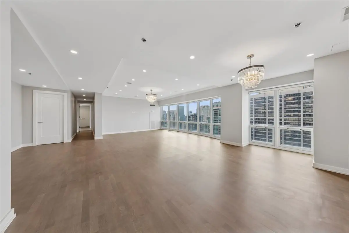 STUNNING RENOVATION has an open, harmonious layout with well-proportioned rooms designed for everyday living and entertaining! Spacious and sun-drenched on a high floor with sweeping west, north, and south views from every floor-to-ceiling window, this beautifully designed 3 bedroom, 2.5 bath residence (3rd BR currently used as Family Room/Office) exudes modern elegance and meticulous attention to detail. Wide plank flooring, custom glass pocket doors, designer lighting, and premium finishes create a seamless blend of sophistication and livability. The gourmet kitchen impresses with island seating, abundant custom cabinetry, high-end appliances, and a wine refrigerator - perfect for entertaining. Distinctive bath materials, integrated sound system, in-unit washer/dryer, and whole-home humidification add comfort and convenience. Heat and air conditioning included (electric for blower). Luxury building in an ideal location - steps from Michigan Avenue's Magnificent Mile shopping, dining, and transportation, this building offers superb service, fitness center, indoor pool, on-site dry cleaners, and valet or self parking for a fee. Don't miss this opportunity to enjoy this impeccable residence offering outstanding value in Chicago's most desirable neighborhoods! ***(NOTE: This floorplan (2100sf) is larger than the ""01"" tier units above the 39th floor).