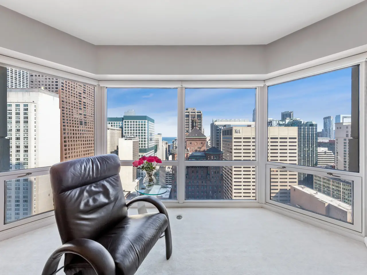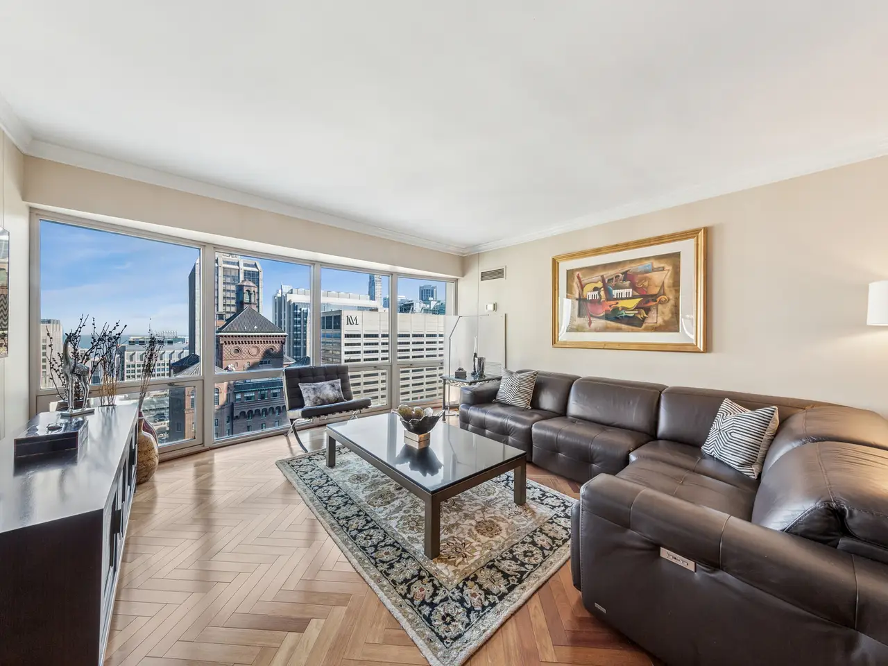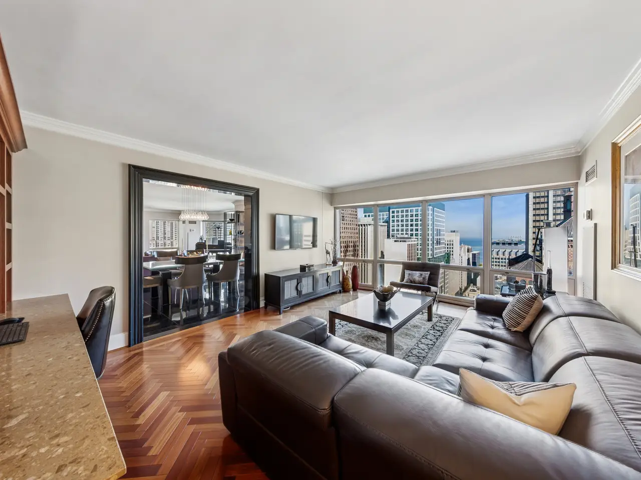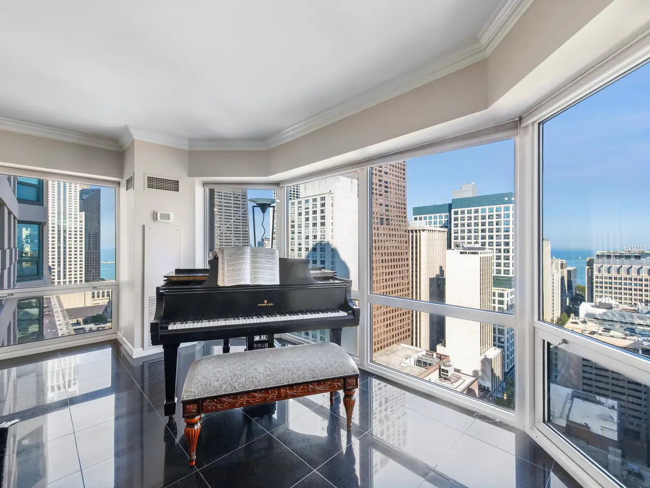 Live above it all - Stunning 2300+ square feet Residence with Panoramic Views. Experience luxury living with incredible views of lake, iconic architecture and exciting sky line just off the beautiful Mag Mile. This home offers a well-designed space with an elegant foyer that flows into an expansive living and dining room. Enjoy East, North, South and Lake views from large bay windows. Recently renovated open kitchen with stylish custom cabinets, quartz countertops and backsplash, high end appliances, and breakfast bar. This home has been thoughtfully designed. Den/family room has attractive built-ins and lovely wood floors. This room can easily be transformed into a 3rd bedroom. Spacious primary bedroom has bay windows with city and lake views plus two walk-in closets. Primary bath with separate tub, tastefully tiled oversized shower, and abundant storage. Home has 2 full baths and powder room. Features include moldings, window treatments, power shades, wood and granite floors. Premier building in excellent location. Amenities include 24-hour doorman, management on-site, 24-hour maintenance, 2 exercise rooms, sauna, indoor pool, free coffee station, common terrace, party room, conference room & extra storage. Lease garage spaces with EV stations. Close to Lake, Parks, Restaurants, Museums, and Shopping on the Magnificent Mile.