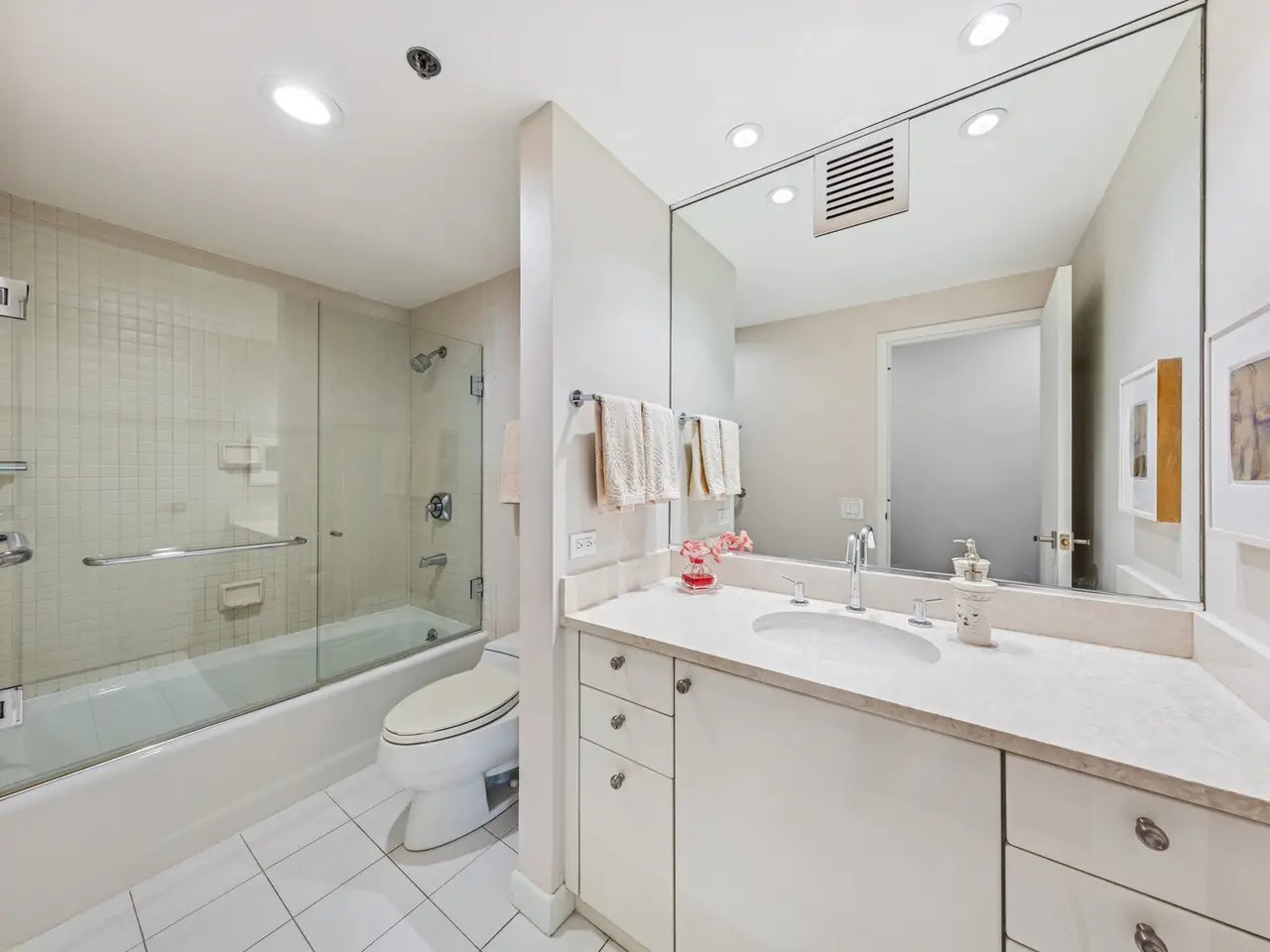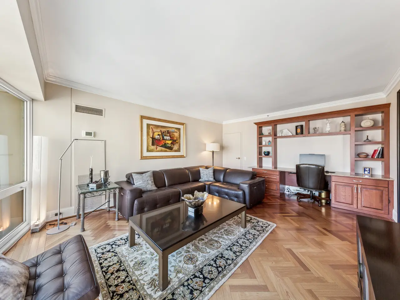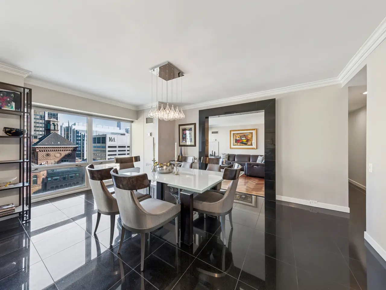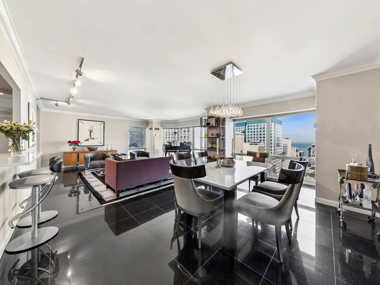 Live above it all - Stunning 2300+ square feet Residence with Panoramic Views. Experience luxury living with incredible views of lake, iconic architecture and exciting sky line just off the beautiful Mag Mile. This home offers a well-designed space with an elegant foyer that flows into an expansive living and dining room. Enjoy East, North, South and Lake views from large bay windows. Recently renovated open kitchen with stylish custom cabinets, quartz countertops and backsplash, high end appliances, and breakfast bar. This home has been thoughtfully designed. Den/family room has attractive built-ins and lovely wood floors. This room can easily be transformed into a 3rd bedroom. Spacious primary bedroom has bay windows with city and lake views plus two walk-in closets. Primary bath with separate tub, tastefully tiled oversized shower, and abundant storage. Home has 2 full baths and powder room. Features include moldings, window treatments, power shades, wood and granite floors. Premier building in excellent location. Amenities include 24-hour doorman, management on-site, 24-hour maintenance, 2 exercise rooms, sauna, indoor pool, free coffee station, common terrace, party room, conference room & extra storage. Lease garage spaces with EV stations. Close to Lake, Parks, Restaurants, Museums, and Shopping on the Magnificent Mile.