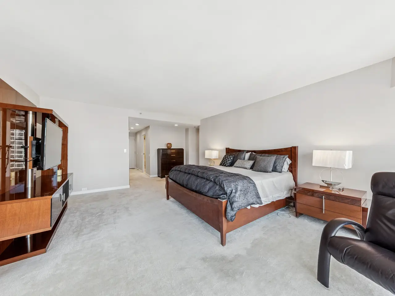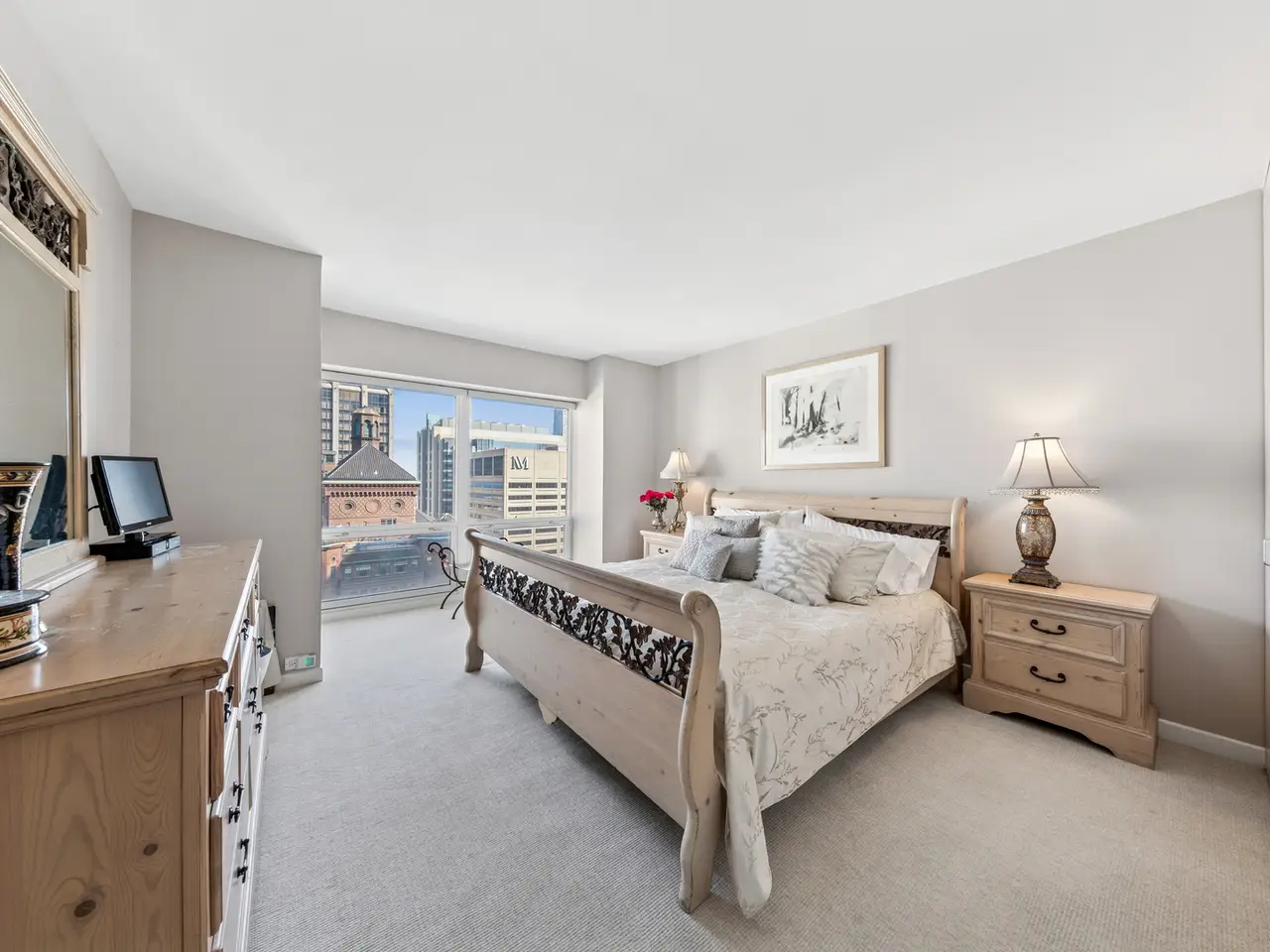 Spacious primary bedroom with bay windows