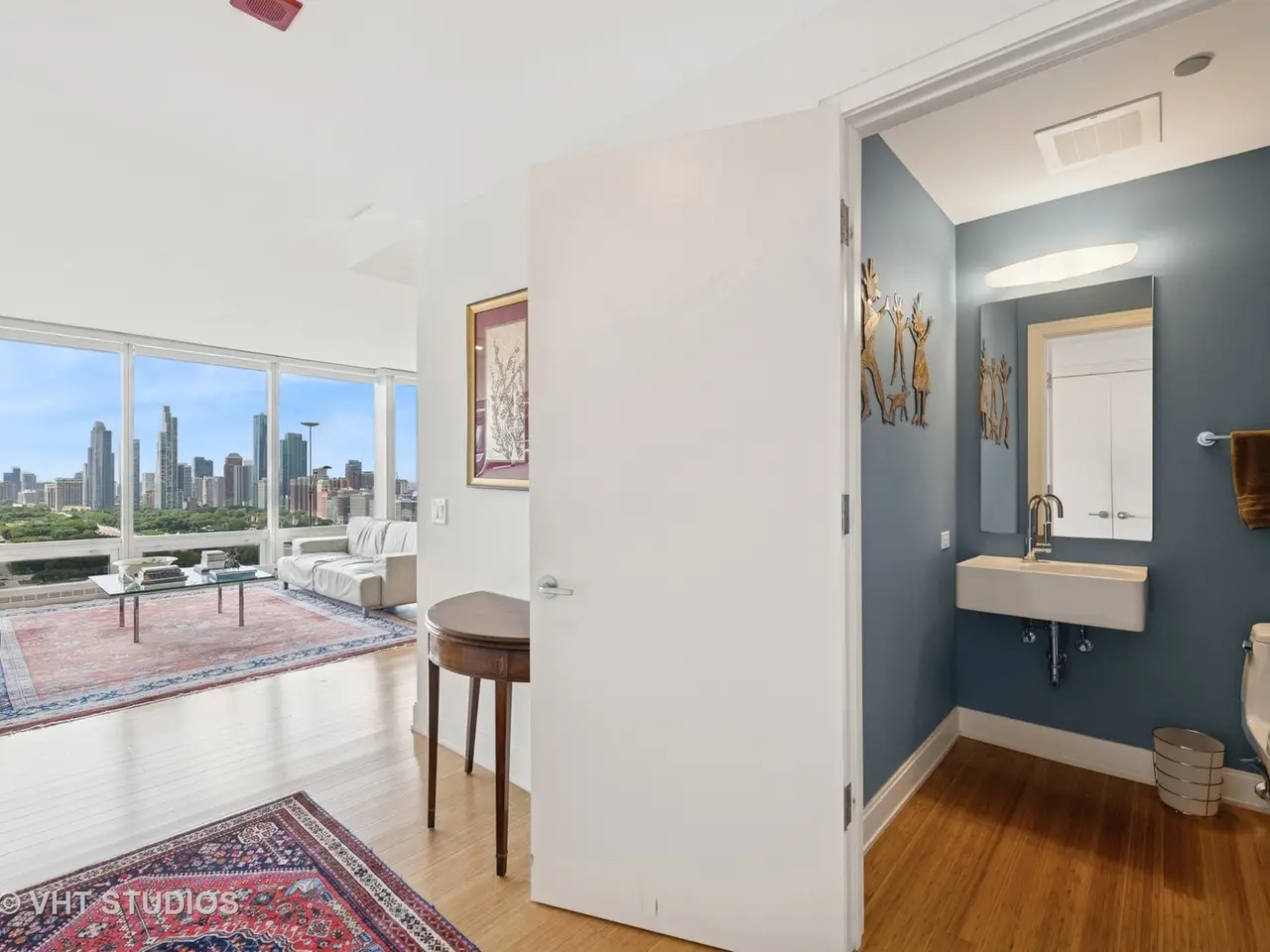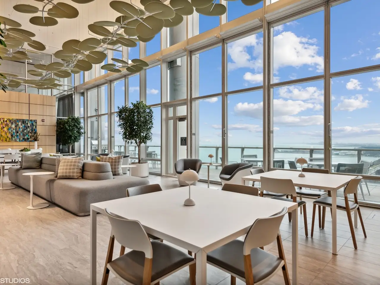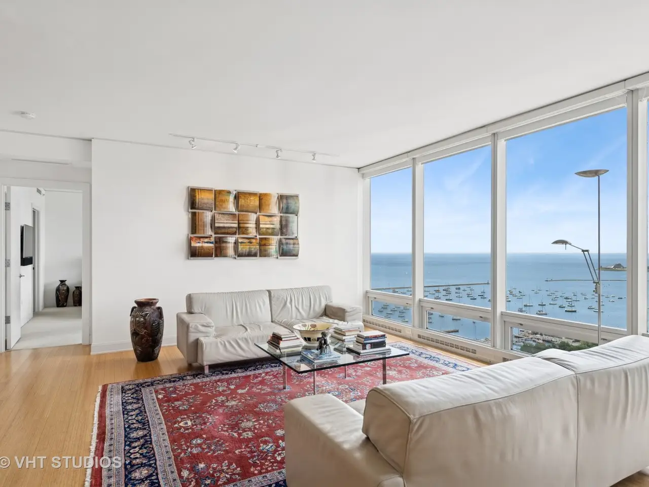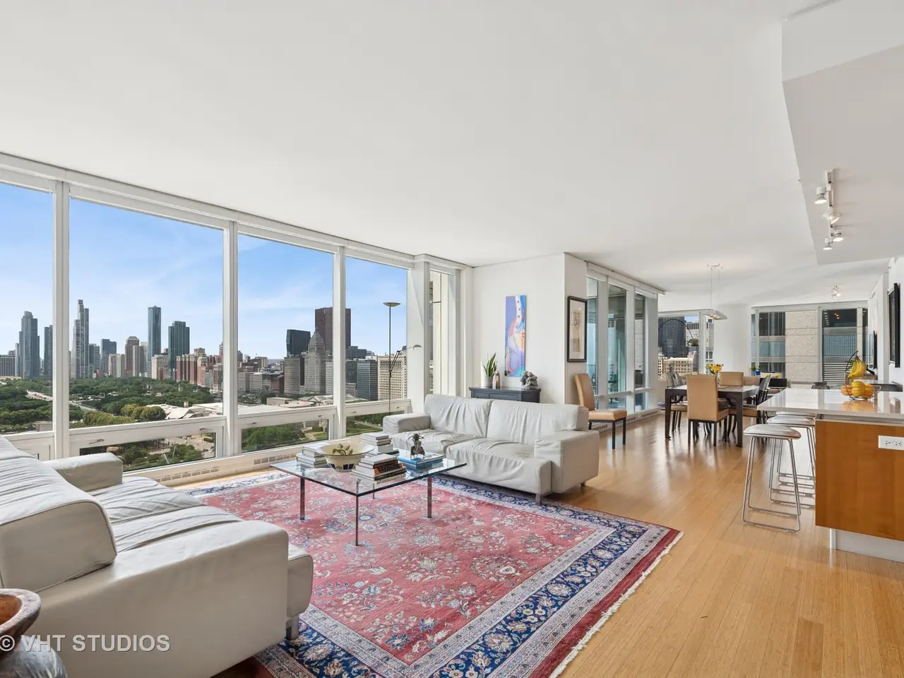 Floor to ceiling windows offering panoramic views of Lake Michigan, Museum Campus, and cityscape