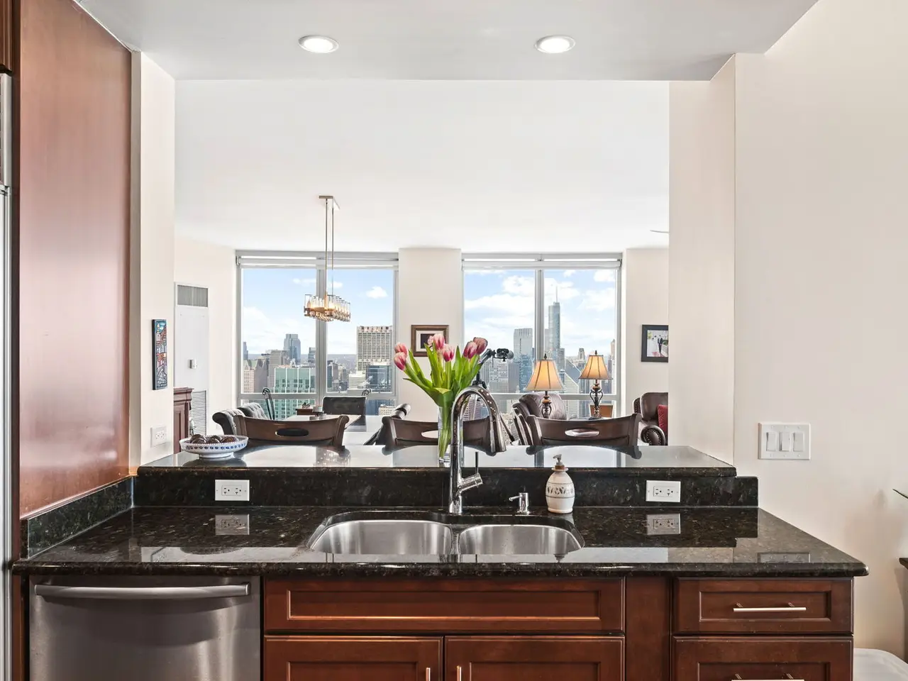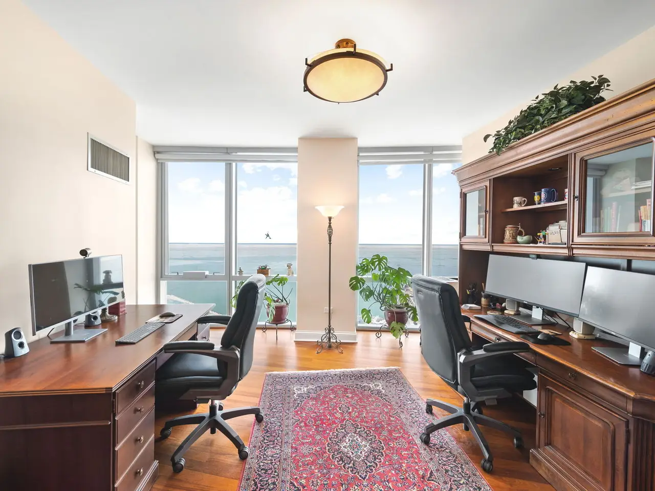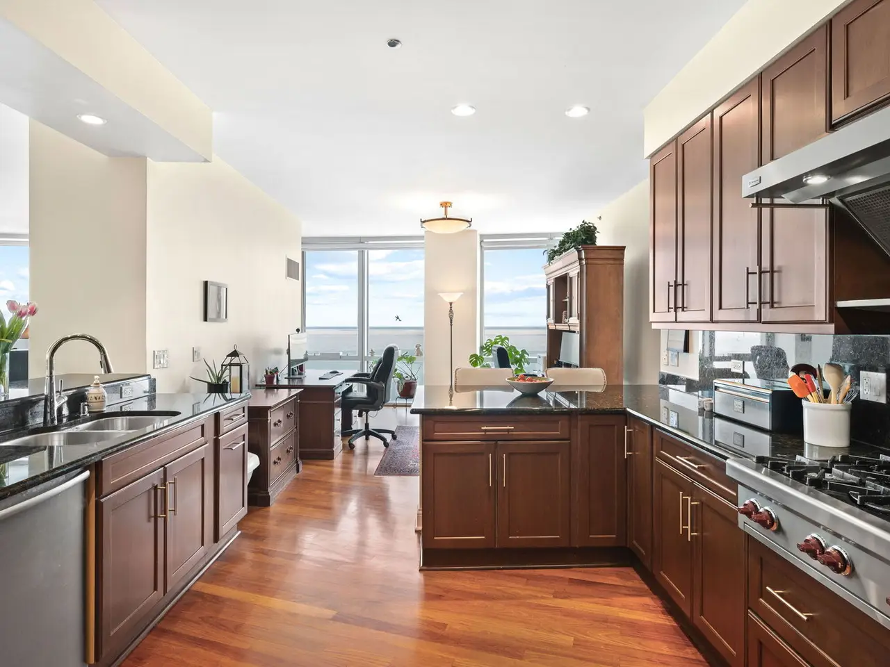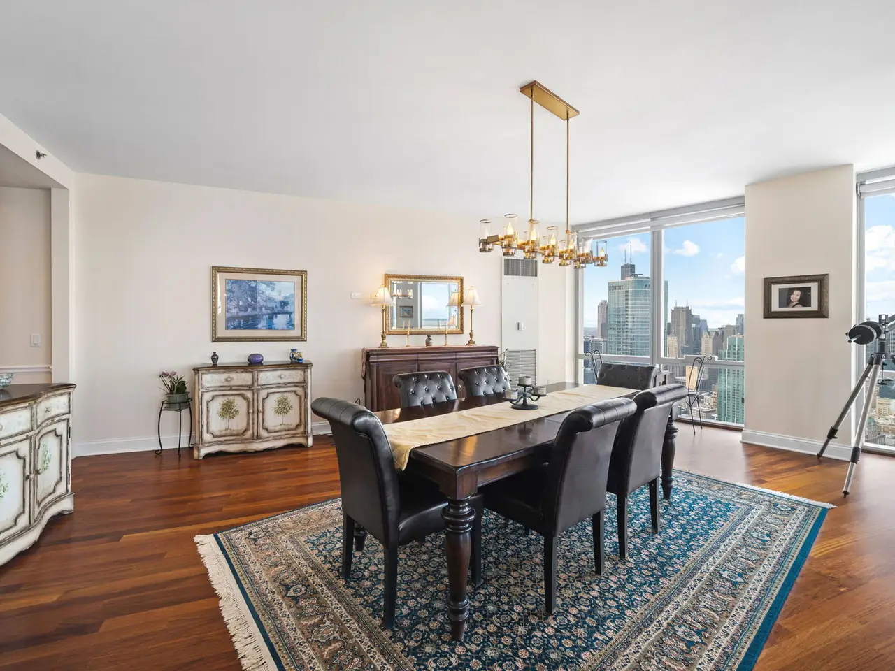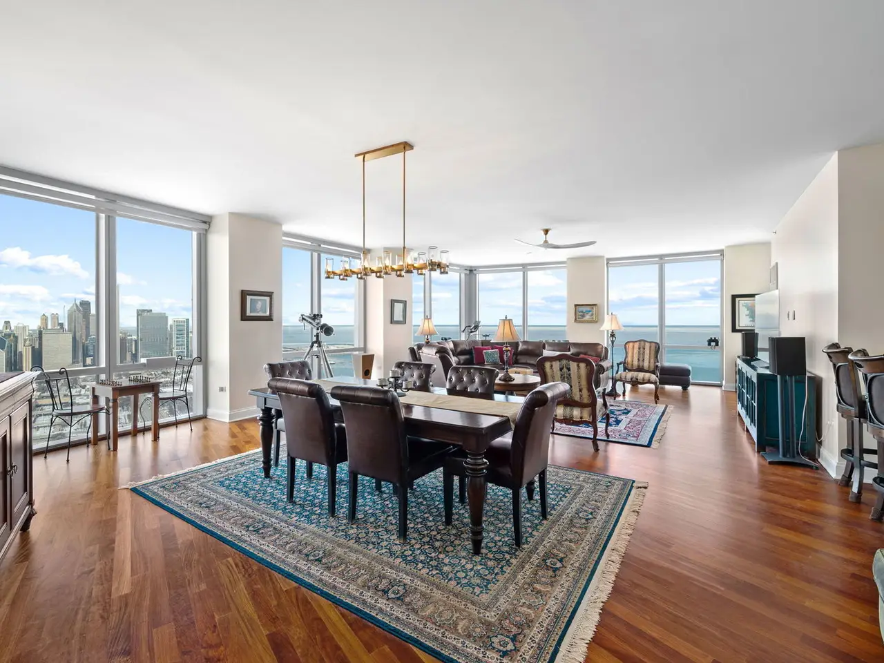 Floor-to-ceiling windows with panoramic city and lake views