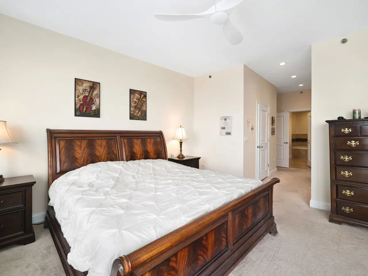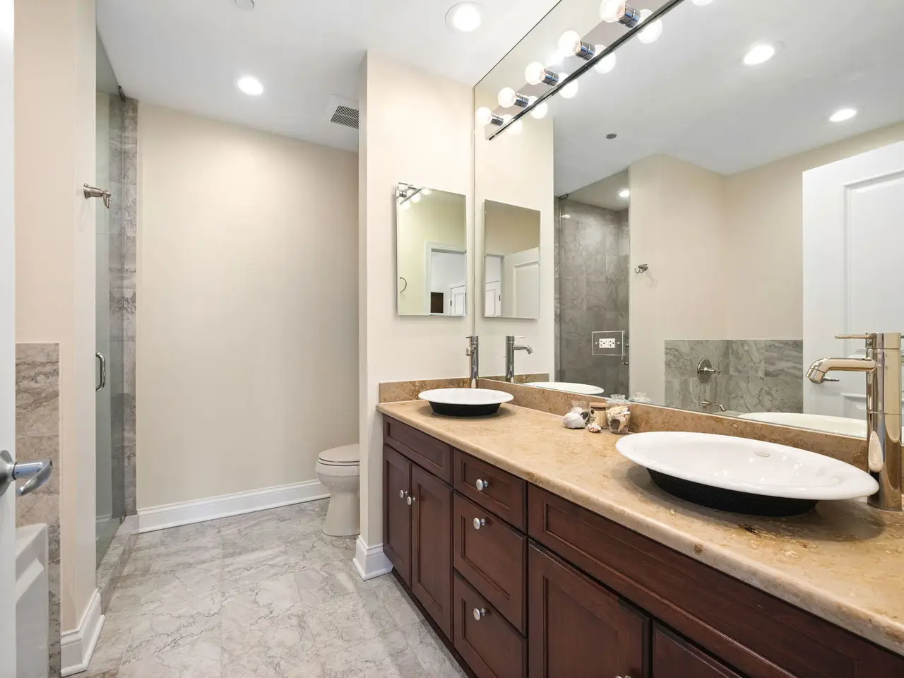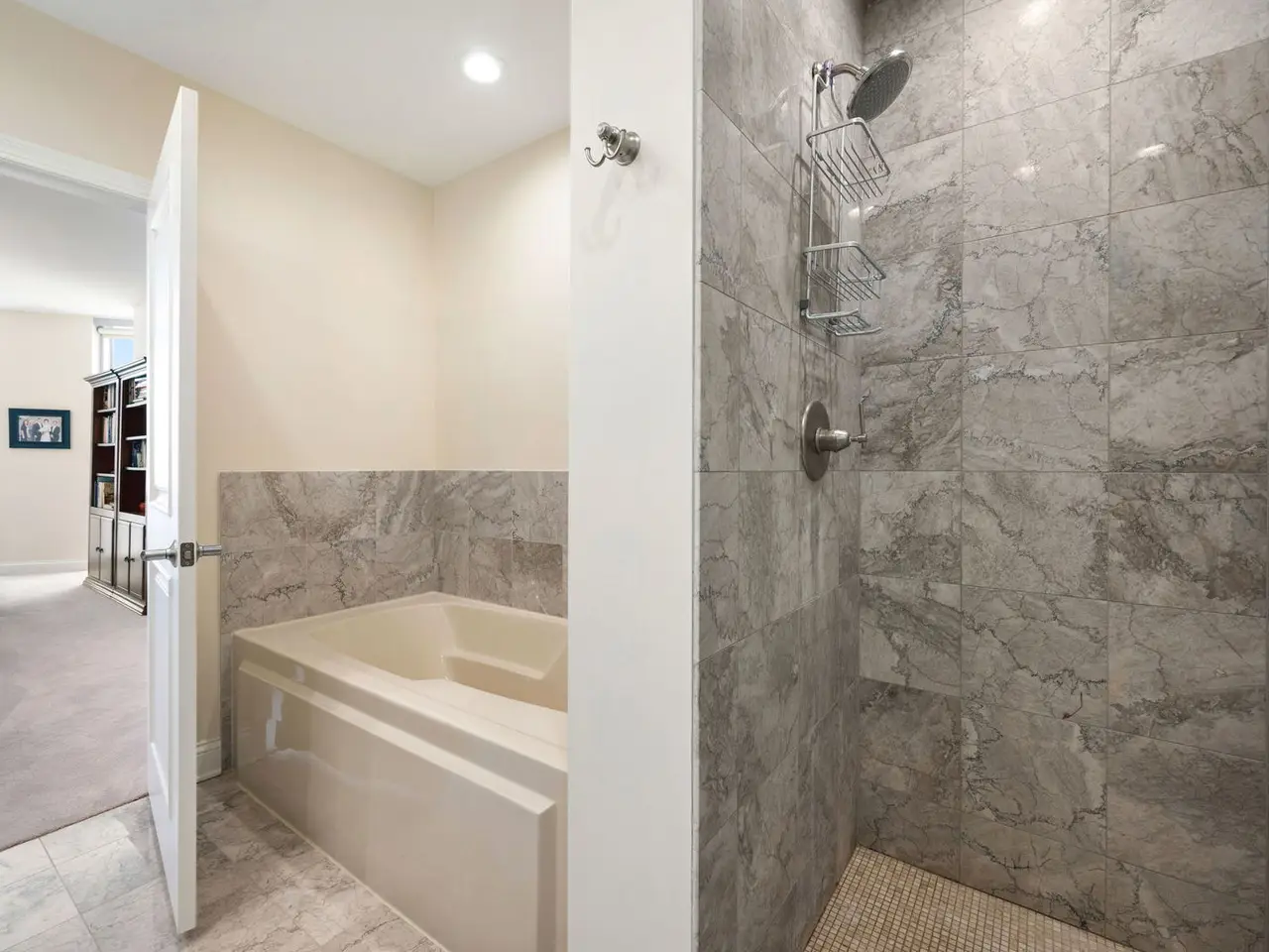 Spacious primary bedroom with en-suite featuring marble floors and soaking tub