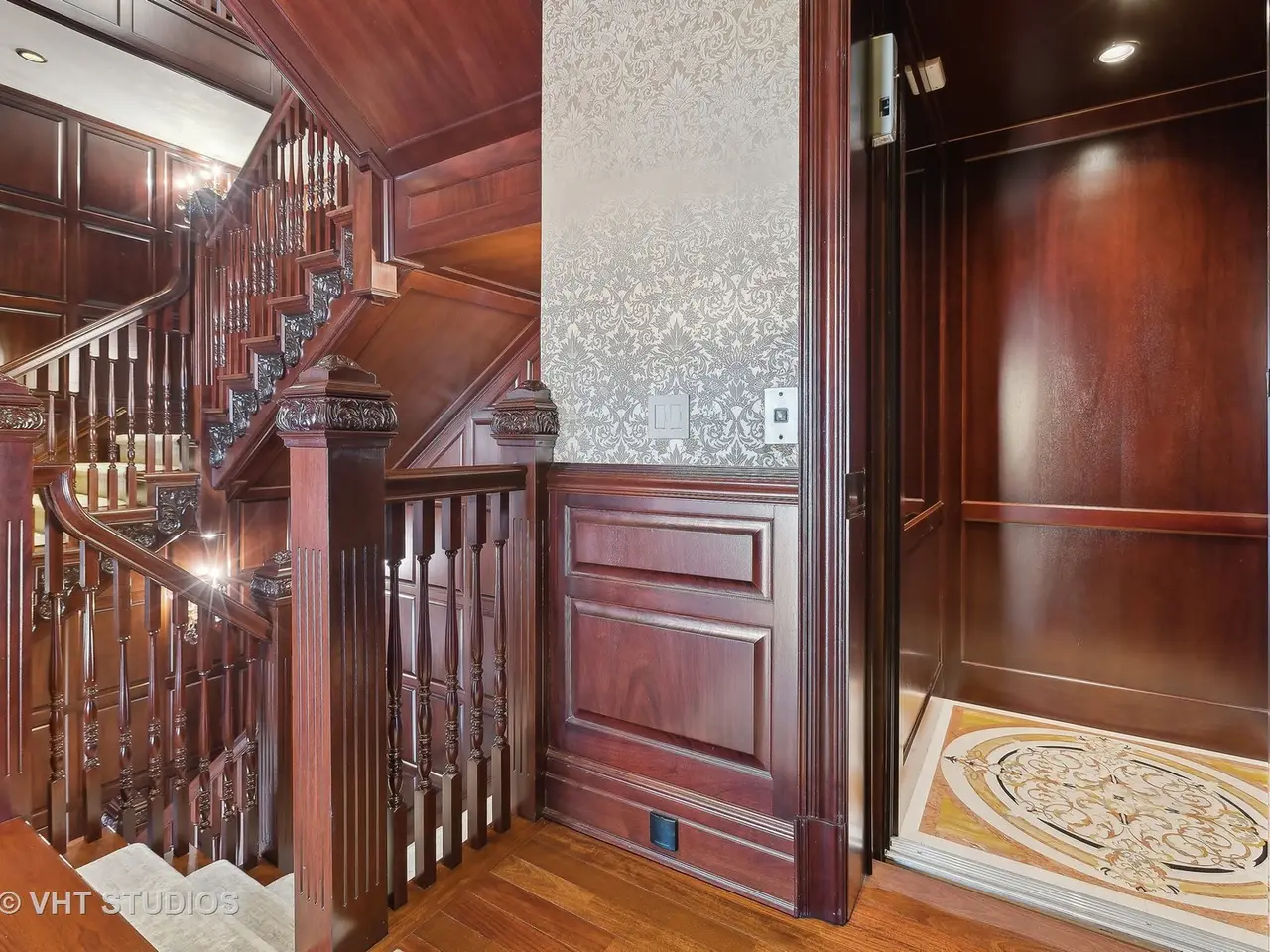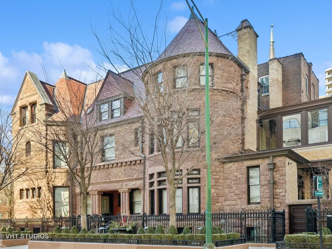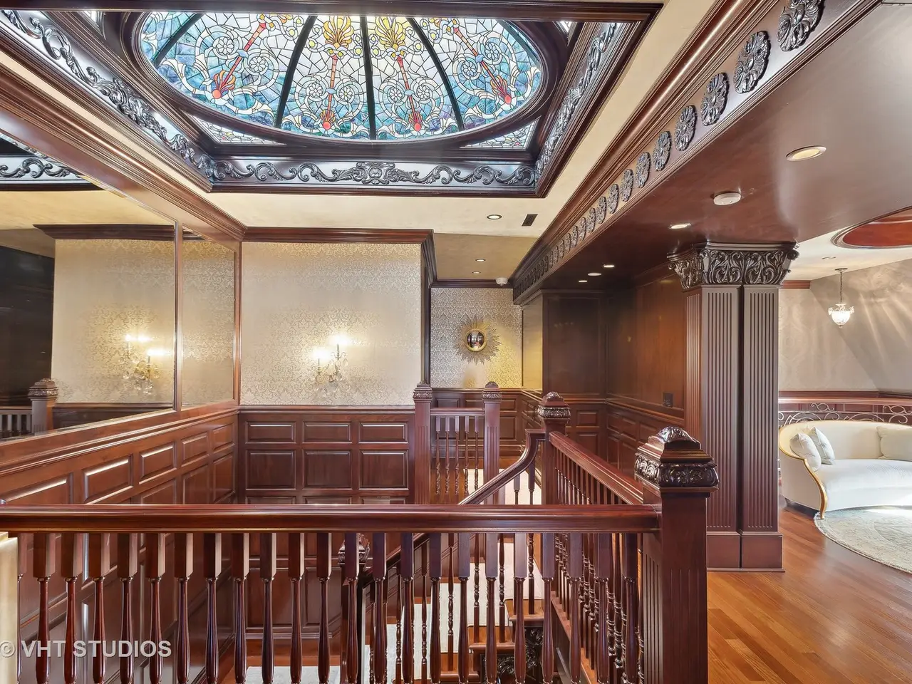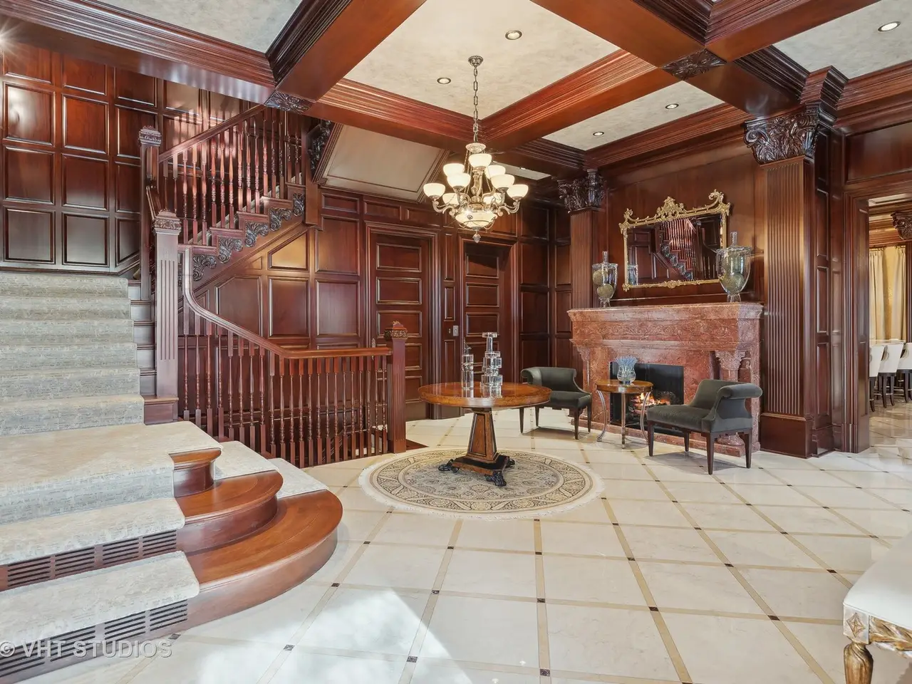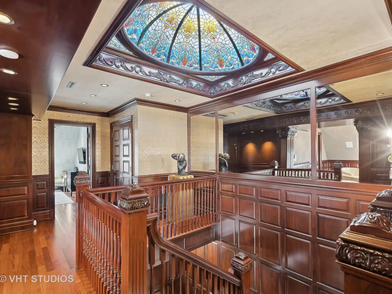 A rare piece of Chicago's history, the Thompson House at 915 N. Dearborn stands as one of the Gold Coast's original architectural treasures. Designed in 1888 by Cobb & Frost, the renowned architects behind the Newberry Library and University of Chicago, this grand residence was among the first to define the Gold Coast neighborhood after the Great Chicago Fire. For the next century, it was owned and used by the Scottish Rite. The property was meticulously restored by its current owner beginning in 2009, blending 19th-century grandeur with modern luxury. The Thompson House is now a nationally registered Historic Landmark. This masterpiece preserves its rich past while offering a remarkably livable floor plan where history, elegance, and everyday comfort coexist effortlessly. Constructed from solid red rock, this 5-bedroom, 4.2-bathroom home spans 13,400 square feet, with an additional 1-bedroom, 1-bathroom carriage house above the 3-car garage. This home showcases exceptional craftsmanship with one-of-a-kind finishes and details throughout. Some of the elements include a refurbished original mosaic floor, custom millwork, hand-carved marble fireplaces from Italy, and custom stained glass. Throughout the home, all wood features, including beams, doors, and trim, are custom made from solid Honduras Mahogany, with intricate touches such as paneling and carving. The staircase, also Honduras Mahogany, was hand crafted to mimic the home's original balusters. Modern features include an elevator servicing all levels, a Control4 system, integrated audio and speaker systems, smart HVAC controls, and full smart home capabilities, making this home as functional as it is beautiful. Enter the home to a large parlor paneled in mahogany. The details greet you right away - hand carved columns, custom stained glass windows and doors, marble floors imported from Turkey, and a hand carved marble fireplace. The adjacent great room is full of natural light from the large, curved windows and south and west exposures. The great room has earned its name sake with a Swarovski crystal chandelier, a hand-carved, book-matched onyx fireplace from Pakistan, and exquisite mahogany woodwork with in-wall cabinetry. Silk wall coverings and marble flooring add to the grandeur. On the opposite side of the foyer you will find the kitchen overlooking the walled courtyard with fountains and fireplace. The kitchen area features two dining areas, high-end appliances, a large island, custom cabinetry, and a laundry room tucked away. The second level landing showcases a stunning library framed by an intricate hand carved arch. You will also see the custom stained glass dome skylight up above. The second floor features the luxurious primary suite, complete with a wet bar, and en-suite bath, and a second bedroom or office with an en-suite bath. You will also find a screened in 3-season porch. On the top floor, there is a sitting room, three additional bedrooms, including two rooms sharing a Jack-and-Jill bathroom, and a third large bedroom with its own en-suite bath. The lower level is designed for relaxation and entertainment, featuring two seating areas, a bar, and a spa. The media area includes a hand-carved Italian Botticino marble fireplace and marble floors with bronze inlay. The galley bar offers an in-wall wine display, and the spa features a sauna, jacuzzi, steam suite, spa dressing rooms, a massage and zen room, and an additional laundry area. A Murano glass mural with an integrated waterfall and glass-blown ceilings add unique artistic elements rarely found in modern homes. Across the courtyard, you will find the cozy coach house, perfect for guests or additional living space. The home includes a heated 3-car garage. The Thompson House is more than just a home; it's a timeless work of art that embodies elegance, craftsmanship, and luxury living in the heart of Chicago.