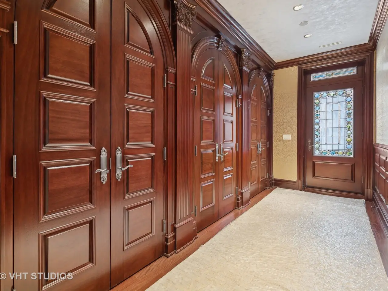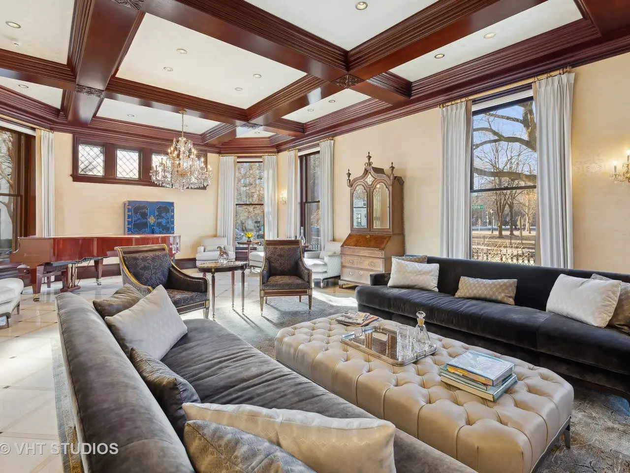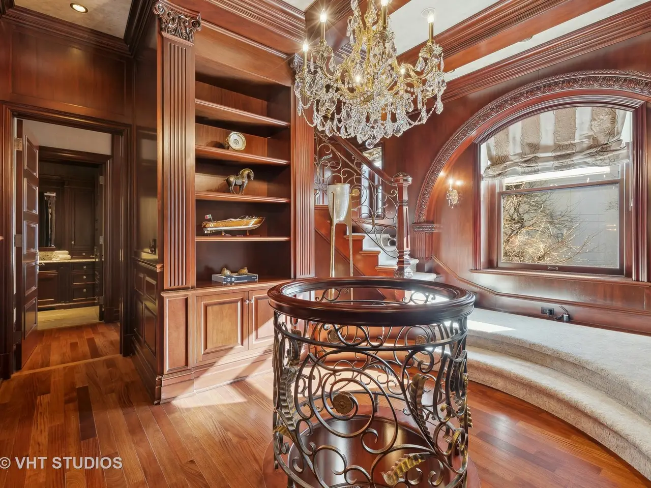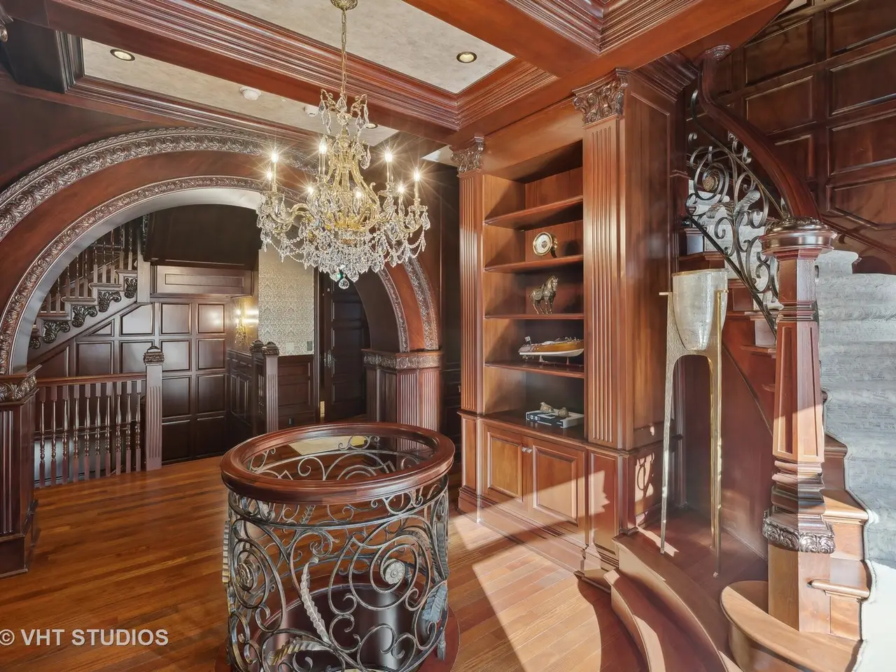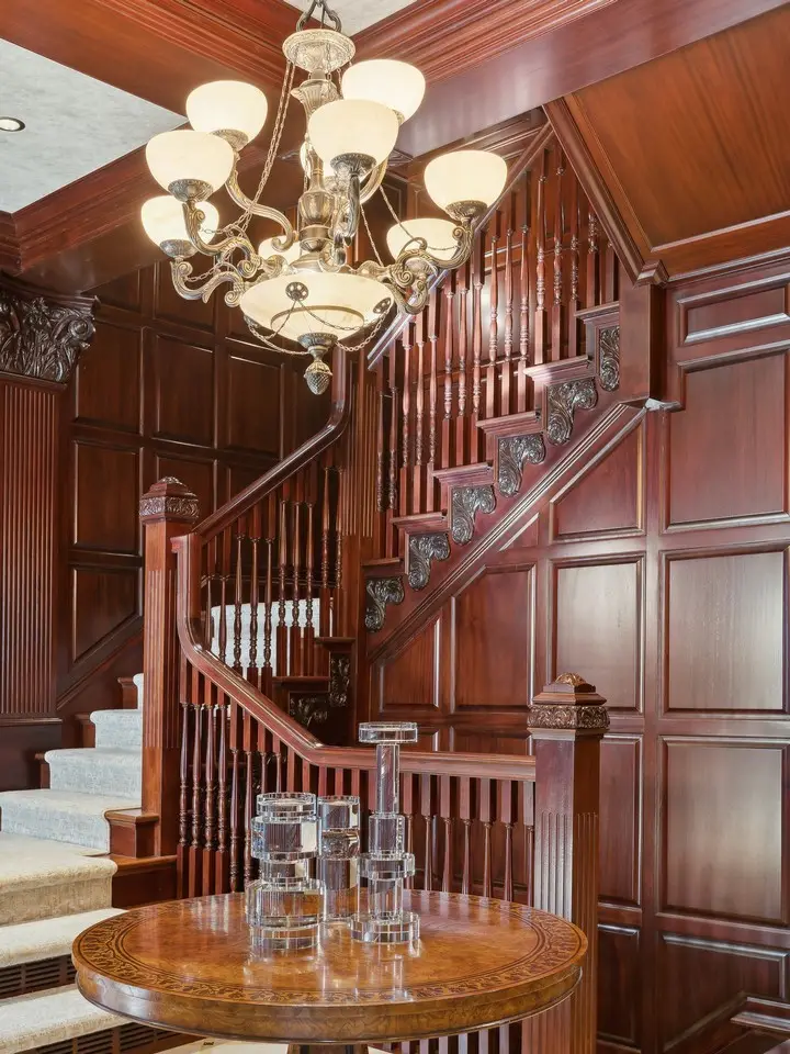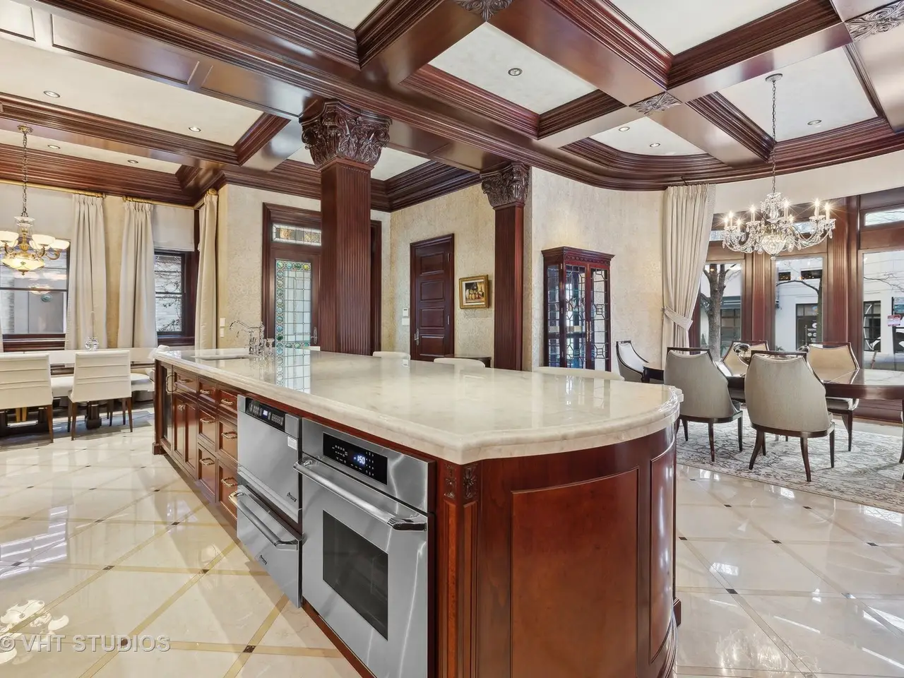 A rare piece of Chicago's history, the Thompson House at 915 N. Dearborn stands as one of the Gold Coast's original architectural treasures. Designed in 1888 by Cobb & Frost, the renowned architects behind the Newberry Library and University of Chicago, this grand residence was among the first to define the Gold Coast neighborhood after the Great Chicago Fire. For the next century, it was owned and used by the Scottish Rite. The property was meticulously restored by its current owner beginning in 2009, blending 19th-century grandeur with modern luxury. The Thompson House is now a nationally registered Historic Landmark. This masterpiece preserves its rich past while offering a remarkably livable floor plan where history, elegance, and everyday comfort coexist effortlessly. Constructed from solid red rock, this 5-bedroom, 4.2-bathroom home spans 13,400 square feet, with an additional 1-bedroom, 1-bathroom carriage house above the 3-car garage. This home showcases exceptional craftsmanship with one-of-a-kind finishes and details throughout. Some of the elements include a refurbished original mosaic floor, custom millwork, hand-carved marble fireplaces from Italy, and custom stained glass. Throughout the home, all wood features, including beams, doors, and trim, are custom made from solid Honduras Mahogany, with intricate touches such as paneling and carving. The staircase, also Honduras Mahogany, was hand crafted to mimic the home's original balusters. Modern features include an elevator servicing all levels, a Control4 system, integrated audio and speaker systems, smart HVAC controls, and full smart home capabilities, making this home as functional as it is beautiful. Enter the home to a large parlor paneled in mahogany. The details greet you right away - hand carved columns, custom stained glass windows and doors, marble floors imported from Turkey, and a hand carved marble fireplace. The adjacent great room is full of natural light from the large, curved windows and south and west exposures. The great room has earned its name sake with a Swarovski crystal chandelier, a hand-carved, book-matched onyx fireplace from Pakistan, and exquisite mahogany woodwork with in-wall cabinetry. Silk wall coverings and marble flooring add to the grandeur. On the opposite side of the foyer you will find the kitchen overlooking the walled courtyard with fountains and fireplace. The kitchen area features two dining areas, high-end appliances, a large island, custom cabinetry, and a laundry room tucked away. The second level landing showcases a stunning library framed by an intricate hand carved arch. You will also see the custom stained glass dome skylight up above. The second floor features the luxurious primary suite, complete with a wet bar, and en-suite bath, and a second bedroom or office with an en-suite bath. You will also find a screened in 3-season porch. On the top floor, there is a sitting room, three additional bedrooms, including two rooms sharing a Jack-and-Jill bathroom, and a third large bedroom with its own en-suite bath. The lower level is designed for relaxation and entertainment, featuring two seating areas, a bar, and a spa. The media area includes a hand-carved Italian Botticino marble fireplace and marble floors with bronze inlay. The galley bar offers an in-wall wine display, and the spa features a sauna, jacuzzi, steam suite, spa dressing rooms, a massage and zen room, and an additional laundry area. A Murano glass mural with an integrated waterfall and glass-blown ceilings add unique artistic elements rarely found in modern homes. Across the courtyard, you will find the cozy coach house, perfect for guests or additional living space. The home includes a heated 3-car garage. The Thompson House is more than just a home; it's a timeless work of art that embodies elegance, craftsmanship, and luxury living in the heart of Chicago.