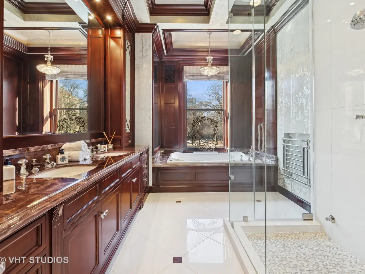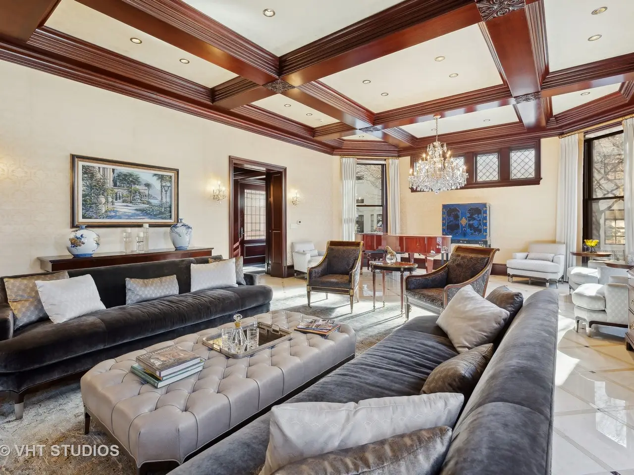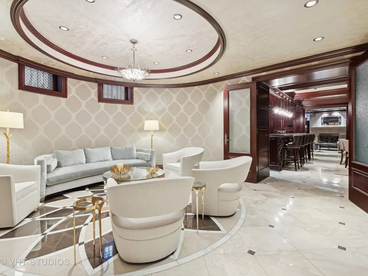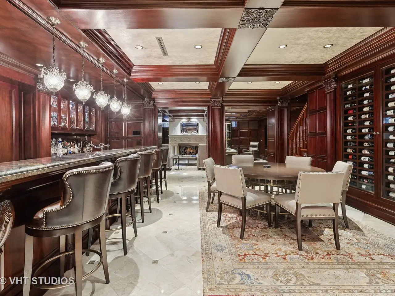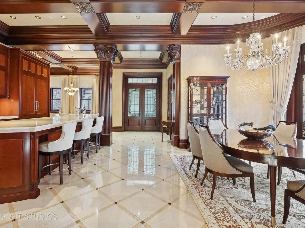 A rare piece of Chicago's history, the Thompson House at 915 N. Dearborn stands as one of the Gold Coast's original architectural treasures. Designed in 1888 by Cobb & Frost, the renowned architects behind the Newberry Library and University of Chicago, this grand residence was among the first to define the Gold Coast neighborhood after the Great Chicago Fire. For the next century, it was owned and used by the Scottish Rite. The property was meticulously restored by its current owner beginning in 2009, blending 19th-century grandeur with modern luxury. The Thompson House is now a nationally registered Historic Landmark. This masterpiece preserves its rich past while offering a remarkably livable floor plan where history, elegance, and everyday comfort coexist effortlessly. Constructed from solid red rock, this 5-bedroom, 4.2-bathroom home spans 13,400 square feet, with an additional 1-bedroom, 1-bathroom carriage house above the 3-car garage. This home showcases exceptional craftsmanship with one-of-a-kind finishes and details throughout. Some of the elements include a refurbished original mosaic floor, custom millwork, hand-carved marble fireplaces from Italy, and custom stained glass. Throughout the home, all wood features, including beams, doors, and trim, are custom made from solid Honduras Mahogany, with intricate touches such as paneling and carving. The staircase, also Honduras Mahogany, was hand crafted to mimic the home's original balusters. Modern features include an elevator servicing all levels, a Control4 system, integrated audio and speaker systems, smart HVAC controls, and full smart home capabilities, making this home as functional as it is beautiful. Enter the home to a large parlor paneled in mahogany. The details greet you right away - hand carved columns, custom stained glass windows and doors, marble floors imported from Turkey, and a hand carved marble fireplace. The adjacent great room is full of natural light from the large, curved windows and south and west exposures. The great room has earned its name sake with a Swarovski crystal chandelier, a hand-carved, book-matched onyx fireplace from Pakistan, and exquisite mahogany woodwork with in-wall cabinetry. Silk wall coverings and marble flooring add to the grandeur. On the opposite side of the foyer you will find the kitchen overlooking the walled courtyard with fountains and fireplace. The kitchen area features two dining areas, high-end appliances, a large island, custom cabinetry, and a laundry room tucked away. The second level landing showcases a stunning library framed by an intricate hand carved arch. You will also see the custom stained glass dome skylight up above. The second floor features the luxurious primary suite, complete with a wet bar, and en-suite bath, and a second bedroom or office with an en-suite bath. You will also find a screened in 3-season porch. On the top floor, there is a sitting room, three additional bedrooms, including two rooms sharing a Jack-and-Jill bathroom, and a third large bedroom with its own en-suite bath. The lower level is designed for relaxation and entertainment, featuring two seating areas, a bar, and a spa. The media area includes a hand-carved Italian Botticino marble fireplace and marble floors with bronze inlay. The galley bar offers an in-wall wine display, and the spa features a sauna, jacuzzi, steam suite, spa dressing rooms, a massage and zen room, and an additional laundry area. A Murano glass mural with an integrated waterfall and glass-blown ceilings add unique artistic elements rarely found in modern homes. Across the courtyard, you will find the cozy coach house, perfect for guests or additional living space. The home includes a heated 3-car garage. The Thompson House is more than just a home; it's a timeless work of art that embodies elegance, craftsmanship, and luxury living in the heart of Chicago.