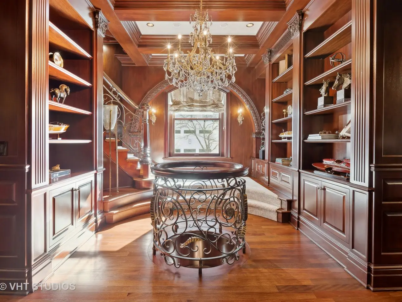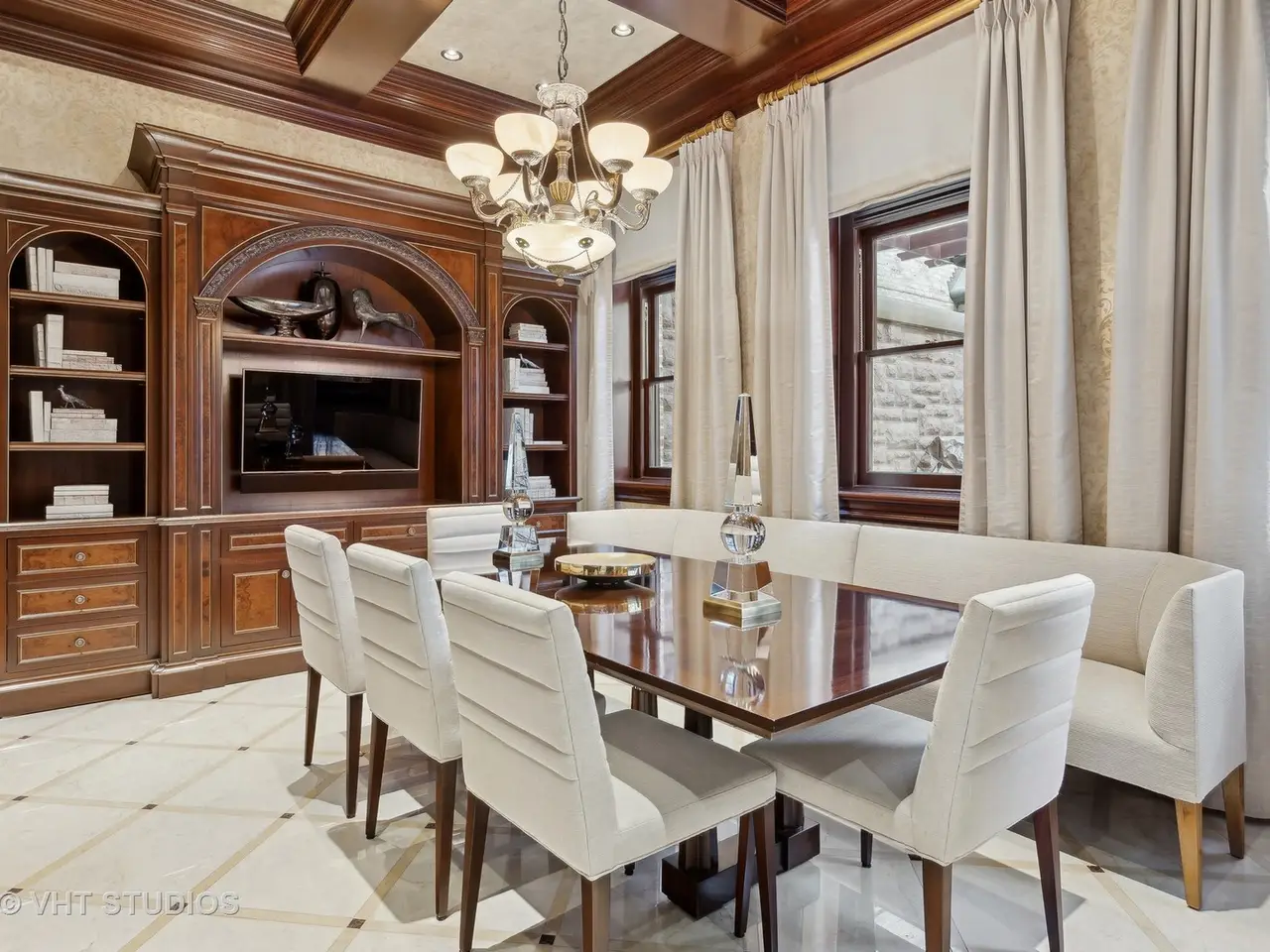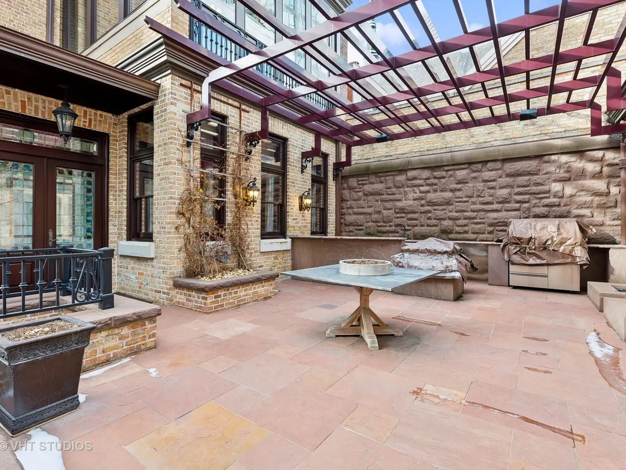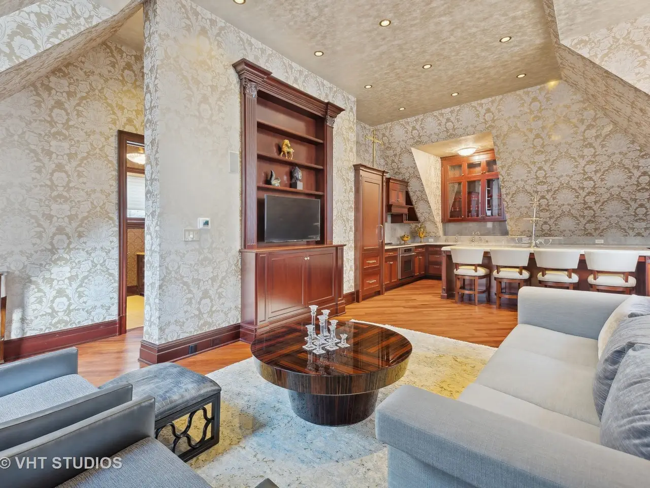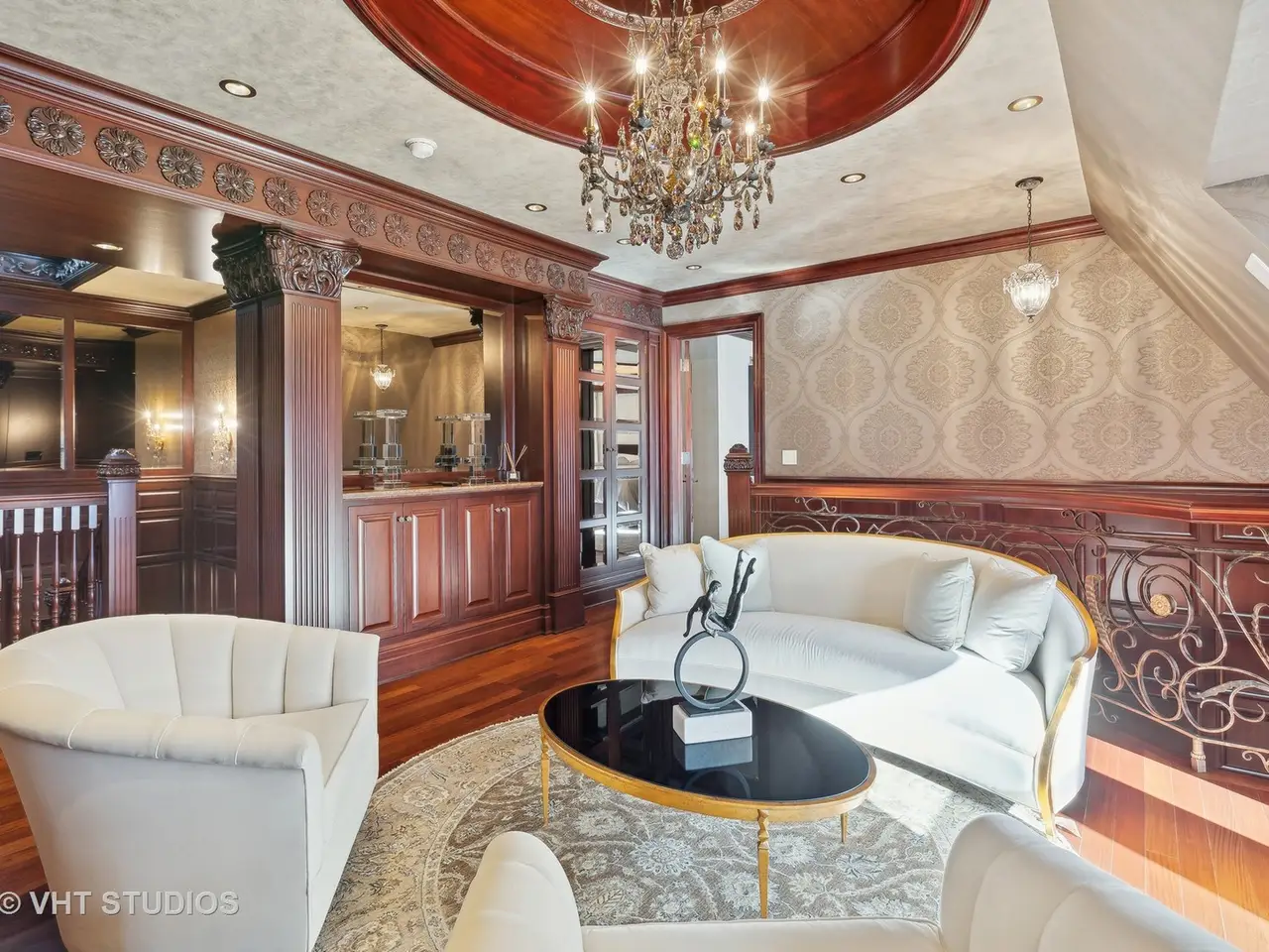 A rare piece of Chicago's history, the Thompson House at 915 N. Dearborn stands as one of the Gold Coast's original architectural treasures. Designed in 1888 by Cobb & Frost, the renowned architects behind the Newberry Library and University of Chicago, this grand residence was among the first to define the Gold Coast neighborhood after the Great Chicago Fire. For the next century, it was owned and used by the Scottish Rite. The property was meticulously restored by its current owner beginning in 2009, blending 19th-century grandeur with modern luxury. The Thompson House is now a nationally registered Historic Landmark. This masterpiece preserves its rich past while offering a remarkably livable floor plan where history, elegance, and everyday comfort coexist effortlessly. Constructed from solid red rock, this 5-bedroom, 4.2-bathroom home spans 13,400 square feet, with an additional 1-bedroom, 1-bathroom carriage house above the 3-car garage. This home showcases exceptional craftsmanship with one-of-a-kind finishes and details throughout. Some of the elements include a refurbished original mosaic floor, custom millwork, hand-carved marble fireplaces from Italy, and custom stained glass. Throughout the home, all wood features, including beams, doors, and trim, are custom made from solid Honduras Mahogany, with intricate touches such as paneling and carving. The staircase, also Honduras Mahogany, was hand crafted to mimic the home's original balusters. Modern features include an elevator servicing all levels, a Control4 system, integrated audio and speaker systems, smart HVAC controls, and full smart home capabilities, making this home as functional as it is beautiful. Enter the home to a large parlor paneled in mahogany. The details greet you right away - hand carved columns, custom stained glass windows and doors, marble floors imported from Turkey, and a hand carved marble fireplace. The adjacent great room is full of natural light from the large, curved windows and south and west exposures. The great room has earned its name sake with a Swarovski crystal chandelier, a hand-carved, book-matched onyx fireplace from Pakistan, and exquisite mahogany woodwork with in-wall cabinetry. Silk wall coverings and marble flooring add to the grandeur. On the opposite side of the foyer you will find the kitchen overlooking the walled courtyard with fountains and fireplace. The kitchen area features two dining areas, high-end appliances, a large island, custom cabinetry, and a laundry room tucked away. The second level landing showcases a stunning library framed by an intricate hand carved arch. You will also see the custom stained glass dome skylight up above. The second floor features the luxurious primary suite, complete with a wet bar, and en-suite bath, and a second bedroom or office with an en-suite bath. You will also find a screened in 3-season porch. On the top floor, there is a sitting room, three additional bedrooms, including two rooms sharing a Jack-and-Jill bathroom, and a third large bedroom with its own en-suite bath. The lower level is designed for relaxation and entertainment, featuring two seating areas, a bar, and a spa. The media area includes a hand-carved Italian Botticino marble fireplace and marble floors with bronze inlay. The galley bar offers an in-wall wine display, and the spa features a sauna, jacuzzi, steam suite, spa dressing rooms, a massage and zen room, and an additional laundry area. A Murano glass mural with an integrated waterfall and glass-blown ceilings add unique artistic elements rarely found in modern homes. Across the courtyard, you will find the cozy coach house, perfect for guests or additional living space. The home includes a heated 3-car garage. The Thompson House is more than just a home; it's a timeless work of art that embodies elegance, craftsmanship, and luxury living in the heart of Chicago.