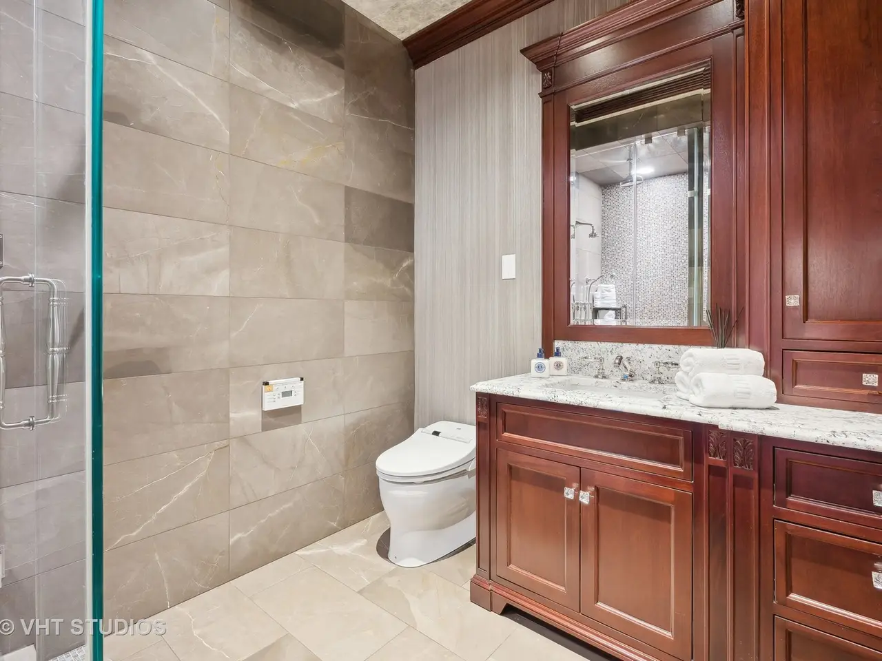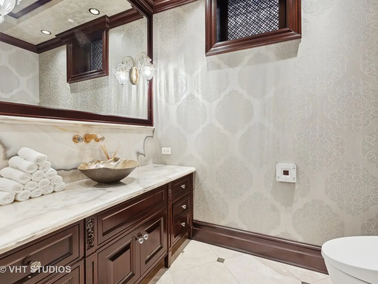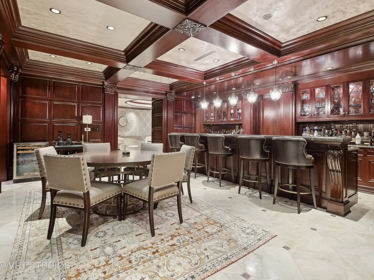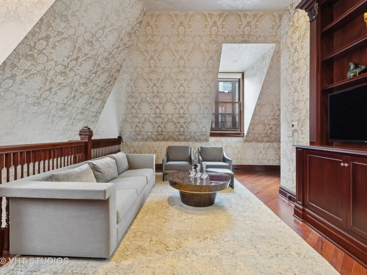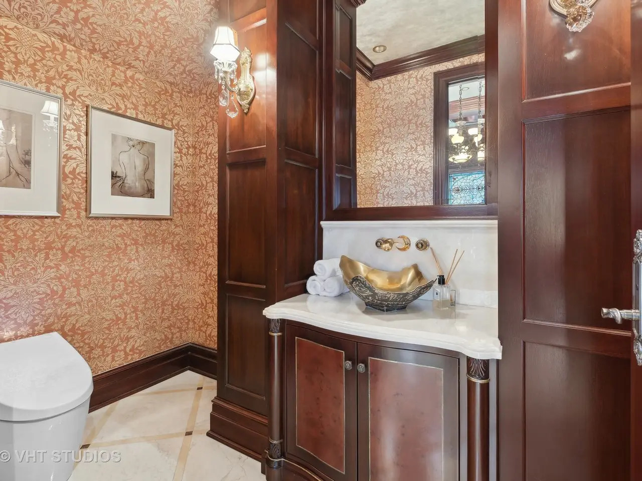 A rare piece of Chicago's history, the Thompson House at 915 N. Dearborn stands as one of the Gold Coast's original architectural treasures. Designed in 1888 by Cobb & Frost, the renowned architects behind the Newberry Library and University of Chicago, this grand residence was among the first to define the Gold Coast neighborhood after the Great Chicago Fire. For the next century, it was owned and used by the Scottish Rite. The property was meticulously restored by its current owner beginning in 2009, blending 19th-century grandeur with modern luxury. The Thompson House is now a nationally registered Historic Landmark. This masterpiece preserves its rich past while offering a remarkably livable floor plan where history, elegance, and everyday comfort coexist effortlessly. Constructed from solid red rock, this 5-bedroom, 4.2-bathroom home spans 13,400 square feet, with an additional 1-bedroom, 1-bathroom carriage house above the 3-car garage. This home showcases exceptional craftsmanship with one-of-a-kind finishes and details throughout. Some of the elements include a refurbished original mosaic floor, custom millwork, hand-carved marble fireplaces from Italy, and custom stained glass. Throughout the home, all wood features, including beams, doors, and trim, are custom made from solid Honduras Mahogany, with intricate touches such as paneling and carving. The staircase, also Honduras Mahogany, was hand crafted to mimic the home's original balusters. Modern features include an elevator servicing all levels, a Control4 system, integrated audio and speaker systems, smart HVAC controls, and full smart home capabilities, making this home as functional as it is beautiful. Enter the home to a large parlor paneled in mahogany. The details greet you right away - hand carved columns, custom stained glass windows and doors, marble floors imported from Turkey, and a hand carved marble fireplace. The adjacent great room is full of natural light from the large, curved windows and south and west exposures. The great room has earned its name sake with a Swarovski crystal chandelier, a hand-carved, book-matched onyx fireplace from Pakistan, and exquisite mahogany woodwork with in-wall cabinetry. Silk wall coverings and marble flooring add to the grandeur. On the opposite side of the foyer you will find the kitchen overlooking the walled courtyard with fountains and fireplace. The kitchen area features two dining areas, high-end appliances, a large island, custom cabinetry, and a laundry room tucked away. The second level landing showcases a stunning library framed by an intricate hand carved arch. You will also see the custom stained glass dome skylight up above. The second floor features the luxurious primary suite, complete with a wet bar, and en-suite bath, and a second bedroom or office with an en-suite bath. You will also find a screened in 3-season porch. On the top floor, there is a sitting room, three additional bedrooms, including two rooms sharing a Jack-and-Jill bathroom, and a third large bedroom with its own en-suite bath. The lower level is designed for relaxation and entertainment, featuring two seating areas, a bar, and a spa. The media area includes a hand-carved Italian Botticino marble fireplace and marble floors with bronze inlay. The galley bar offers an in-wall wine display, and the spa features a sauna, jacuzzi, steam suite, spa dressing rooms, a massage and zen room, and an additional laundry area. A Murano glass mural with an integrated waterfall and glass-blown ceilings add unique artistic elements rarely found in modern homes. Across the courtyard, you will find the cozy coach house, perfect for guests or additional living space. The home includes a heated 3-car garage. The Thompson House is more than just a home; it's a timeless work of art that embodies elegance, craftsmanship, and luxury living in the heart of Chicago.