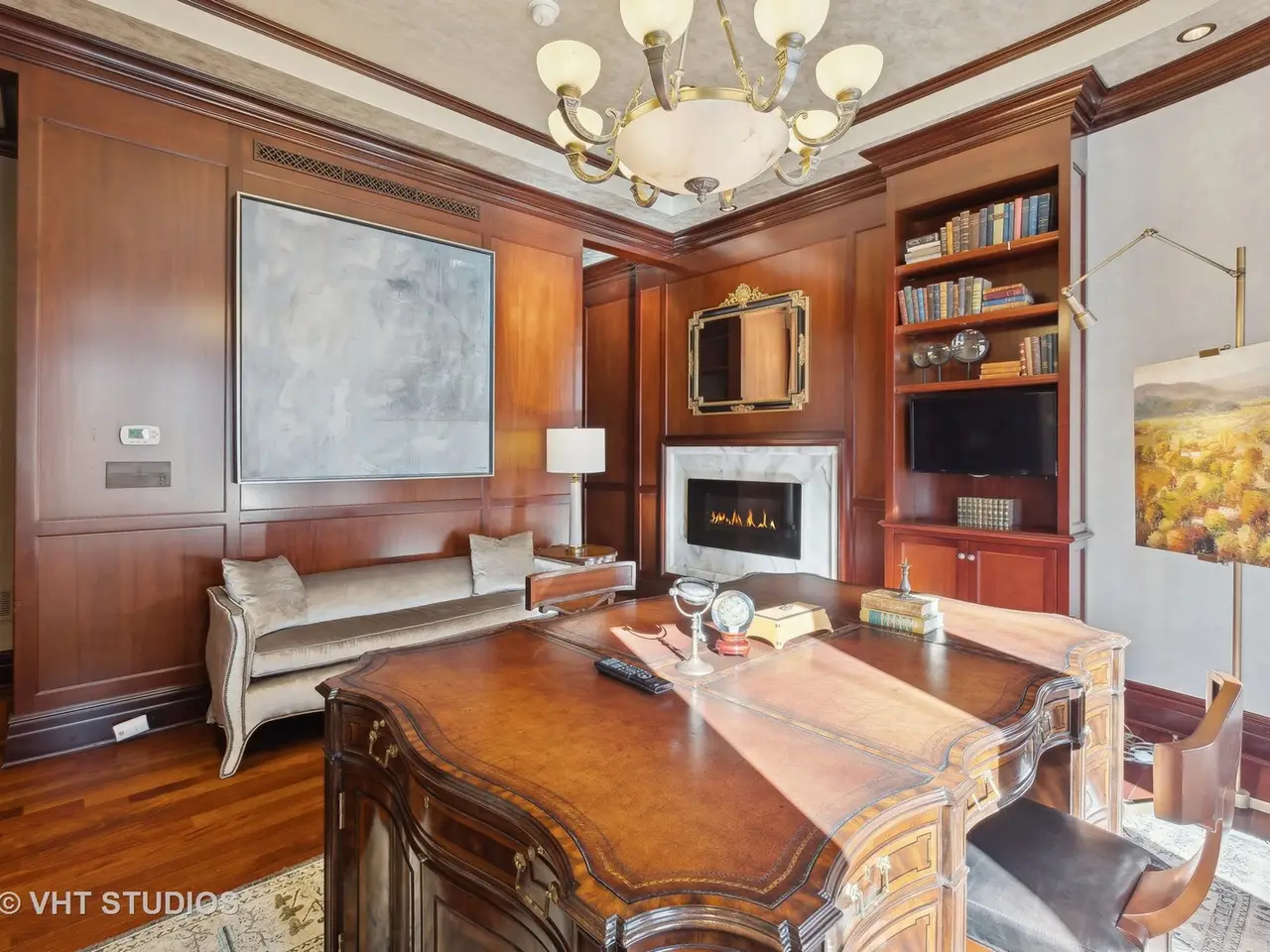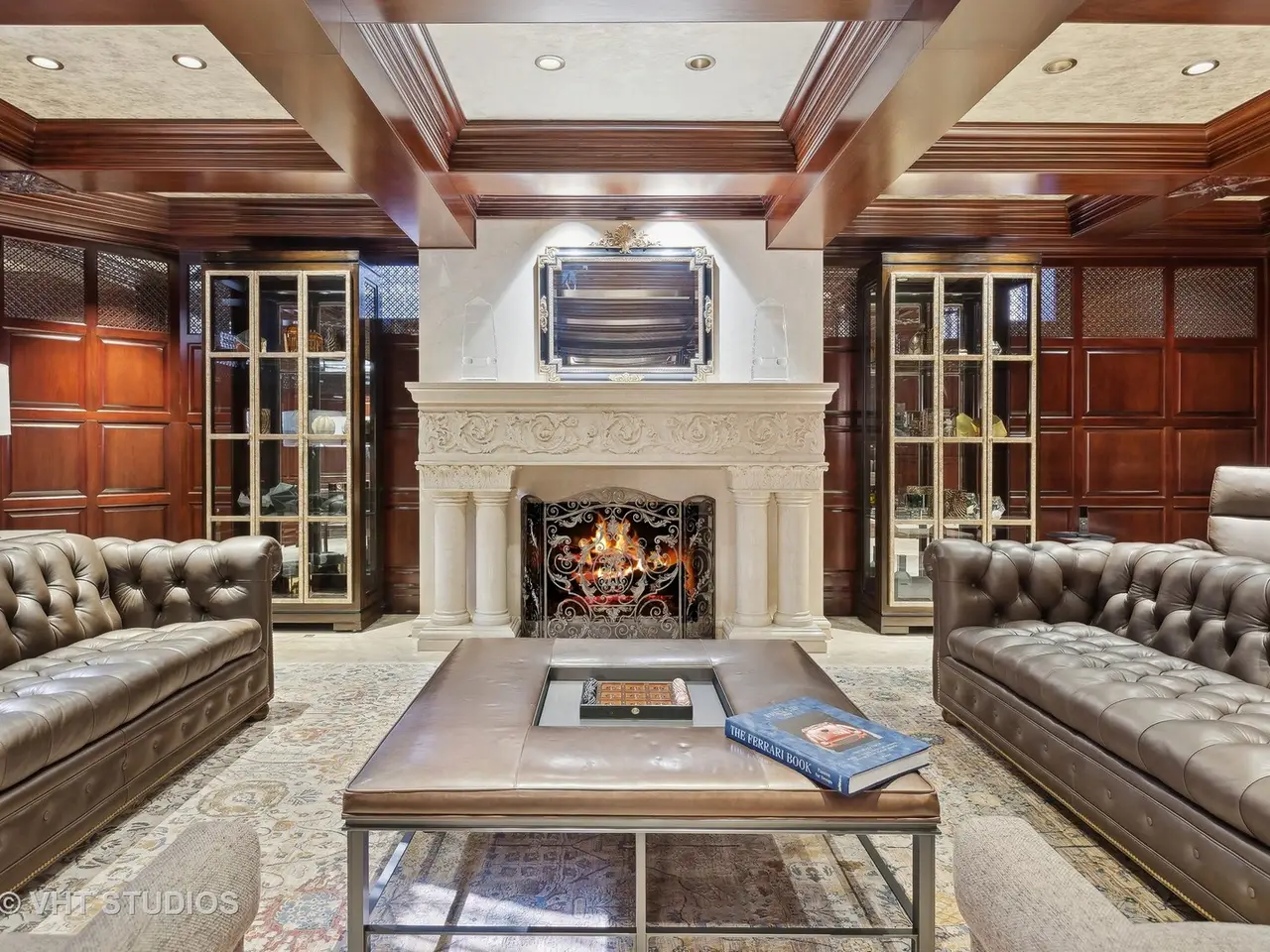 Media area with Italian marble fireplace