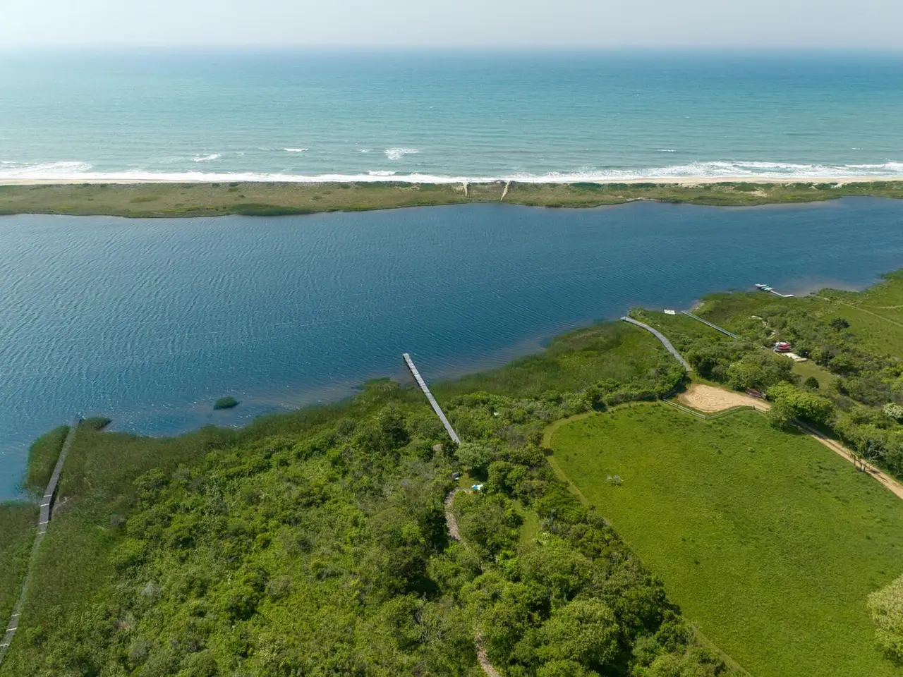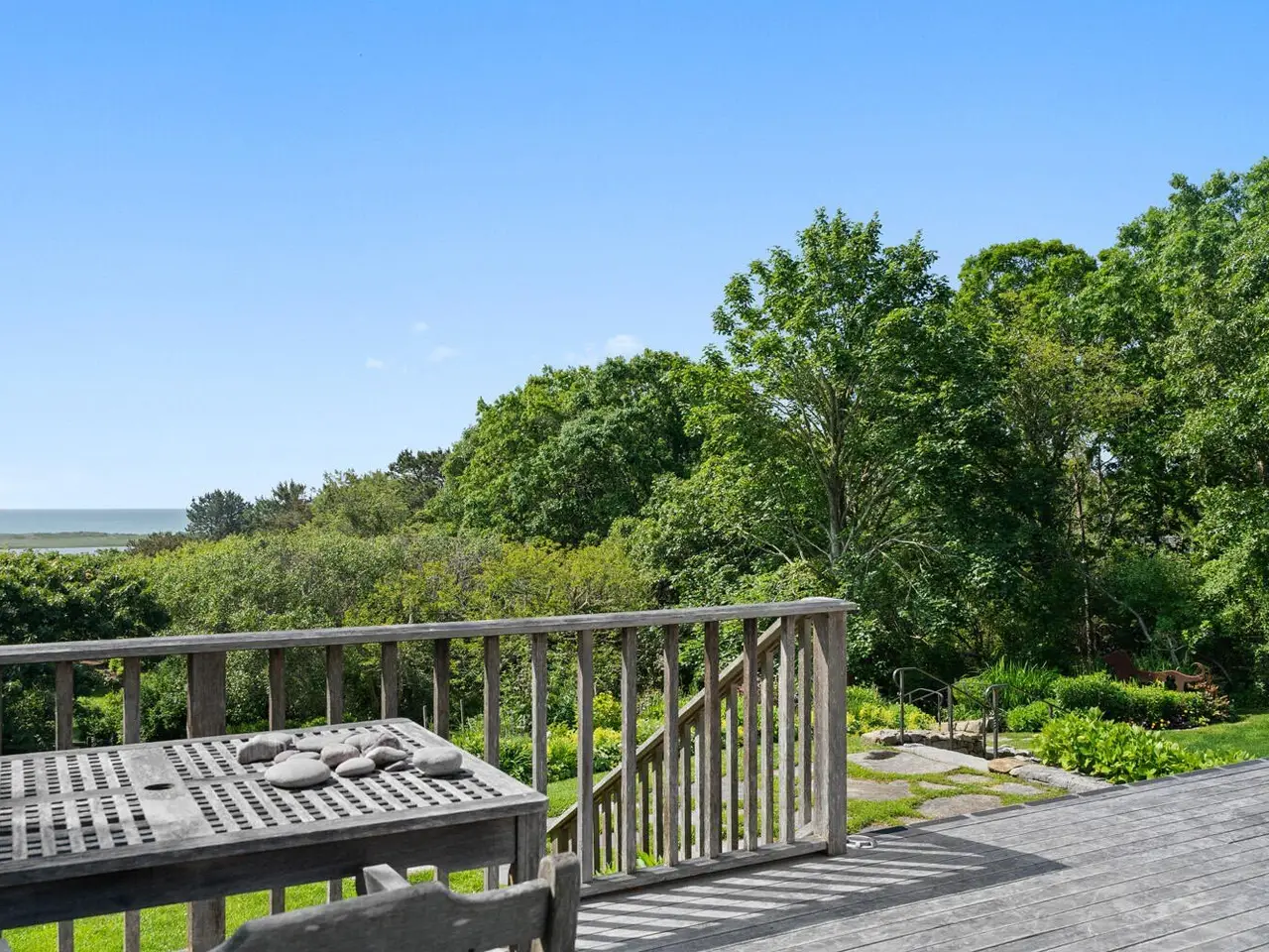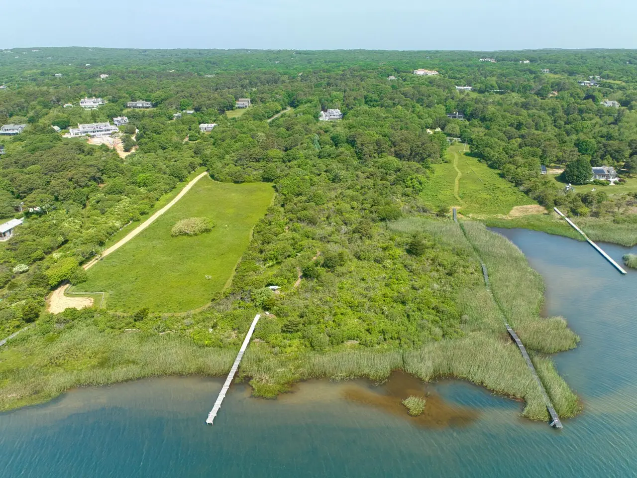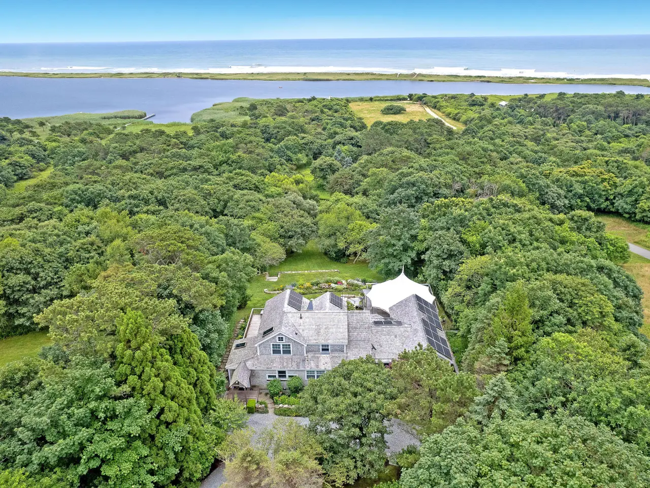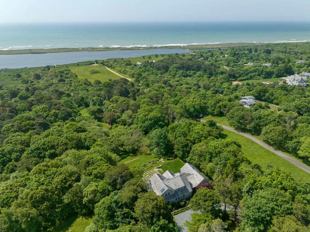 A commanding pond front retreat with a private dock and South Shore views - this exceptional residence offers a rare blend of privacy, elegance, and modern comfort. Originally built by Tom Tate and renovated in 2018, it exudes contemporary sophistication while embracing its natural surroundings. A private dock on Chilmark Pond provides direct water access and stunning South Shore sunsets. Follow a beautifully manicured path-an iconic Vineyard feature-to your dock and cross the pond to your private beach lot. Surrounded by over 7 acres of abutting conservation land, the setting is peaceful and secluded. Meticulously designed gardens enhance the home's timeless charm. The expansive first floor is perfect for entertaining, with open living spaces and a private office. The ground level offers a relaxed lounge with a wet bar and backyard access. Upstairs, a luxurious primary suite spans the entire second floor, featuring two private bathrooms and panoramic water views. More than a home-this is an elegant, serene lifestyle. A separate guest house is also available.