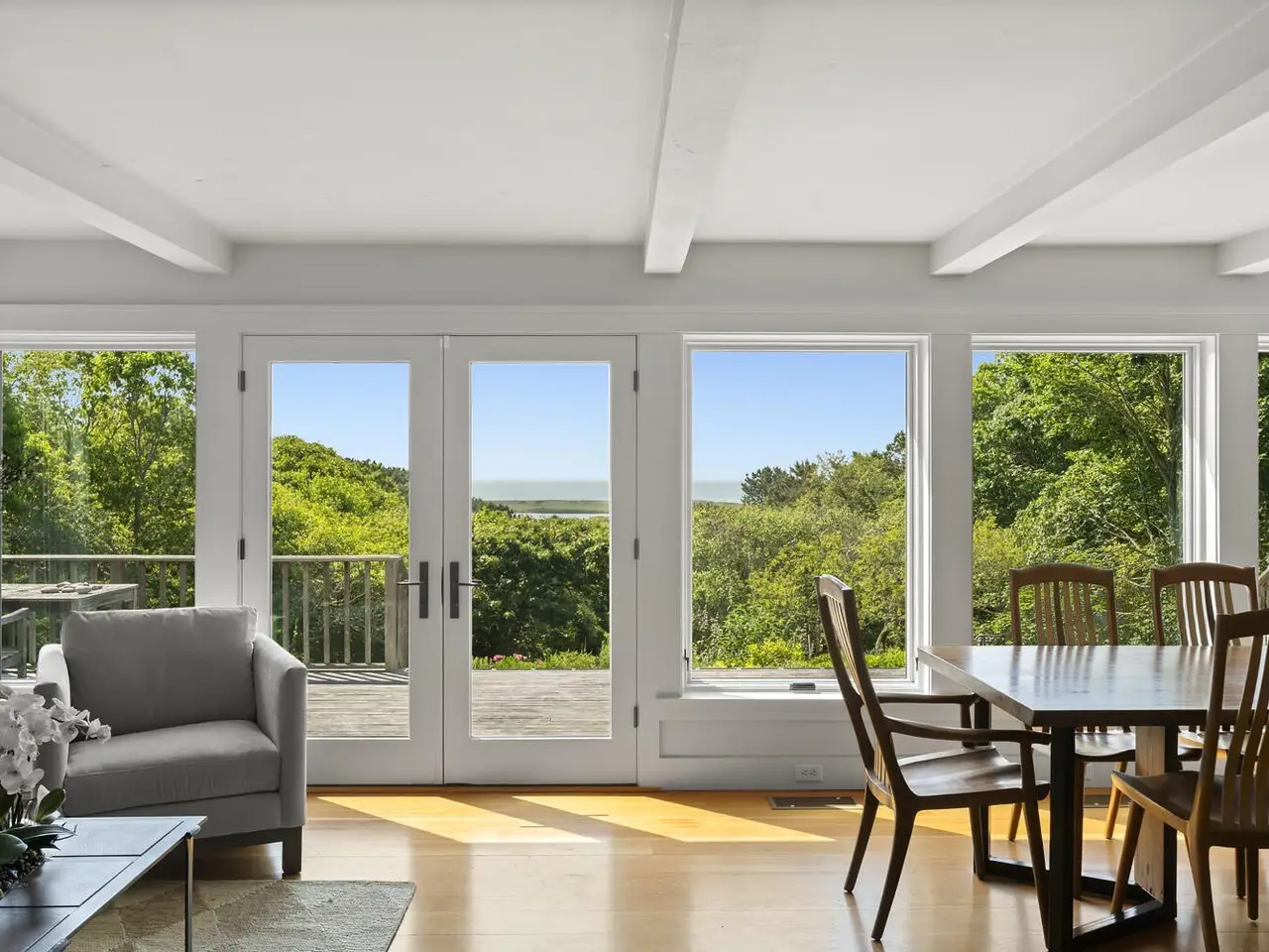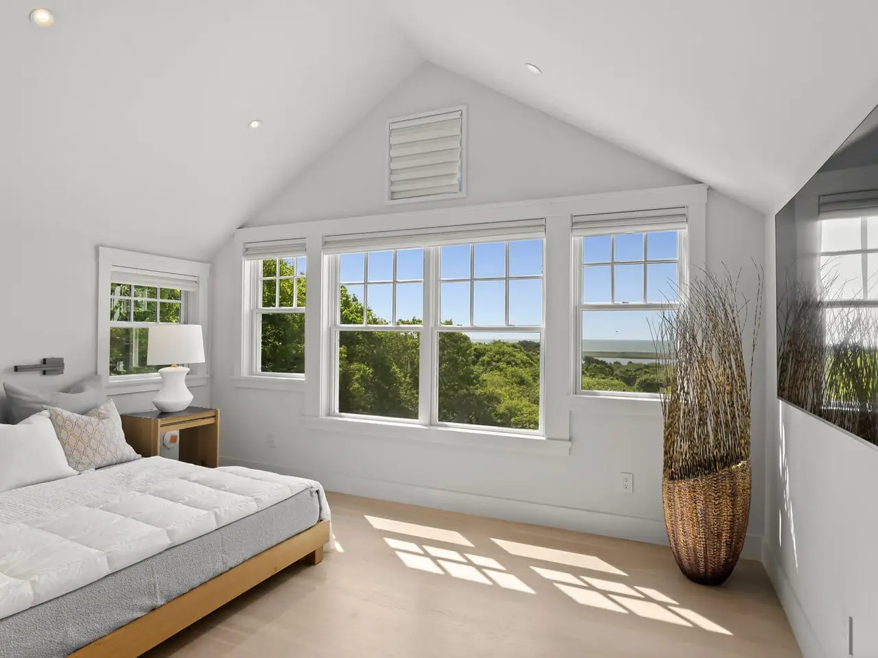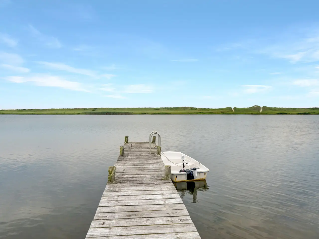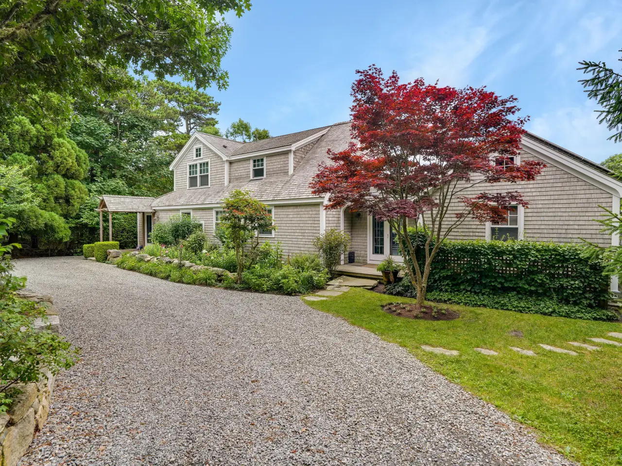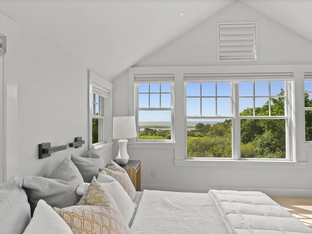 A commanding pond front retreat with a private dock and South Shore views - this exceptional residence offers a rare blend of privacy, elegance, and modern comfort. Originally built by Tom Tate and renovated in 2018, it exudes contemporary sophistication while embracing its natural surroundings. A private dock on Chilmark Pond provides direct water access and stunning South Shore sunsets. Follow a beautifully manicured path-an iconic Vineyard feature-to your dock and cross the pond to your private beach lot. Surrounded by over 7 acres of abutting conservation land, the setting is peaceful and secluded. Meticulously designed gardens enhance the home's timeless charm. The expansive first floor is perfect for entertaining, with open living spaces and a private office. The ground level offers a relaxed lounge with a wet bar and backyard access. Upstairs, a luxurious primary suite spans the entire second floor, featuring two private bathrooms and panoramic water views. More than a home-this is an elegant, serene lifestyle. A separate guest house is also available.