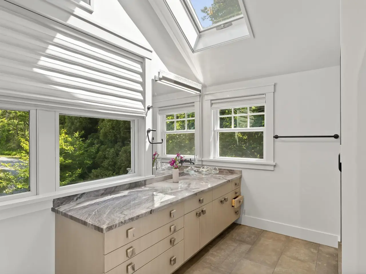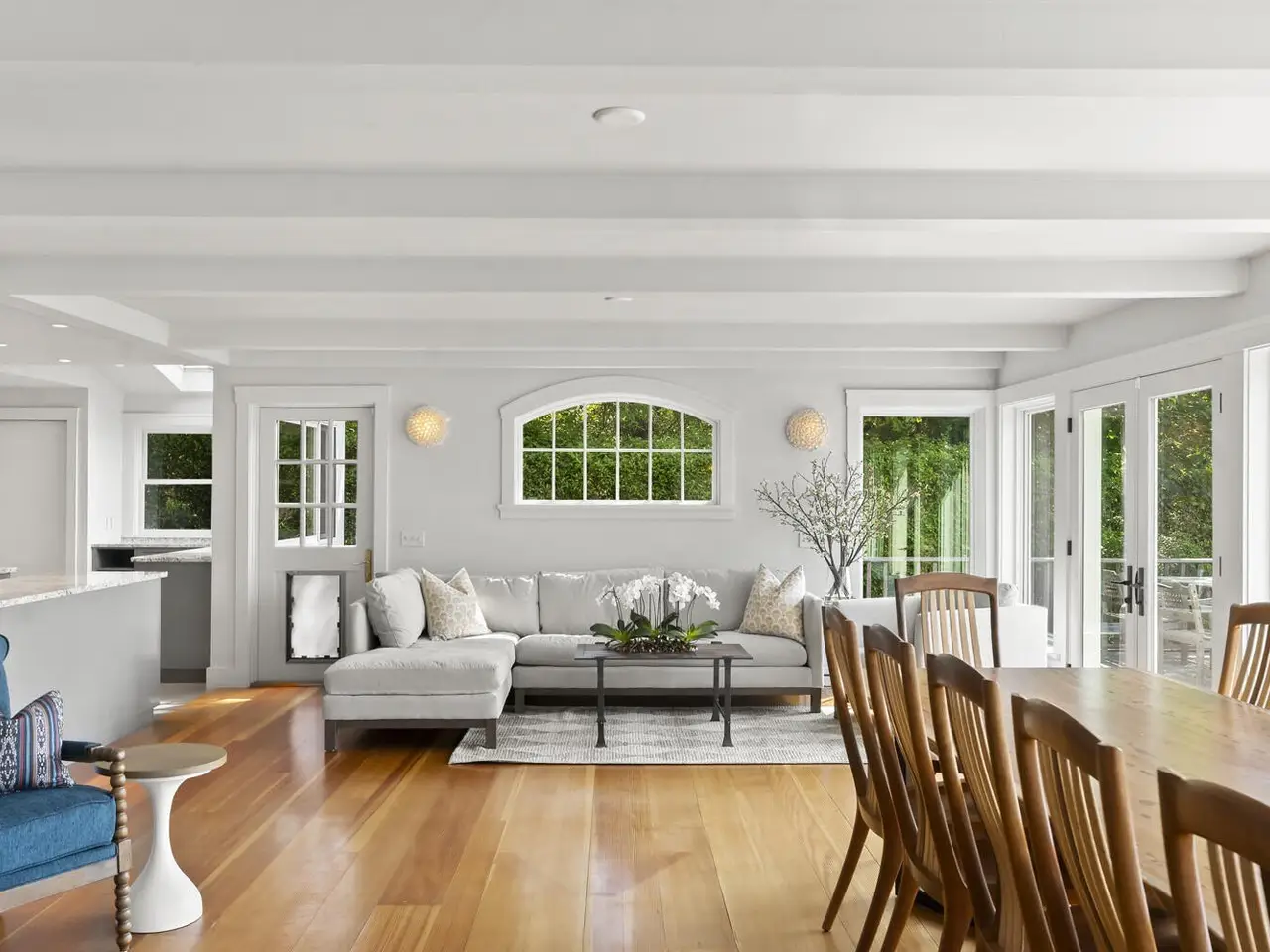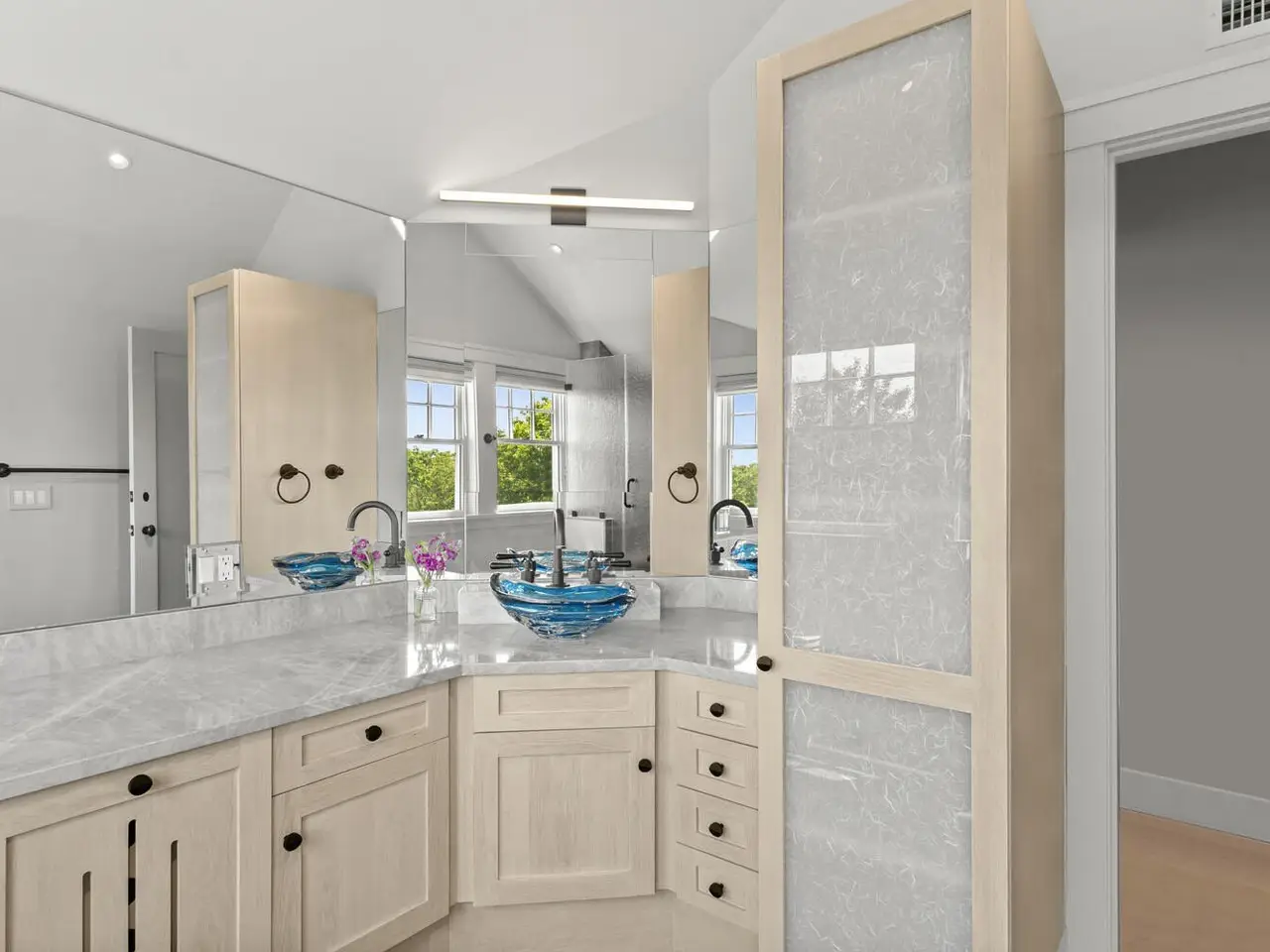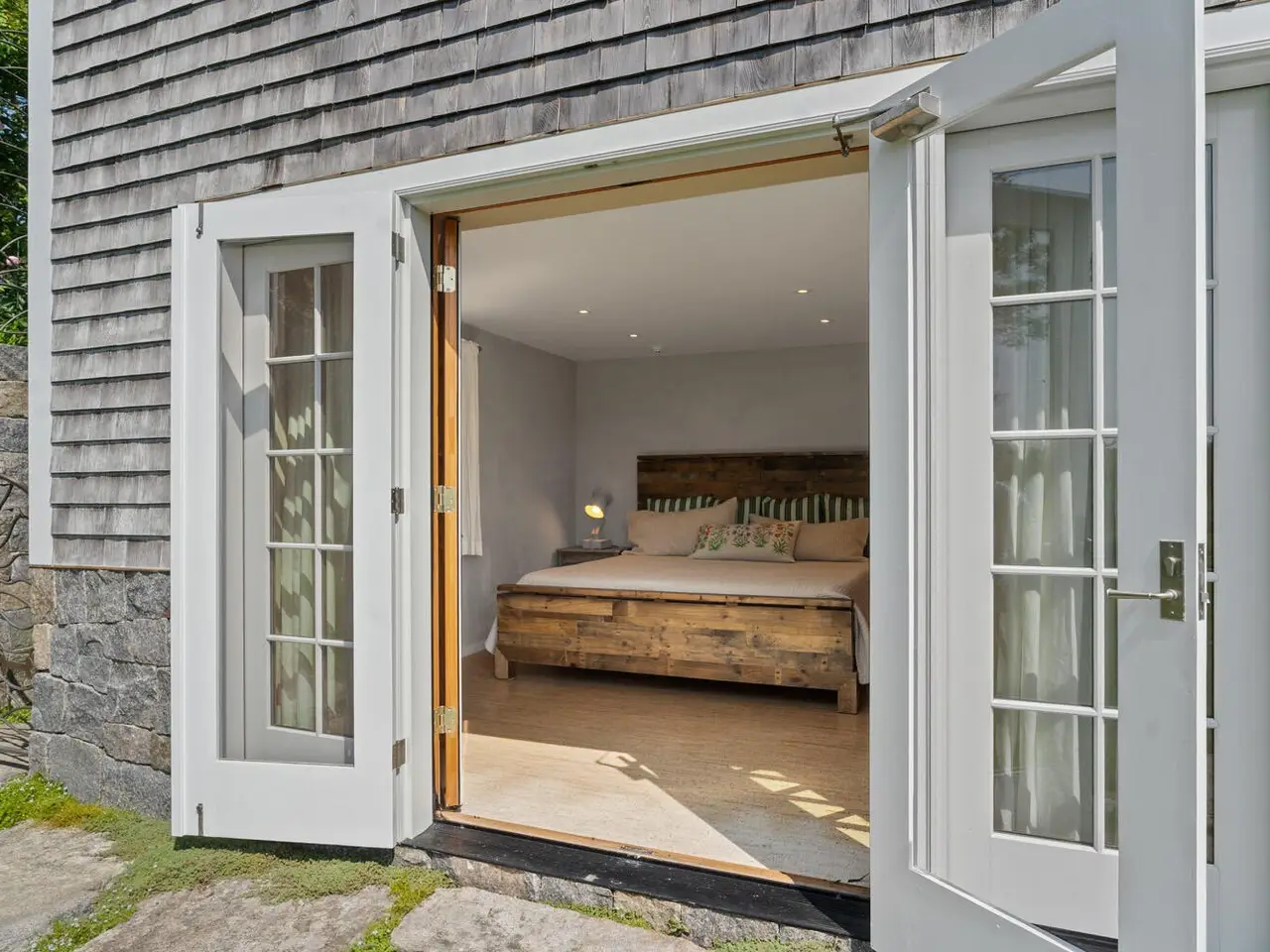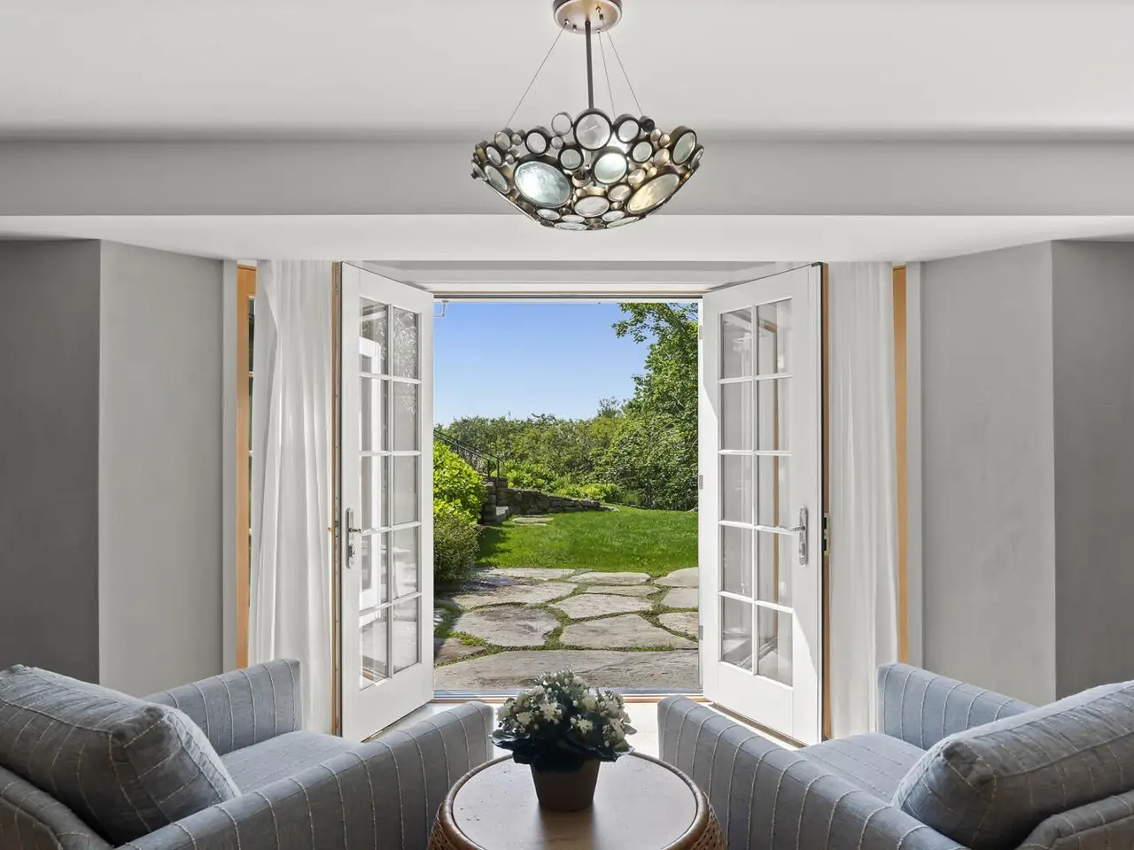 A commanding pond front retreat with a private dock and South Shore views - this exceptional residence offers a rare blend of privacy, elegance, and modern comfort. Originally built by Tom Tate and renovated in 2018, it exudes contemporary sophistication while embracing its natural surroundings. A private dock on Chilmark Pond provides direct water access and stunning South Shore sunsets. Follow a beautifully manicured path-an iconic Vineyard feature-to your dock and cross the pond to your private beach lot. Surrounded by over 7 acres of abutting conservation land, the setting is peaceful and secluded. Meticulously designed gardens enhance the home's timeless charm. The expansive first floor is perfect for entertaining, with open living spaces and a private office. The ground level offers a relaxed lounge with a wet bar and backyard access. Upstairs, a luxurious primary suite spans the entire second floor, featuring two private bathrooms and panoramic water views. More than a home-this is an elegant, serene lifestyle. A separate guest house is also available.