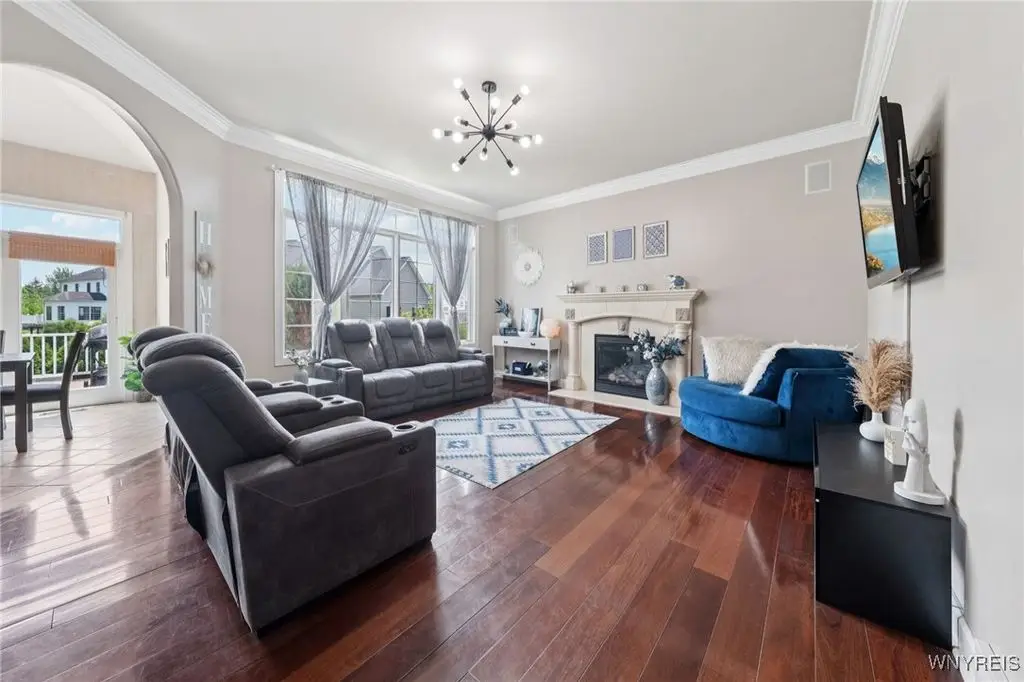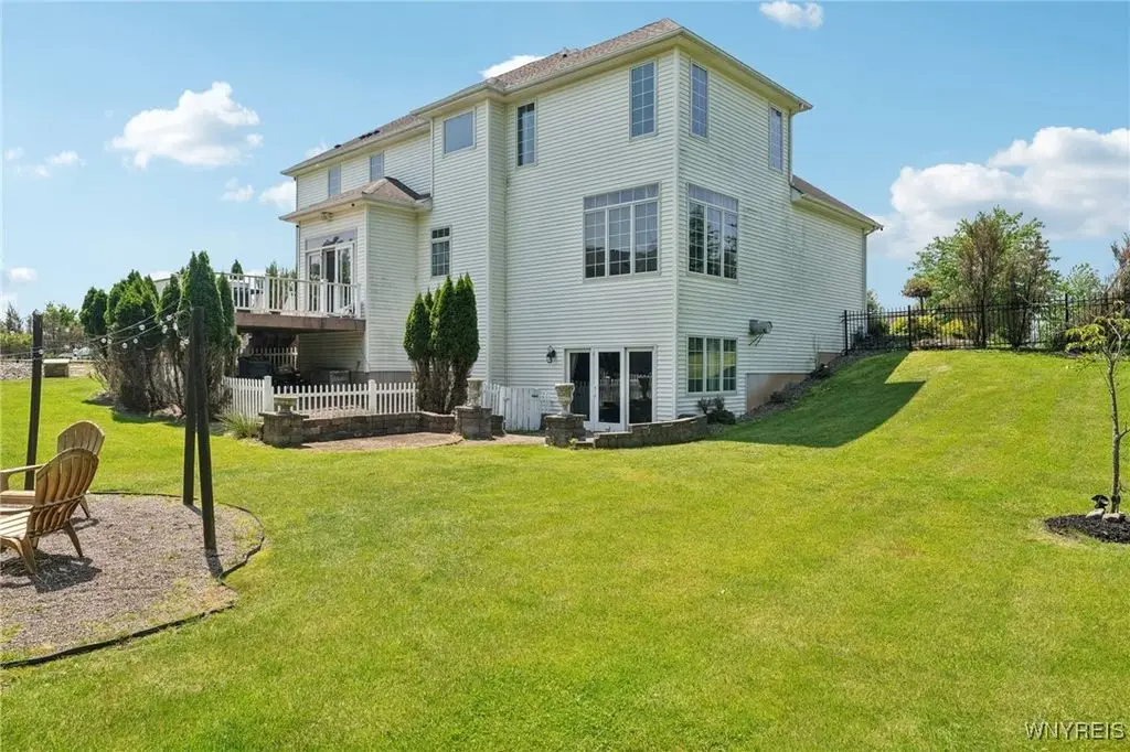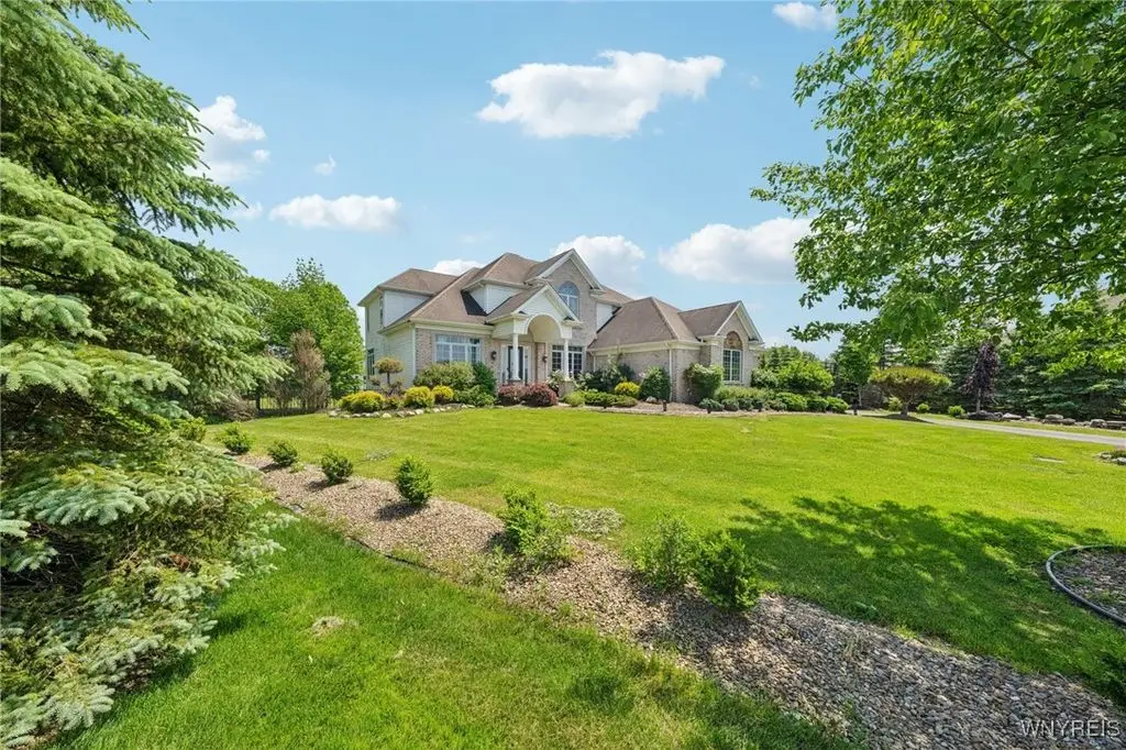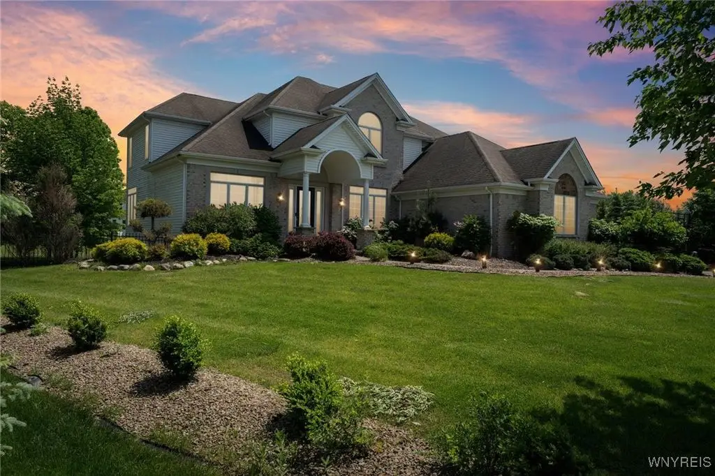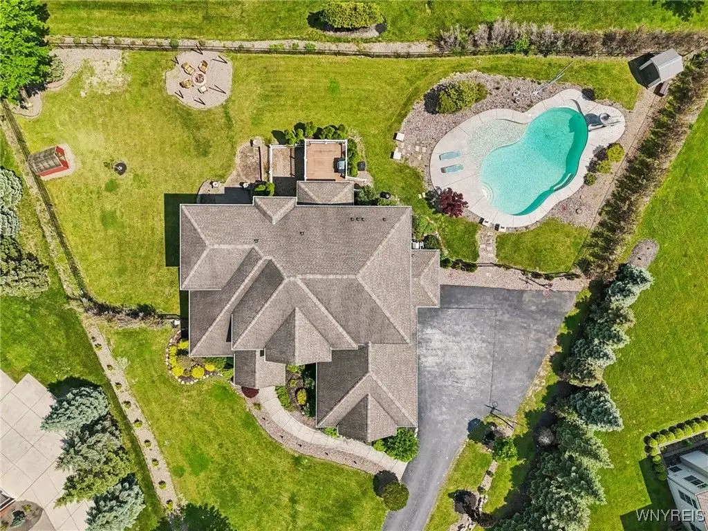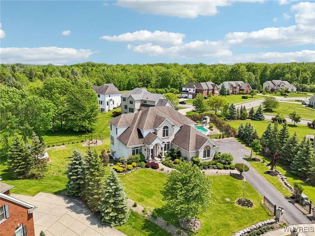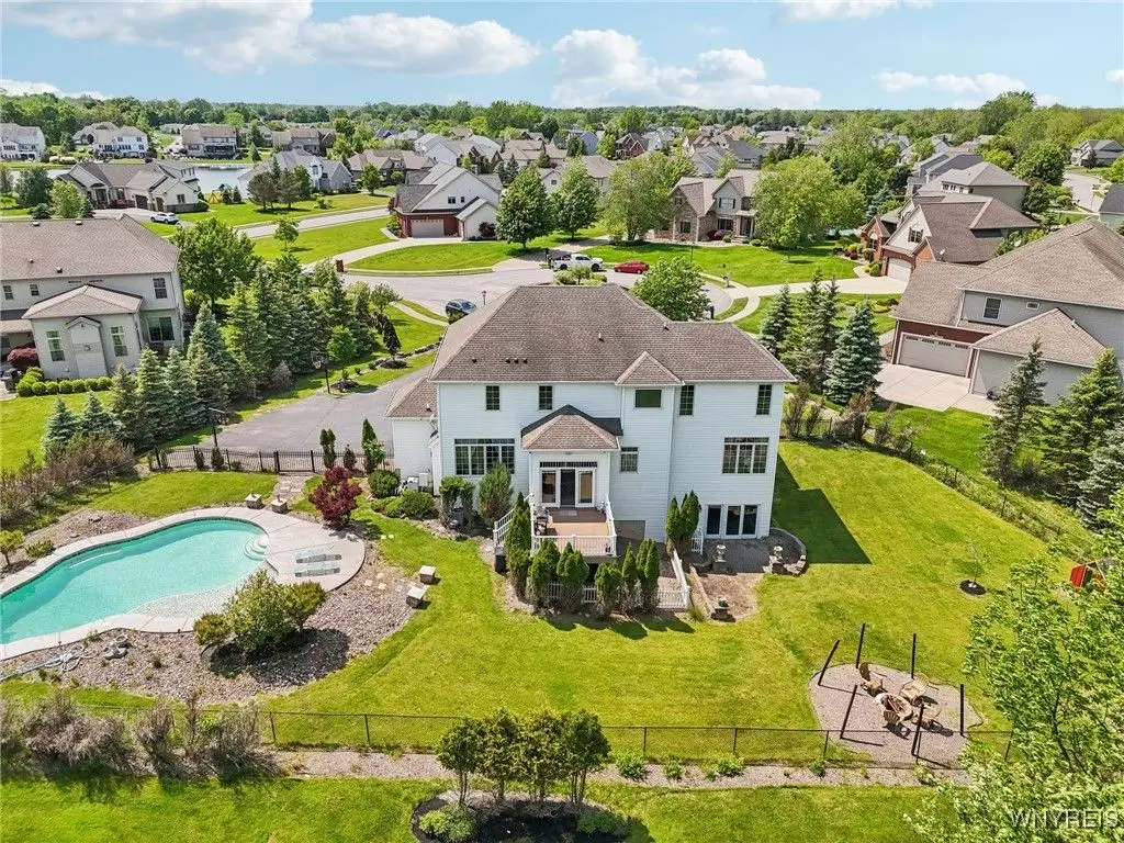 Welcome to 5703 Fairmeadow Court, a stunning 4-bedroom, 3.5-bathroom residence nestled on a cul-de-sac in Clarence Center, NY. This meticulously designed home boasts over 4,100 square feet of luxurious living space, showcasing exquisite craftsmanship and attention to detail. The grand two-story entrance sets the tone for the home's elegance, featuring rich walnut hardwood floors and rounded archways throughout the first floor. The spacious living room is enhanced by a double-sided fireplace creating a warm and inviting atmosphere. The chef's kitchen is a culinary dream, equipped with stainless-steel appliances, granite countertops, a butler's pantry and a convenient first-floor laundry room. The den/study is adorned with 10-foot coffered ceilings. Upstairs, you will find 4 bedrooms and 3 full baths. The master suite offers a serene retreat with a glamour bath and separate shower. The second bedroom enjoys the privacy of its own en-suite bath. The third & fourth bedrooms share a Jack & Jill bathroom. The lower level offers a large finished great room perfect for entertaining or family gathering. Step out the French doors to your private oasis, complete with a custom saltwater pool, a fire pit area and ample green space. The lower level also includes a second private office, a bar room and plenty of storage space. Additional highlights include a three-car attached garage, Pella windows, Zoned heating and cooling with two heating and A/C units, all within the highly rated Clarence School System. This exceptional home offers a wonderful blend of luxury, comfort, and functionality, making it the perfect place to call home.