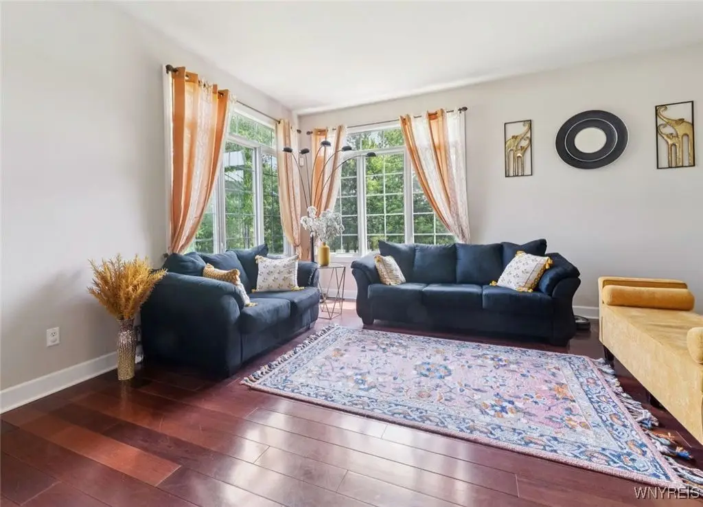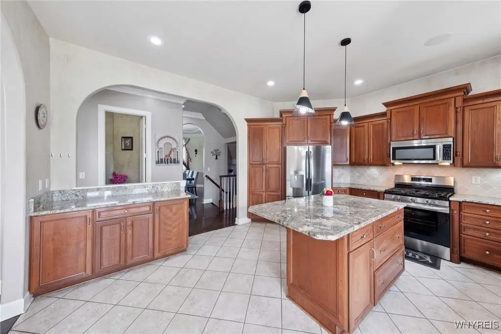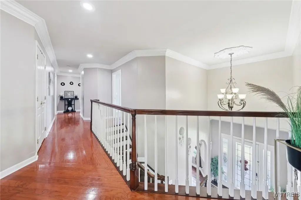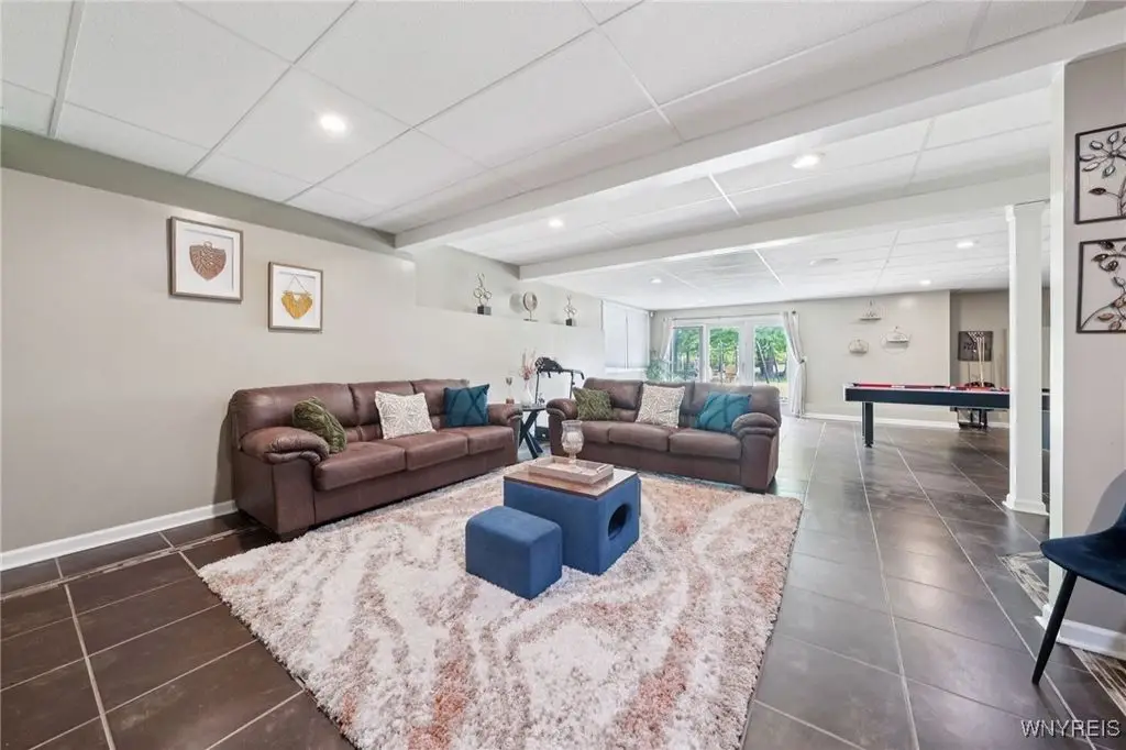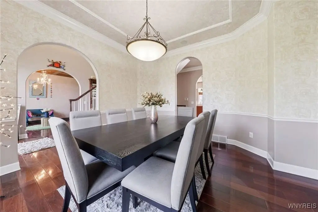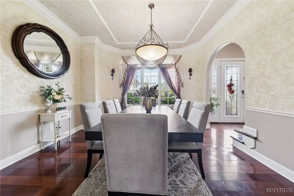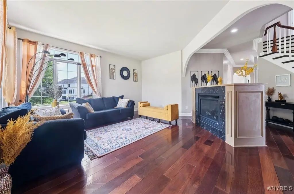 Welcome to 5703 Fairmeadow Court, a stunning 4-bedroom, 3.5-bathroom residence nestled on a cul-de-sac in Clarence Center, NY. This meticulously designed home boasts over 4,100 square feet of luxurious living space, showcasing exquisite craftsmanship and attention to detail. The grand two-story entrance sets the tone for the home's elegance, featuring rich walnut hardwood floors and rounded archways throughout the first floor. The spacious living room is enhanced by a double-sided fireplace creating a warm and inviting atmosphere. The chef's kitchen is a culinary dream, equipped with stainless-steel appliances, granite countertops, a butler's pantry and a convenient first-floor laundry room. The den/study is adorned with 10-foot coffered ceilings. Upstairs, you will find 4 bedrooms and 3 full baths. The master suite offers a serene retreat with a glamour bath and separate shower. The second bedroom enjoys the privacy of its own en-suite bath. The third & fourth bedrooms share a Jack & Jill bathroom. The lower level offers a large finished great room perfect for entertaining or family gathering. Step out the French doors to your private oasis, complete with a custom saltwater pool, a fire pit area and ample green space. The lower level also includes a second private office, a bar room and plenty of storage space. Additional highlights include a three-car attached garage, Pella windows, Zoned heating and cooling with two heating and A/C units, all within the highly rated Clarence School System. This exceptional home offers a wonderful blend of luxury, comfort, and functionality, making it the perfect place to call home.