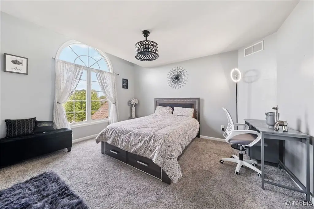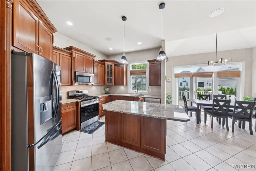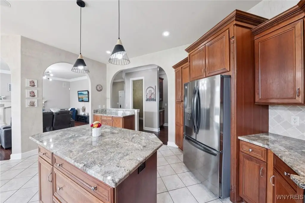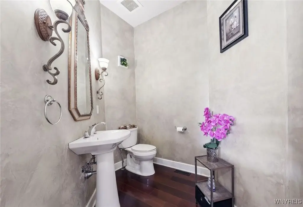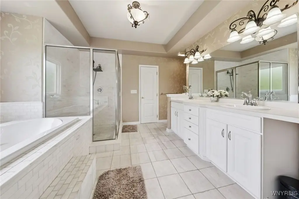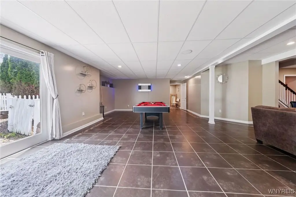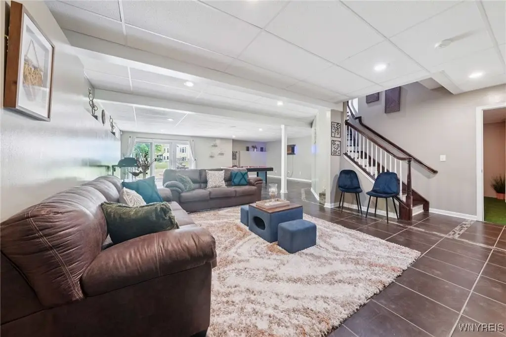 Welcome to 5703 Fairmeadow Court, a stunning 4-bedroom, 3.5-bathroom residence nestled on a cul-de-sac in Clarence Center, NY. This meticulously designed home boasts over 4,100 square feet of luxurious living space, showcasing exquisite craftsmanship and attention to detail. The grand two-story entrance sets the tone for the home's elegance, featuring rich walnut hardwood floors and rounded archways throughout the first floor. The spacious living room is enhanced by a double-sided fireplace creating a warm and inviting atmosphere. The chef's kitchen is a culinary dream, equipped with stainless-steel appliances, granite countertops, a butler's pantry and a convenient first-floor laundry room. The den/study is adorned with 10-foot coffered ceilings. Upstairs, you will find 4 bedrooms and 3 full baths. The master suite offers a serene retreat with a glamour bath and separate shower. The second bedroom enjoys the privacy of its own en-suite bath. The third & fourth bedrooms share a Jack & Jill bathroom. The lower level offers a large finished great room perfect for entertaining or family gathering. Step out the French doors to your private oasis, complete with a custom saltwater pool, a fire pit area and ample green space. The lower level also includes a second private office, a bar room and plenty of storage space. Additional highlights include a three-car attached garage, Pella windows, Zoned heating and cooling with two heating and A/C units, all within the highly rated Clarence School System. This exceptional home offers a wonderful blend of luxury, comfort, and functionality, making it the perfect place to call home.