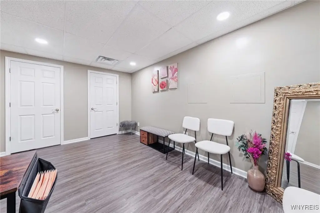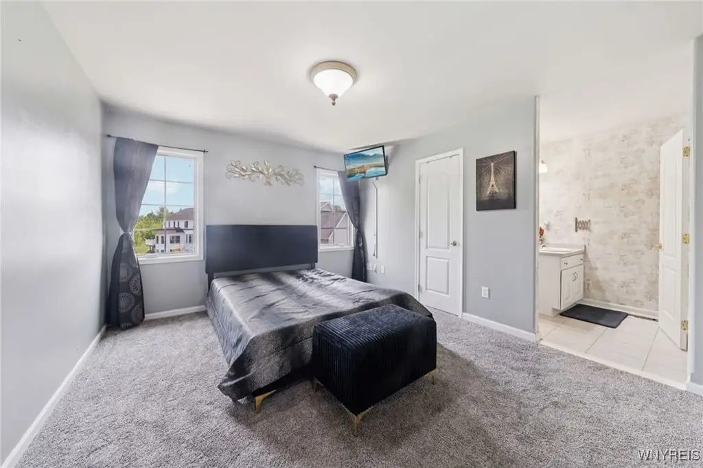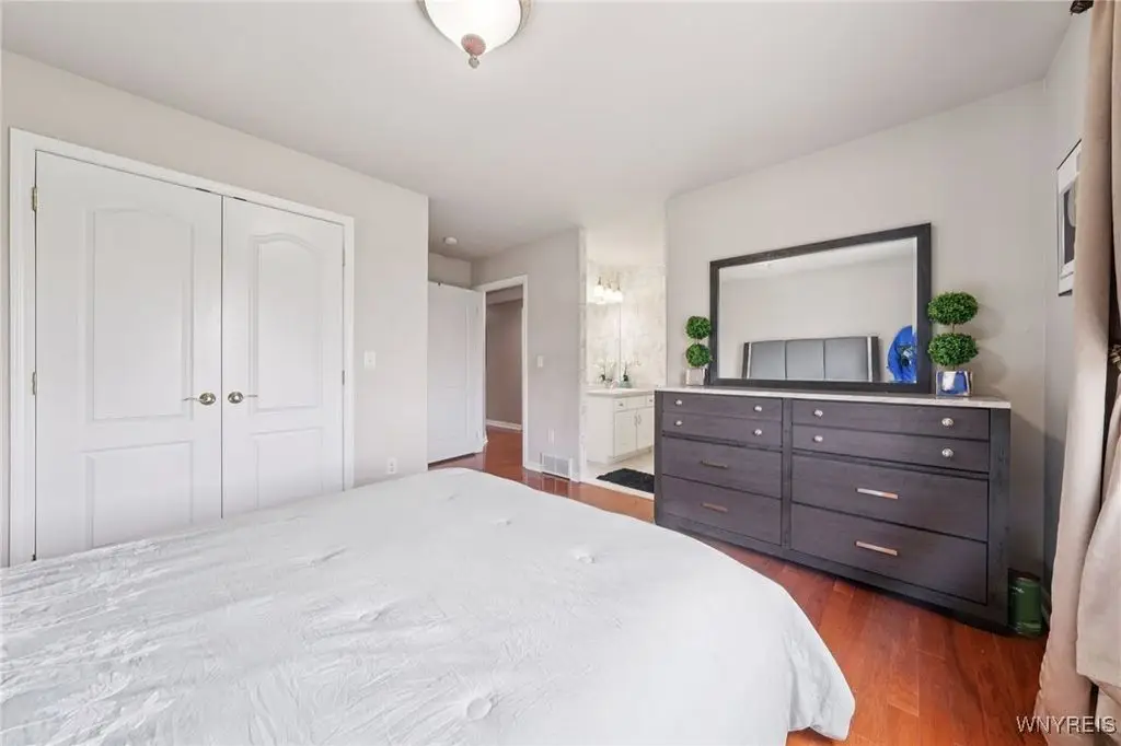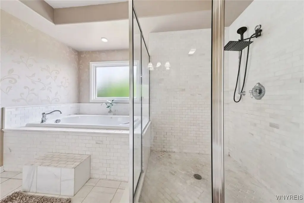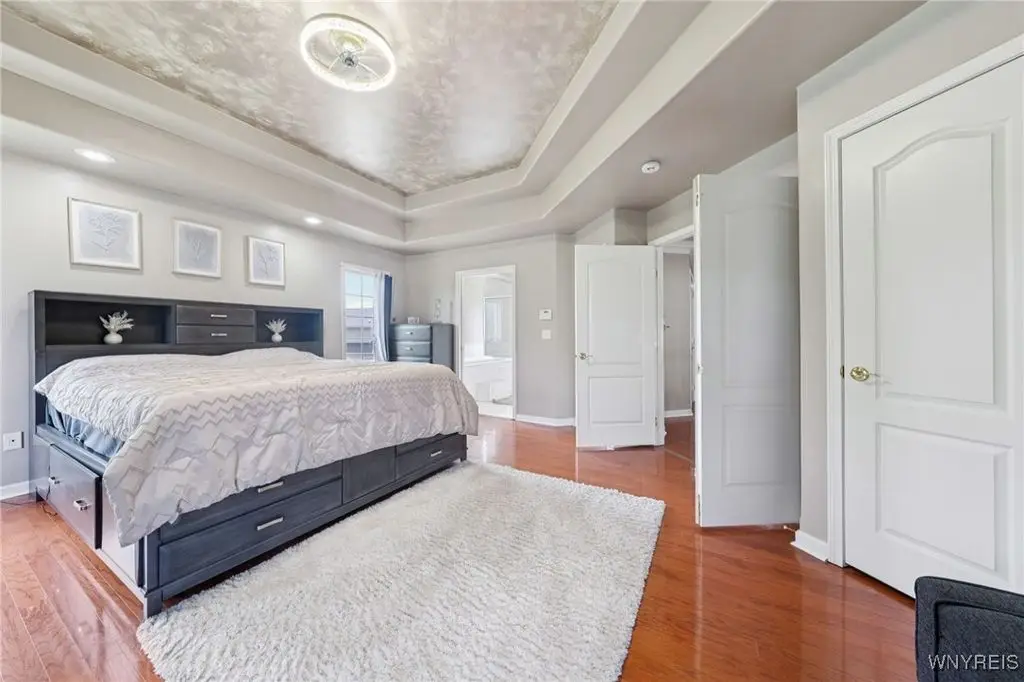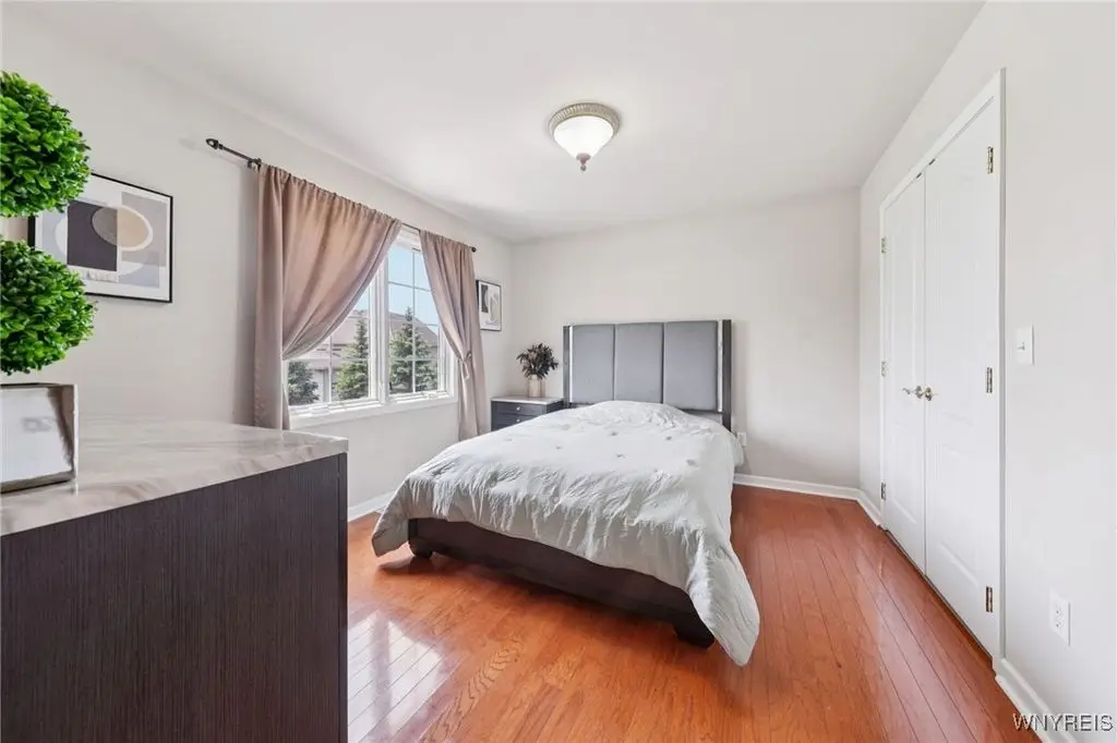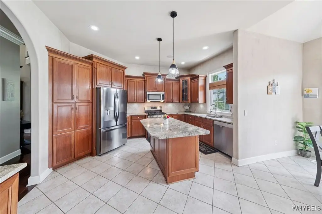 Welcome to 5703 Fairmeadow Court, a stunning 4-bedroom, 3.5-bathroom residence nestled on a cul-de-sac in Clarence Center, NY. This meticulously designed home boasts over 4,100 square feet of luxurious living space, showcasing exquisite craftsmanship and attention to detail. The grand two-story entrance sets the tone for the home's elegance, featuring rich walnut hardwood floors and rounded archways throughout the first floor. The spacious living room is enhanced by a double-sided fireplace creating a warm and inviting atmosphere. The chef's kitchen is a culinary dream, equipped with stainless-steel appliances, granite countertops, a butler's pantry and a convenient first-floor laundry room. The den/study is adorned with 10-foot coffered ceilings. Upstairs, you will find 4 bedrooms and 3 full baths. The master suite offers a serene retreat with a glamour bath and separate shower. The second bedroom enjoys the privacy of its own en-suite bath. The third & fourth bedrooms share a Jack & Jill bathroom. The lower level offers a large finished great room perfect for entertaining or family gathering. Step out the French doors to your private oasis, complete with a custom saltwater pool, a fire pit area and ample green space. The lower level also includes a second private office, a bar room and plenty of storage space. Additional highlights include a three-car attached garage, Pella windows, Zoned heating and cooling with two heating and A/C units, all within the highly rated Clarence School System. This exceptional home offers a wonderful blend of luxury, comfort, and functionality, making it the perfect place to call home.