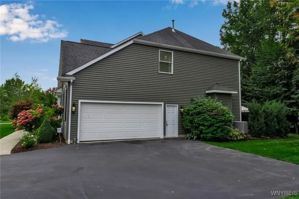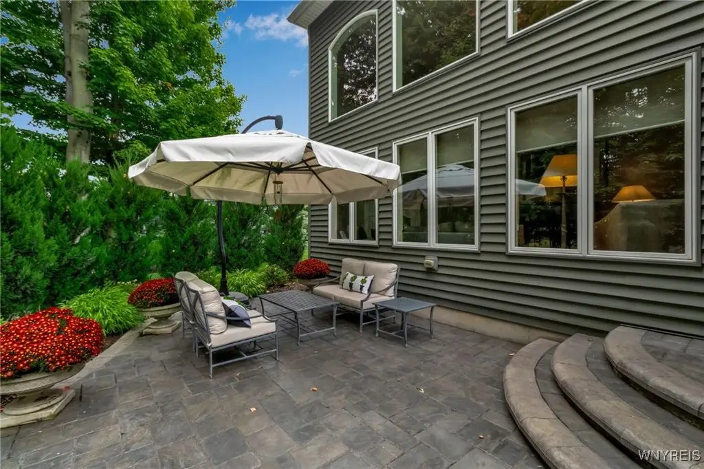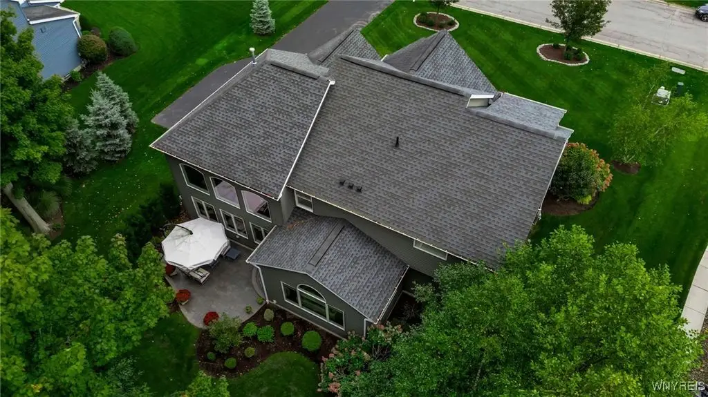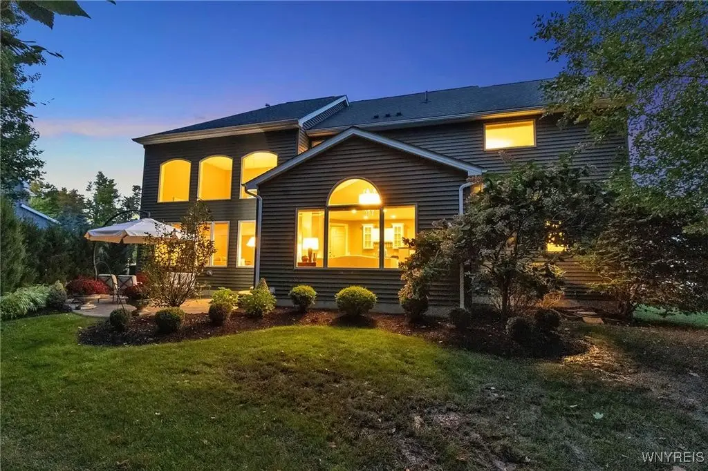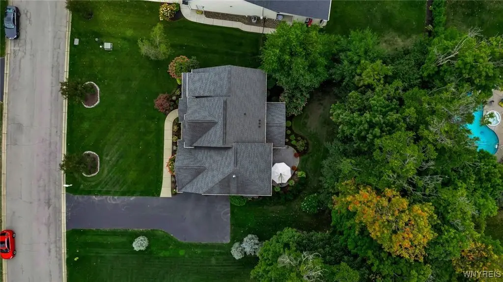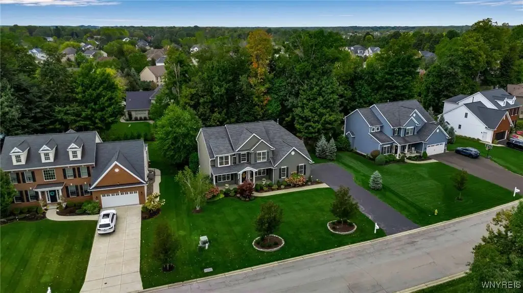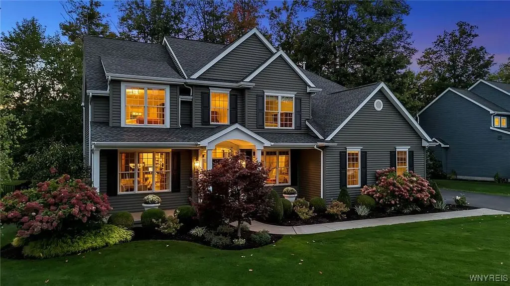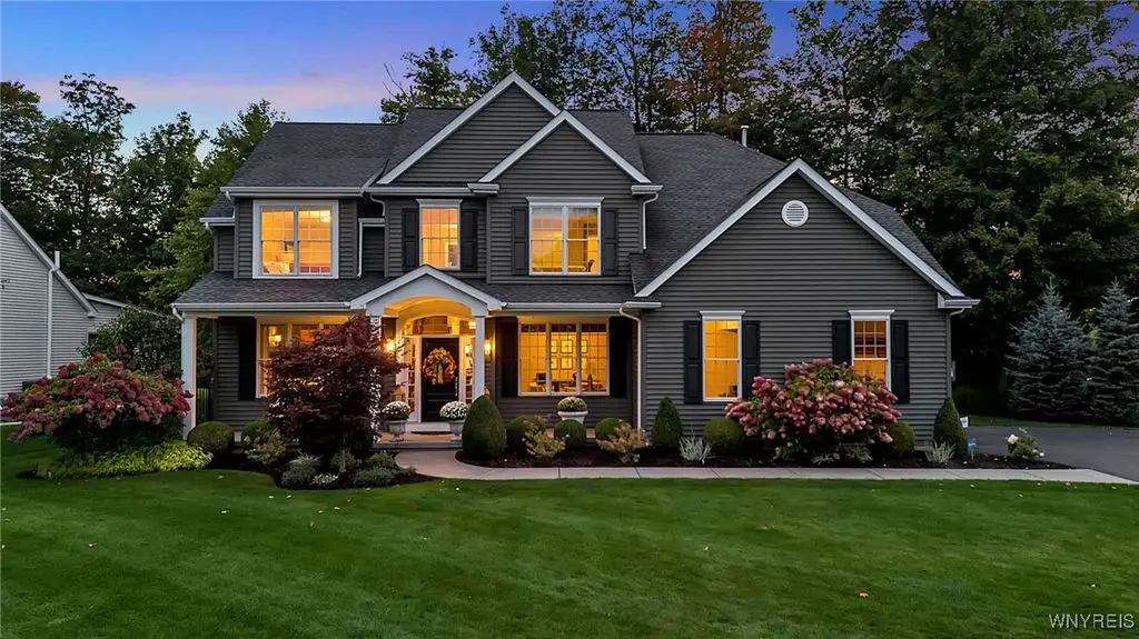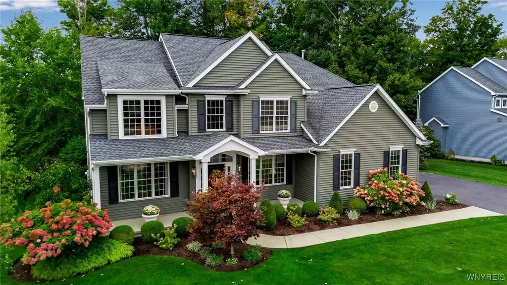 This sophisticated 4-bed, 2.5-bath colonial, w/its stunning curb appeal & beautiful landscaping, sets the tone for a wonderful living experience, seamlessly blending timeless finishes w/beautiful upgrades. As you approach the inviting entrance, a large covered front porch welcomes you to the two-story foyer, where gleaming hardwood floors extend throughout the first floor, adding warmth & richness to the space. The stunning dining room, enhanced with crown molding & wainscoting, adds a sophisticated touch that complements the home's refined character. The kit features granite countertops, stainless steel appliances, a center isle w/a breakfast bar, a walk-in pantry with custom shelving, & a spacious eating area. The great room flows seamlessly from the kitchen & features stunning double-stacked windows, a gas fireplace, & soaring ceilings, creating a comfortable yet luxurious space to relax. The sunroom, surrounded by beautiful windows, is a wonderful addition to the home, perfect for entertaining or relaxing. Off the foyer, the den w/French doors serves as an ideal workspace or quiet retreat. Upstairs, you will find 4 generously sized bedrooms. The spacious primary suite features a large walk-in closet with California custom Closets, an en-suite bathroom that includes a soaking tub, a shower, a double vanity, & a separate water closet. The 3 additional bedrooms are nicely sized & feature new wall-to-wall carpeting. Additionally, the home features a laundry room, a half bath, & a mudroom w/built-in custom shelving offering ample storage space. The backyard is spectacular, featuring a beautiful stone paver patio surrounded by lush landscaping & lovely gardens. Additional features include an irrigation system with added drip lines for watering planters, a security system, custom blinds & window treatments throughout. The home features an abundance of closet space, including several closets equipped w/California custom Closets. The 2.5-car attached side-load garage w/storage space leads to the mudroom. Home is mins to the bike path & all the conveniences for day-to-day living & commute to all suburbs & downtown. Highly rated Clarence Schools!