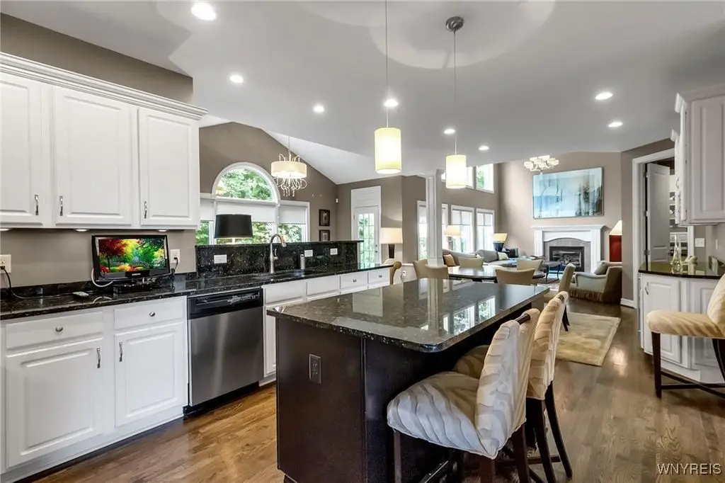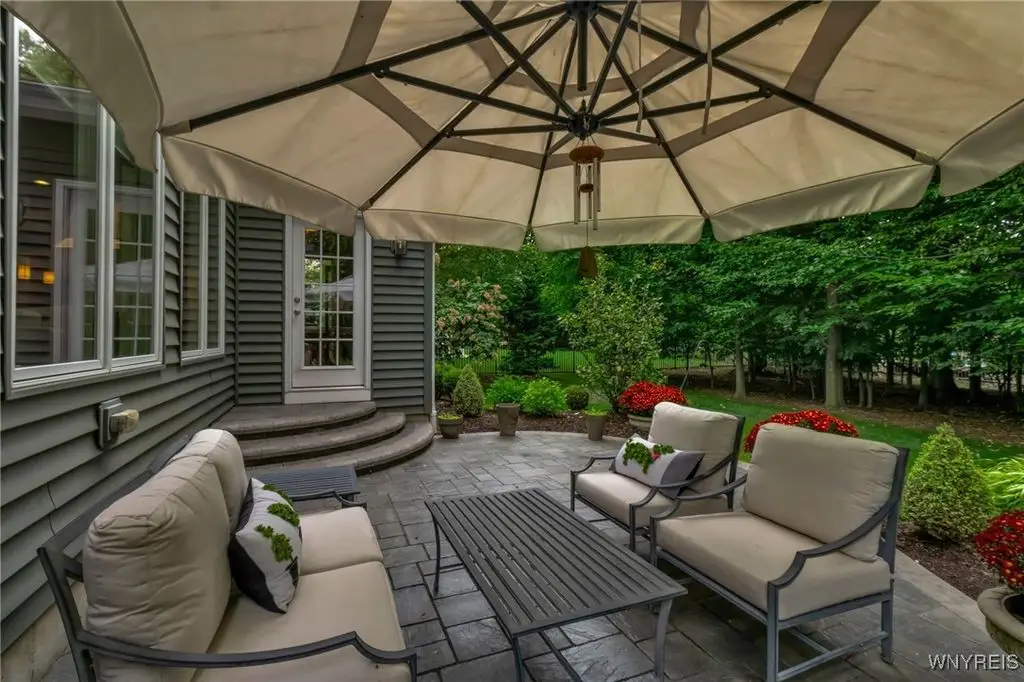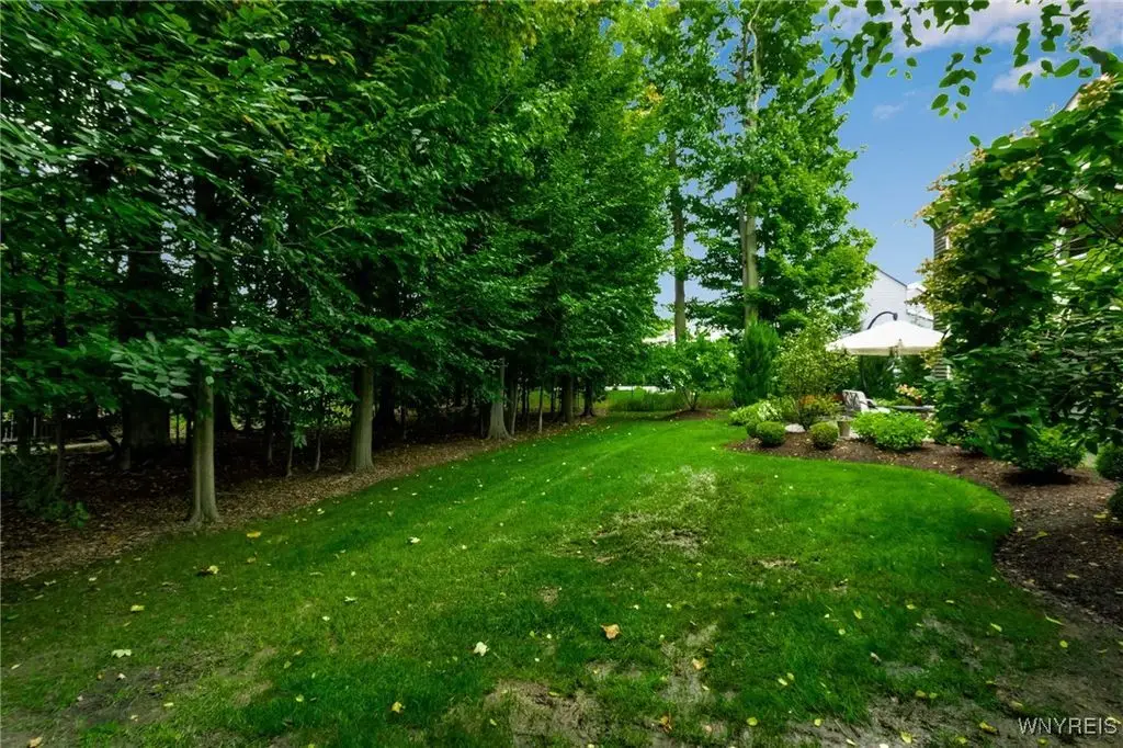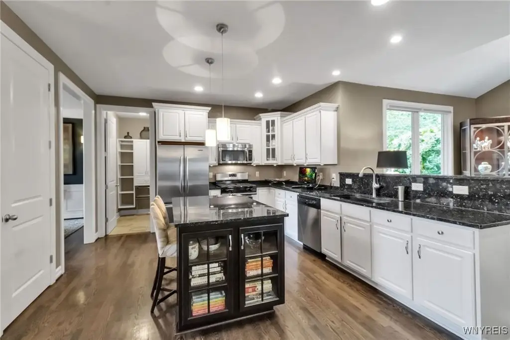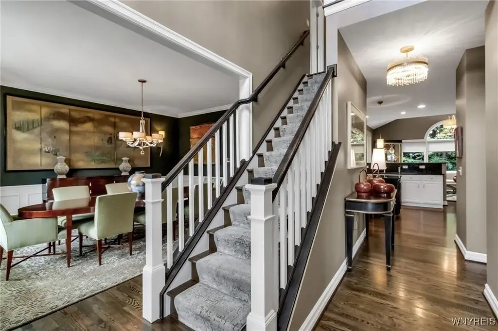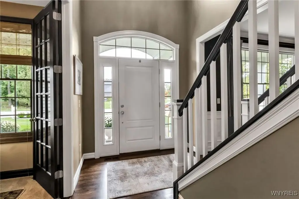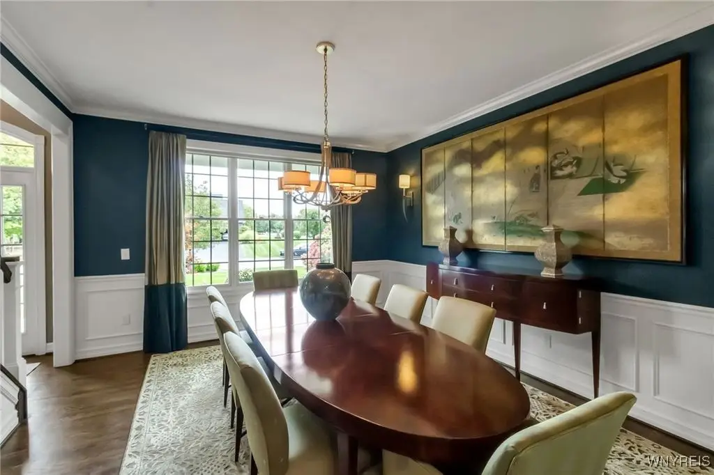 This sophisticated 4-bed, 2.5-bath colonial, w/its stunning curb appeal & beautiful landscaping, sets the tone for a wonderful living experience, seamlessly blending timeless finishes w/beautiful upgrades. As you approach the inviting entrance, a large covered front porch welcomes you to the two-story foyer, where gleaming hardwood floors extend throughout the first floor, adding warmth & richness to the space. The stunning dining room, enhanced with crown molding & wainscoting, adds a sophisticated touch that complements the home's refined character. The kit features granite countertops, stainless steel appliances, a center isle w/a breakfast bar, a walk-in pantry with custom shelving, & a spacious eating area. The great room flows seamlessly from the kitchen & features stunning double-stacked windows, a gas fireplace, & soaring ceilings, creating a comfortable yet luxurious space to relax. The sunroom, surrounded by beautiful windows, is a wonderful addition to the home, perfect for entertaining or relaxing. Off the foyer, the den w/French doors serves as an ideal workspace or quiet retreat. Upstairs, you will find 4 generously sized bedrooms. The spacious primary suite features a large walk-in closet with California custom Closets, an en-suite bathroom that includes a soaking tub, a shower, a double vanity, & a separate water closet. The 3 additional bedrooms are nicely sized & feature new wall-to-wall carpeting. Additionally, the home features a laundry room, a half bath, & a mudroom w/built-in custom shelving offering ample storage space. The backyard is spectacular, featuring a beautiful stone paver patio surrounded by lush landscaping & lovely gardens. Additional features include an irrigation system with added drip lines for watering planters, a security system, custom blinds & window treatments throughout. The home features an abundance of closet space, including several closets equipped w/California custom Closets. The 2.5-car attached side-load garage w/storage space leads to the mudroom. Home is mins to the bike path & all the conveniences for day-to-day living & commute to all suburbs & downtown. Highly rated Clarence Schools!
