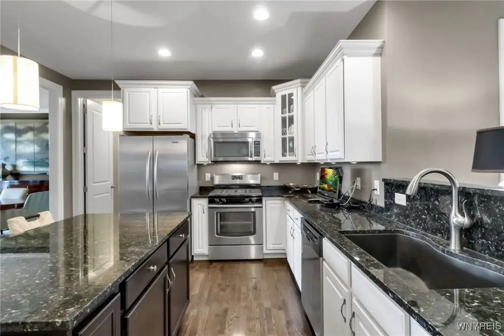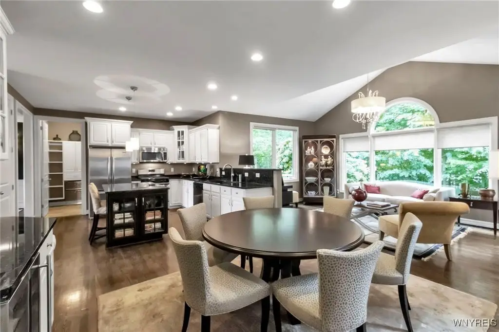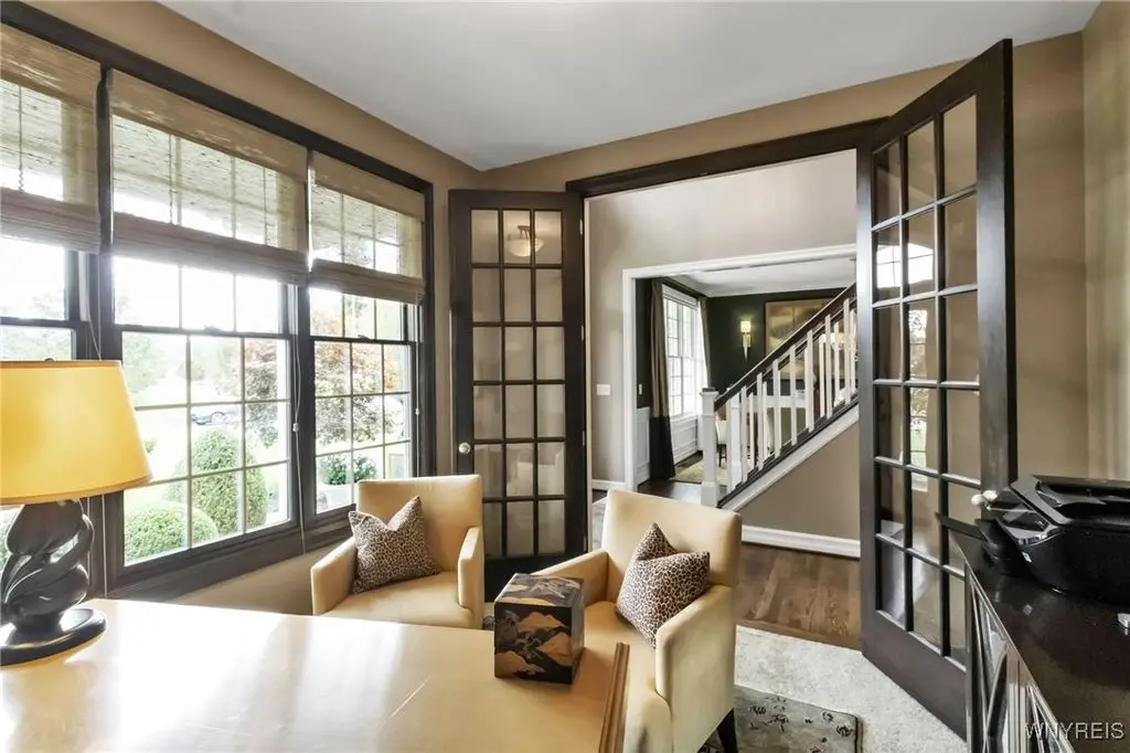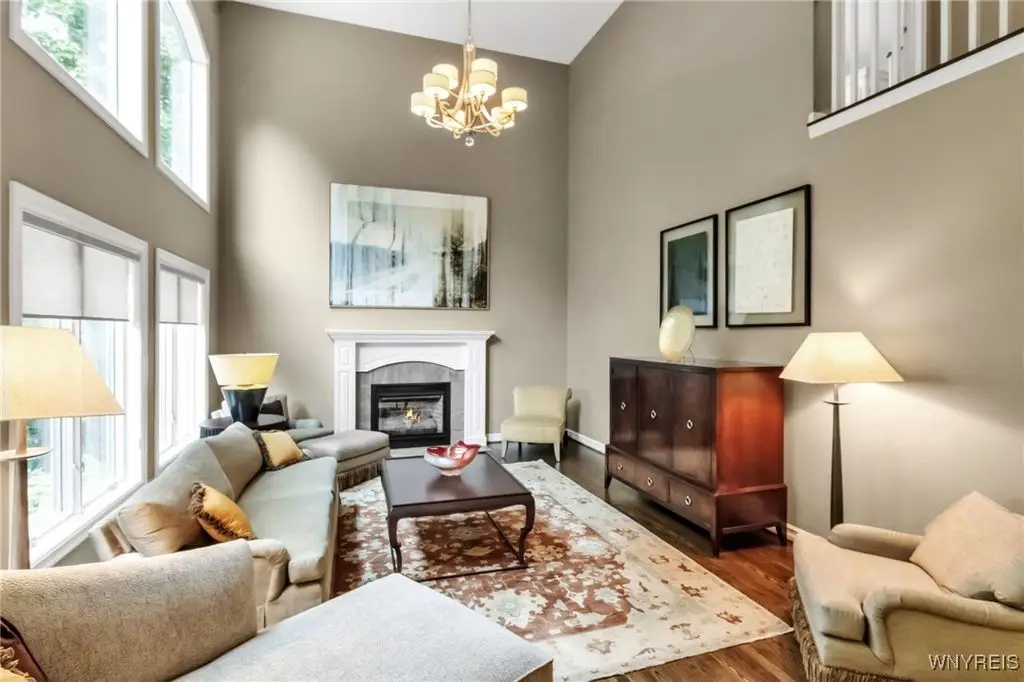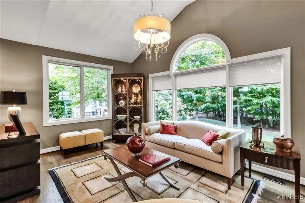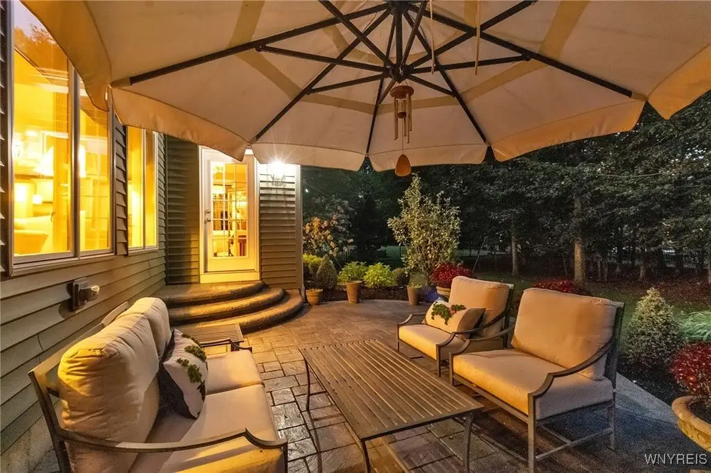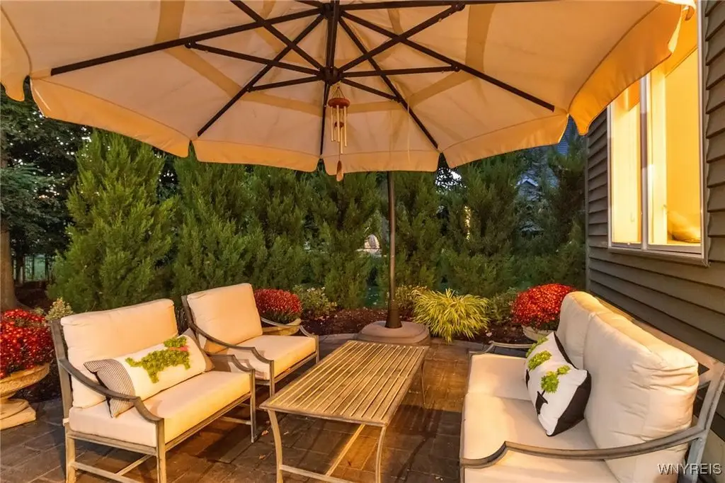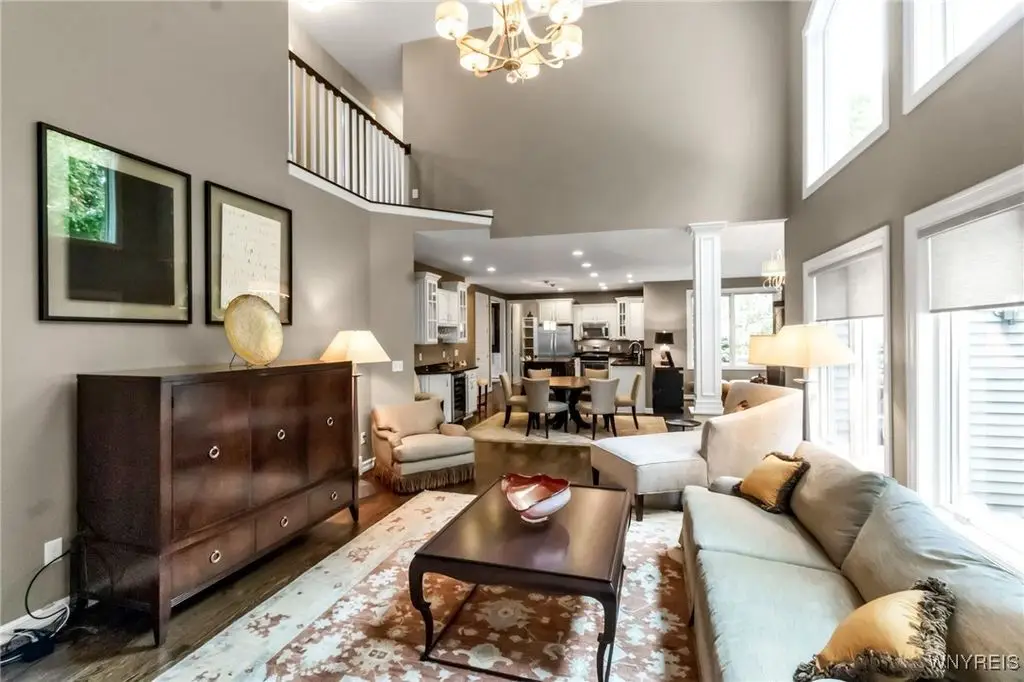 This sophisticated 4-bed, 2.5-bath colonial, w/its stunning curb appeal & beautiful landscaping, sets the tone for a wonderful living experience, seamlessly blending timeless finishes w/beautiful upgrades. As you approach the inviting entrance, a large covered front porch welcomes you to the two-story foyer, where gleaming hardwood floors extend throughout the first floor, adding warmth & richness to the space. The stunning dining room, enhanced with crown molding & wainscoting, adds a sophisticated touch that complements the home's refined character. The kit features granite countertops, stainless steel appliances, a center isle w/a breakfast bar, a walk-in pantry with custom shelving, & a spacious eating area. The great room flows seamlessly from the kitchen & features stunning double-stacked windows, a gas fireplace, & soaring ceilings, creating a comfortable yet luxurious space to relax. The sunroom, surrounded by beautiful windows, is a wonderful addition to the home, perfect for entertaining or relaxing. Off the foyer, the den w/French doors serves as an ideal workspace or quiet retreat. Upstairs, you will find 4 generously sized bedrooms. The spacious primary suite features a large walk-in closet with California custom Closets, an en-suite bathroom that includes a soaking tub, a shower, a double vanity, & a separate water closet. The 3 additional bedrooms are nicely sized & feature new wall-to-wall carpeting. Additionally, the home features a laundry room, a half bath, & a mudroom w/built-in custom shelving offering ample storage space. The backyard is spectacular, featuring a beautiful stone paver patio surrounded by lush landscaping & lovely gardens. Additional features include an irrigation system with added drip lines for watering planters, a security system, custom blinds & window treatments throughout. The home features an abundance of closet space, including several closets equipped w/California custom Closets. The 2.5-car attached side-load garage w/storage space leads to the mudroom. Home is mins to the bike path & all the conveniences for day-to-day living & commute to all suburbs & downtown. Highly rated Clarence Schools!