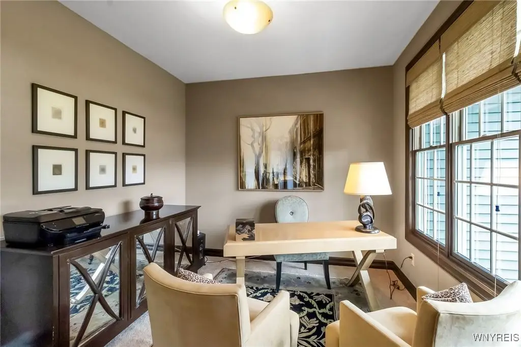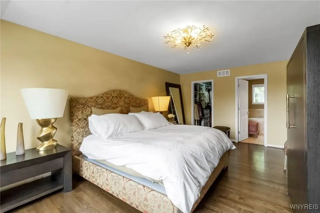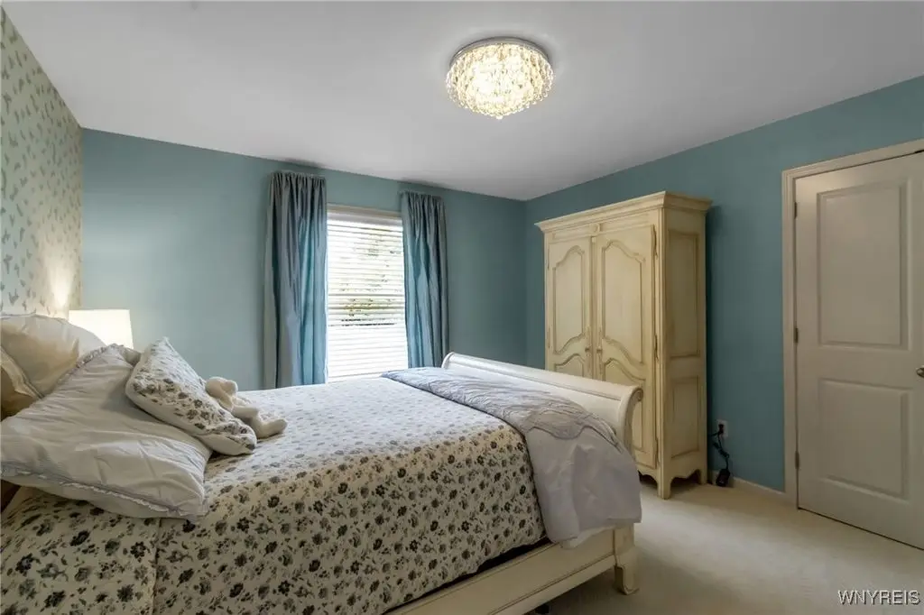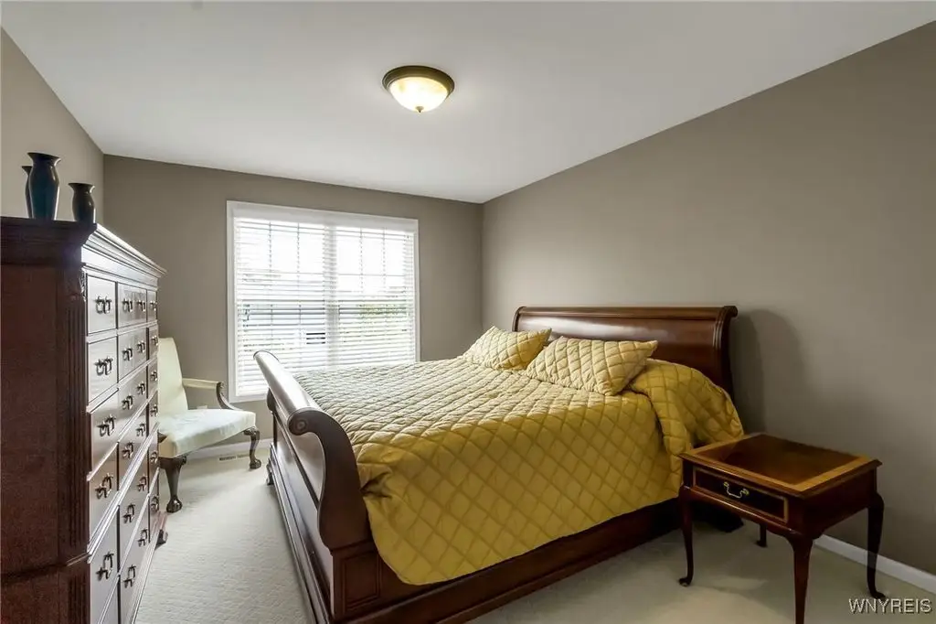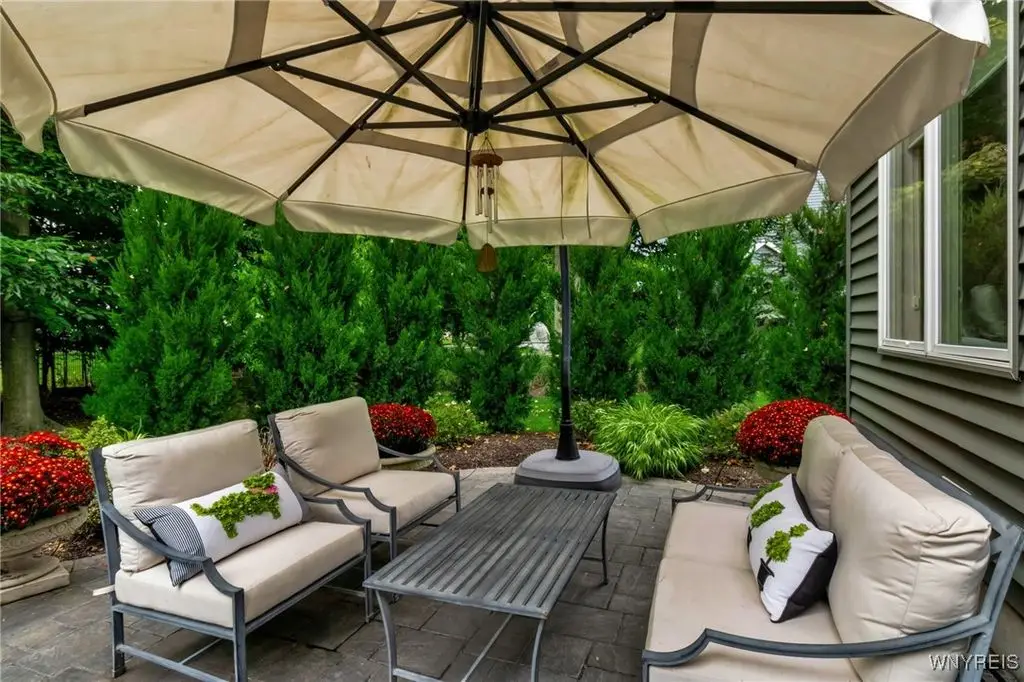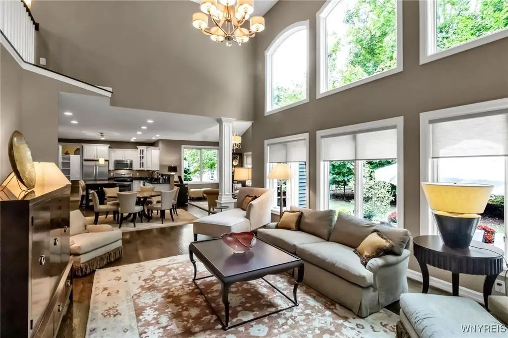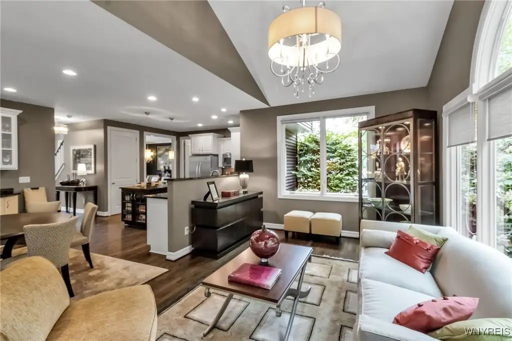 This sophisticated 4-bed, 2.5-bath colonial, w/its stunning curb appeal & beautiful landscaping, sets the tone for a wonderful living experience, seamlessly blending timeless finishes w/beautiful upgrades. As you approach the inviting entrance, a large covered front porch welcomes you to the two-story foyer, where gleaming hardwood floors extend throughout the first floor, adding warmth & richness to the space. The stunning dining room, enhanced with crown molding & wainscoting, adds a sophisticated touch that complements the home's refined character. The kit features granite countertops, stainless steel appliances, a center isle w/a breakfast bar, a walk-in pantry with custom shelving, & a spacious eating area. The great room flows seamlessly from the kitchen & features stunning double-stacked windows, a gas fireplace, & soaring ceilings, creating a comfortable yet luxurious space to relax. The sunroom, surrounded by beautiful windows, is a wonderful addition to the home, perfect for entertaining or relaxing. Off the foyer, the den w/French doors serves as an ideal workspace or quiet retreat. Upstairs, you will find 4 generously sized bedrooms. The spacious primary suite features a large walk-in closet with California custom Closets, an en-suite bathroom that includes a soaking tub, a shower, a double vanity, & a separate water closet. The 3 additional bedrooms are nicely sized & feature new wall-to-wall carpeting. Additionally, the home features a laundry room, a half bath, & a mudroom w/built-in custom shelving offering ample storage space. The backyard is spectacular, featuring a beautiful stone paver patio surrounded by lush landscaping & lovely gardens. Additional features include an irrigation system with added drip lines for watering planters, a security system, custom blinds & window treatments throughout. The home features an abundance of closet space, including several closets equipped w/California custom Closets. The 2.5-car attached side-load garage w/storage space leads to the mudroom. Home is mins to the bike path & all the conveniences for day-to-day living & commute to all suburbs & downtown. Highly rated Clarence Schools!