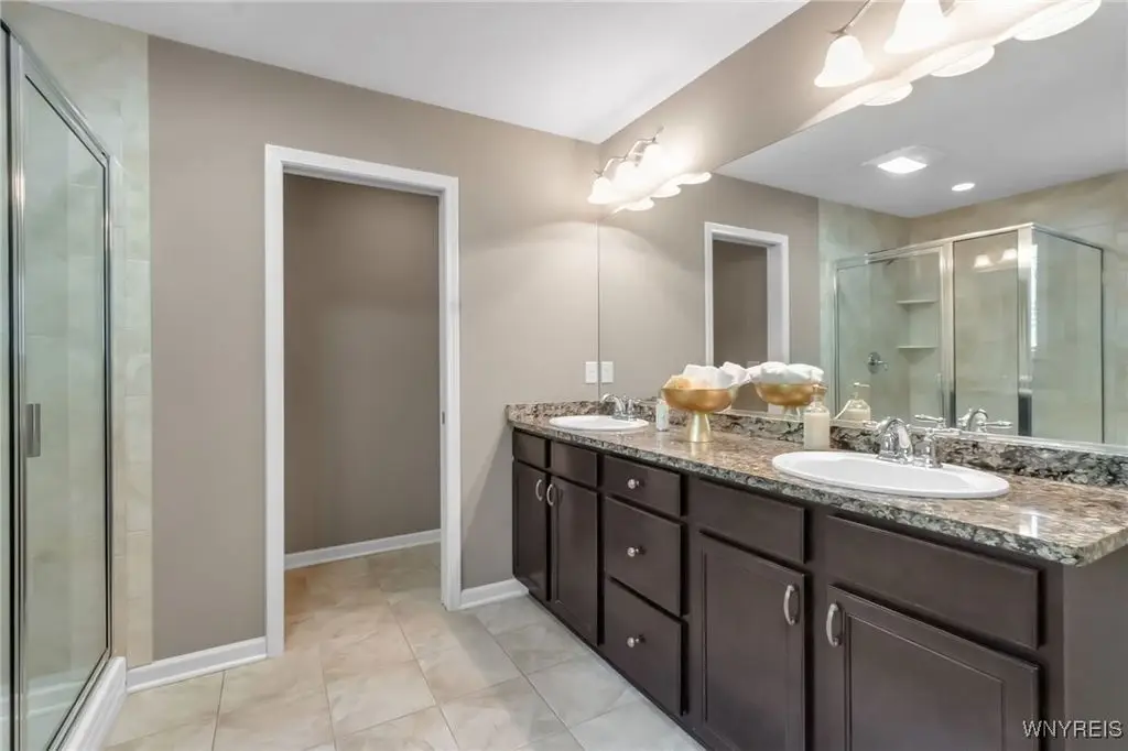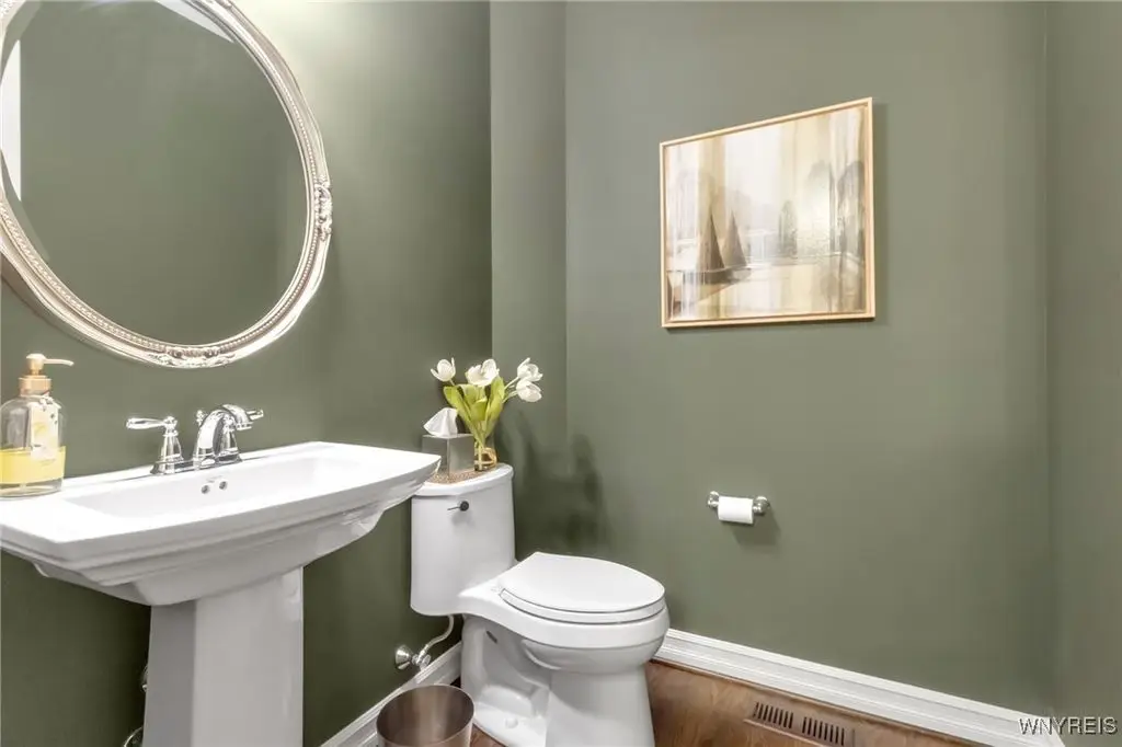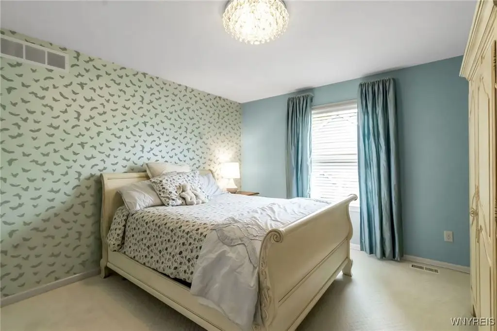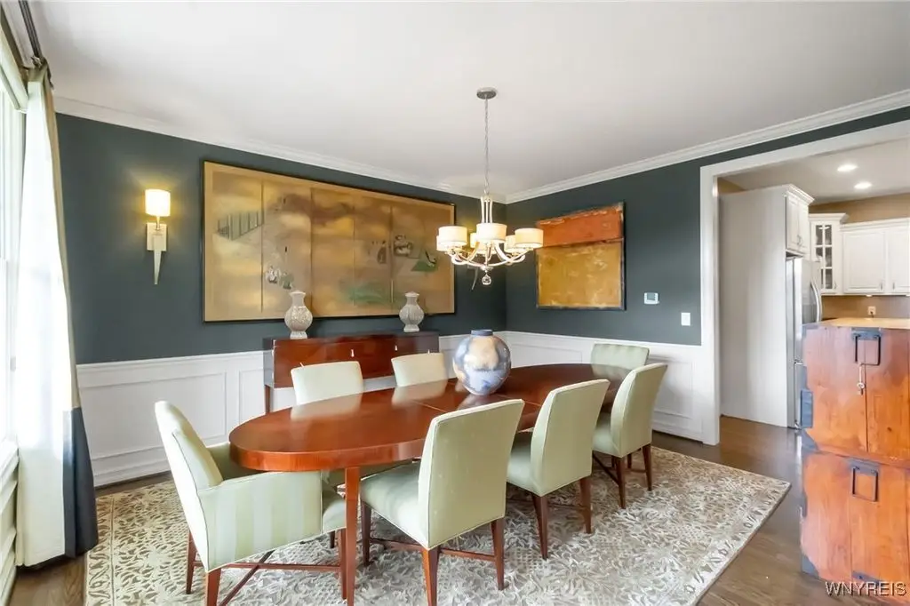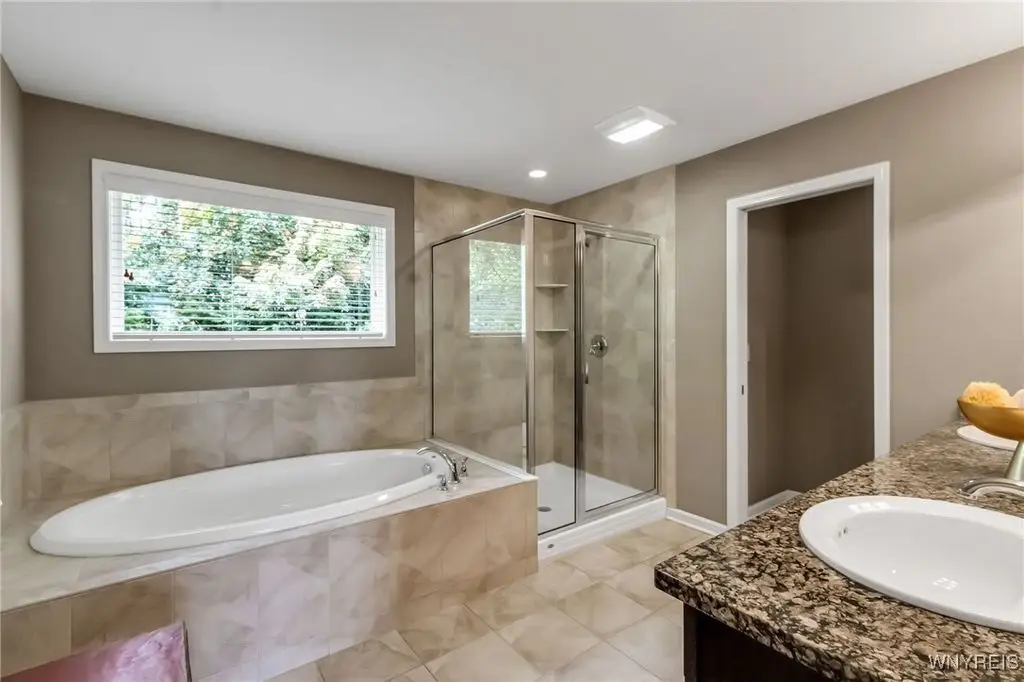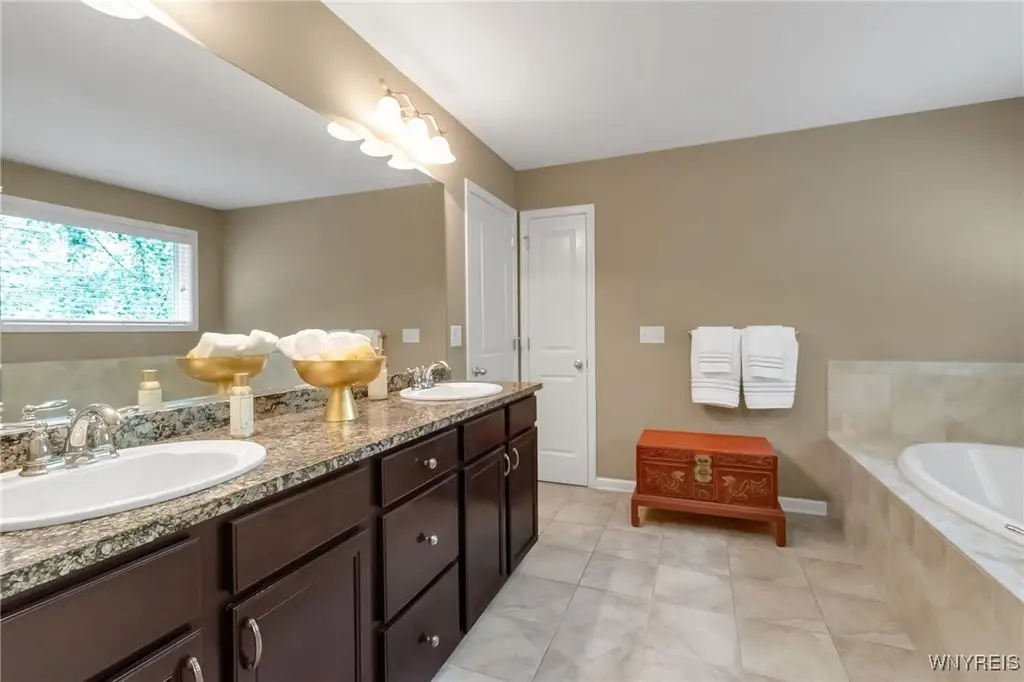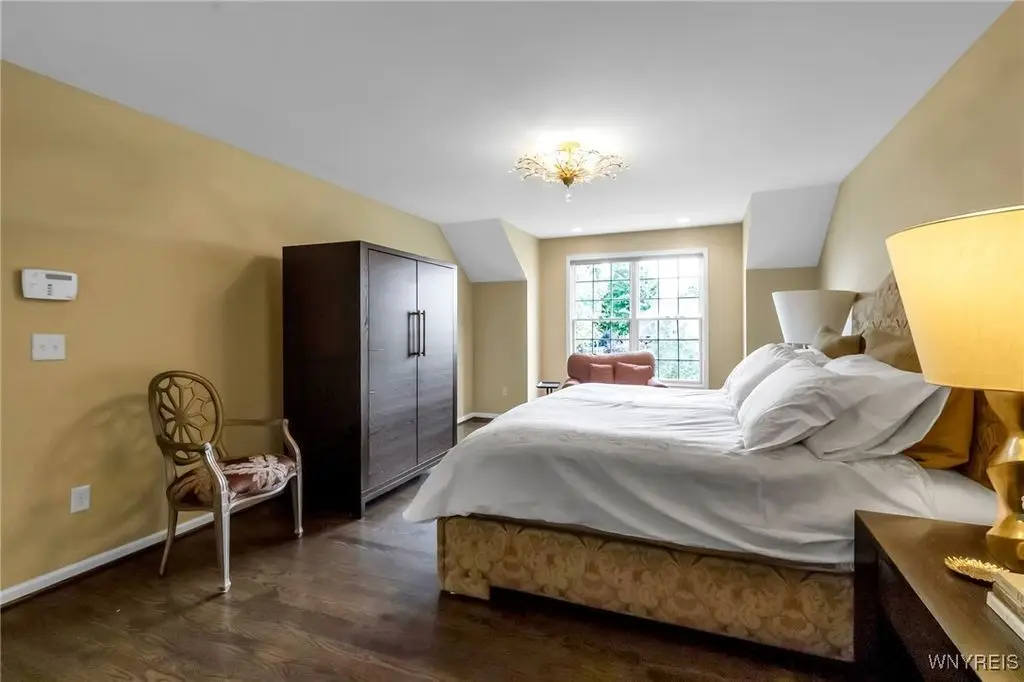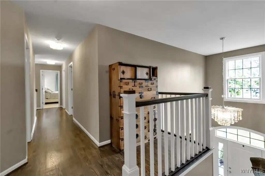 This sophisticated 4-bed, 2.5-bath colonial, w/its stunning curb appeal & beautiful landscaping, sets the tone for a wonderful living experience, seamlessly blending timeless finishes w/beautiful upgrades. As you approach the inviting entrance, a large covered front porch welcomes you to the two-story foyer, where gleaming hardwood floors extend throughout the first floor, adding warmth & richness to the space. The stunning dining room, enhanced with crown molding & wainscoting, adds a sophisticated touch that complements the home's refined character. The kit features granite countertops, stainless steel appliances, a center isle w/a breakfast bar, a walk-in pantry with custom shelving, & a spacious eating area. The great room flows seamlessly from the kitchen & features stunning double-stacked windows, a gas fireplace, & soaring ceilings, creating a comfortable yet luxurious space to relax. The sunroom, surrounded by beautiful windows, is a wonderful addition to the home, perfect for entertaining or relaxing. Off the foyer, the den w/French doors serves as an ideal workspace or quiet retreat. Upstairs, you will find 4 generously sized bedrooms. The spacious primary suite features a large walk-in closet with California custom Closets, an en-suite bathroom that includes a soaking tub, a shower, a double vanity, & a separate water closet. The 3 additional bedrooms are nicely sized & feature new wall-to-wall carpeting. Additionally, the home features a laundry room, a half bath, & a mudroom w/built-in custom shelving offering ample storage space. The backyard is spectacular, featuring a beautiful stone paver patio surrounded by lush landscaping & lovely gardens. Additional features include an irrigation system with added drip lines for watering planters, a security system, custom blinds & window treatments throughout. The home features an abundance of closet space, including several closets equipped w/California custom Closets. The 2.5-car attached side-load garage w/storage space leads to the mudroom. Home is mins to the bike path & all the conveniences for day-to-day living & commute to all suburbs & downtown. Highly rated Clarence Schools!