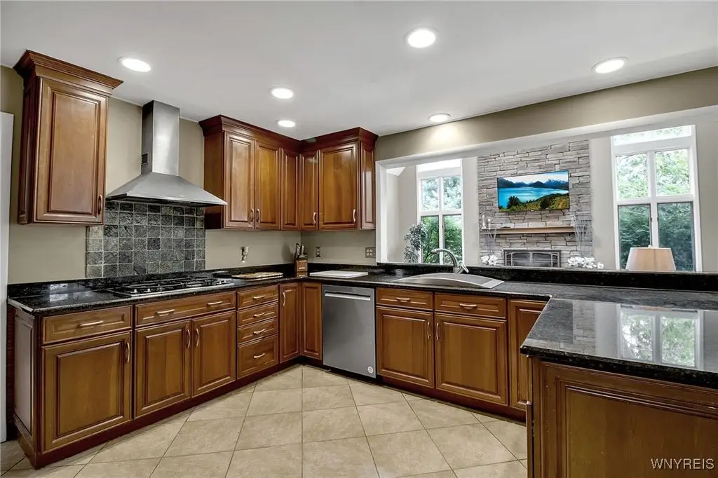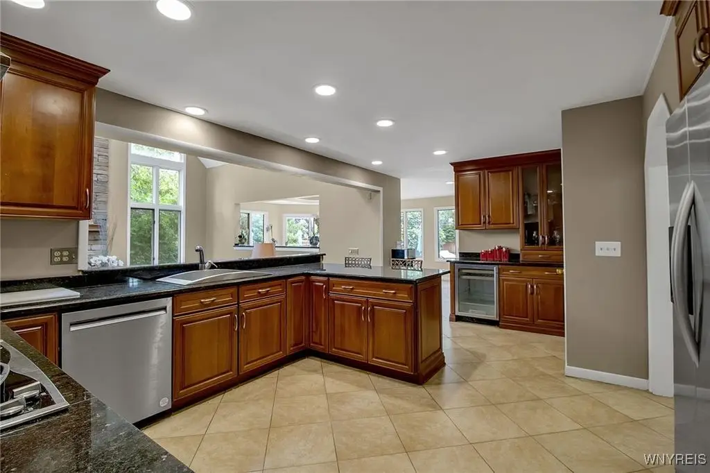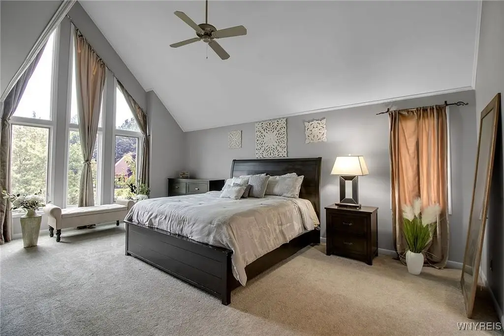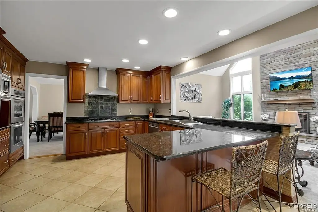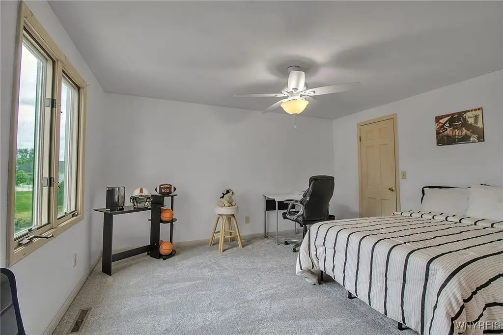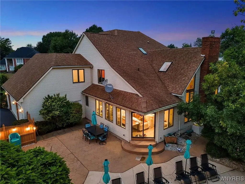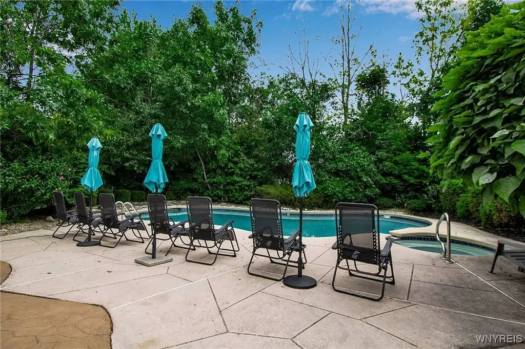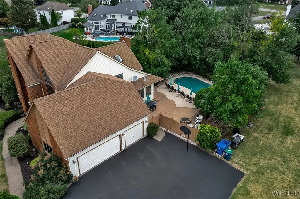 This stunning home features 5 bedrooms and 2.5 baths and is situated on a 1.1-acre cul-de-sac lot in the highly sought-after Loch Lea Estates, close to all conveniences. The large, welcoming foyer features custom railings on the staircase, adding an elegant touch and showcases the open floor plan. The kitchen boasts cherry cabinets, granite countertops, a breakfast bar, and SS appliances. Enjoy the sunroom/breakfast room or spacious eating area off the kitchen and which is enhanced with a beautiful copper tray ceiling. The family room features a soaring ceiling and a layered stone fireplace w/a gas insert. The formal living and dining rooms have new wall-to-wall carpeting (Aug '25). The den featuring newer wall-to-wall carpeting, custom-built-ins, and French doors is off the foyer. The ensuite includes a vaulted ceiling, new wall-to-wall carpeting (Aug '25), a lrg walk-in closet and a glamour bath with whirlpool tub, a shower stall, and granite counters. Additionally, there are 4 more generously sized beds, all w/new wall-to-wall carpeting that was just installed (Aug '25). The fabulous yard is complete w/an in-ground pool that includes a jacuzzi, cool deck surface around the pool, a privacy fence, and additionally a stamped concrete patio surrounding the expansive pool area. The large first-floor laundry/mudroom is accessible from the 3.5-car side-load garage. The partially finished LL rec room, features new wall-to-wall carpeting installed in Aug '25, is a great bonus area. Additional recent upgrades include a newer roof (2018), newer furnace and AC, and 2 new HWTs (2022). The home was repainted throughout and wallpaper was removed in several rooms. Additionally, popcorn ceilings were also removed in many rooms! This lovely home features beautiful natural light. Additional features include an irrigation system in front and back, an alarm system and a whole-house generator. Home is located in the highly rated Wmlsv School District! ADDITIONAL OPEN AREA ON THE LOT CAN NOT BE BUILT ON PER TOWN OF CLARENCE ZONING DEPT PER ORIGINAL MAPPING IN TOWN OF CLARENCE. NO DWELLING CAN BE CONSTRUCTED ON THE OTHER PORTION OF THE LOT. Delayed negotiations - Offers due on Fri, 8/29 at 11 AM.