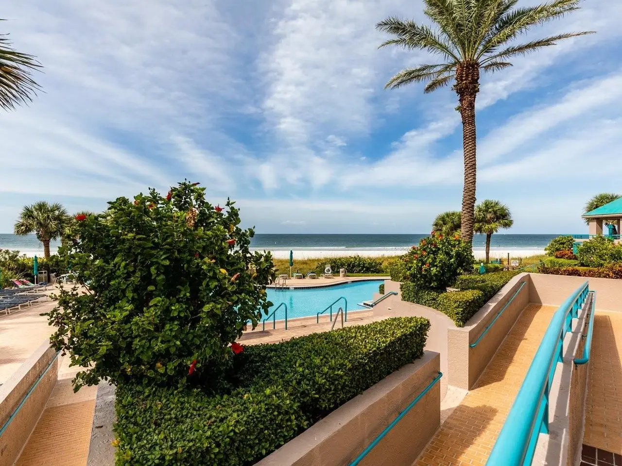 Enjoy beachfront living in the luxury resort-style complex of the Ultimar on Sand Key. This 2 bedroom, 2 full bath, sun-filled condo on the 5th floor has 1489 sq. ft. The 5th floor is just the right height to sit on your balcony & watch the dolphin play. Carpet in main living areas, halls & bedrooms with tile in kitchen, foyer & baths. Living room & both bedrooms have sliders that open to the covered gulf front balcony. The large kitchen has a huge island with a snack bar & eat-in area overlooking the Intracoastal. Split bedroom plan affords everyone their privacy. The primary suite includes a walk-in closet, en-suite bath with a dual-sink dressing area, also a separate shower and large garden tub. Great for soaking after those long walks on the sugar sand beaches of Sand Key. Spacious views of the aquamarine Gulf of Mexico and beautiful nighttime lights of the Intracoastal Waterway. In this charmed space, you will enjoy the gentle Gulf breezes while listening to the soothing sounds of the surf. PRIVATE GARAGE #122 in parking garage. The Resort Style complex of The Ultimar is 24hr guard gated, 3 geo-thermal heated pools with spas, tennis courts, pickle ball, putting green, basketball court, croquet lawn, grill area, firepit area, corn hole, shuffle board, fitness center, billiards, media room, social room, steam and sauna. Close to great restaurants & shopping, and a short drive to the Tampa Airport & all the great venues for our championship sports teams. Start Living the Florida Beach Lifestyle Today! See Virtual Tour!