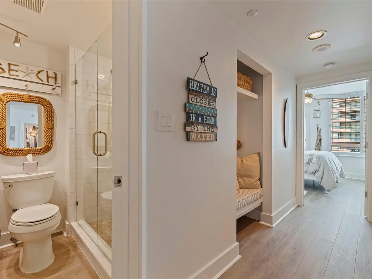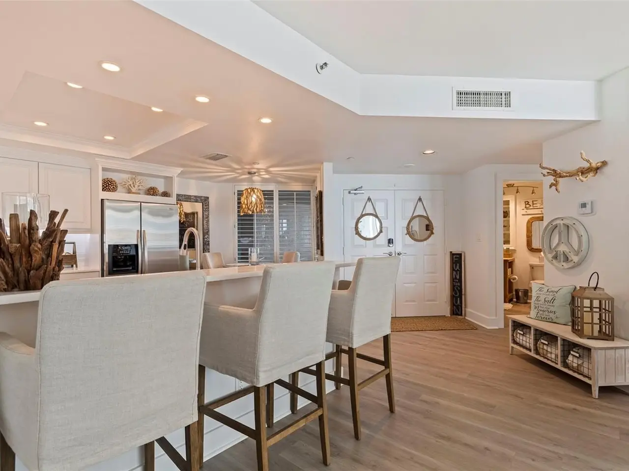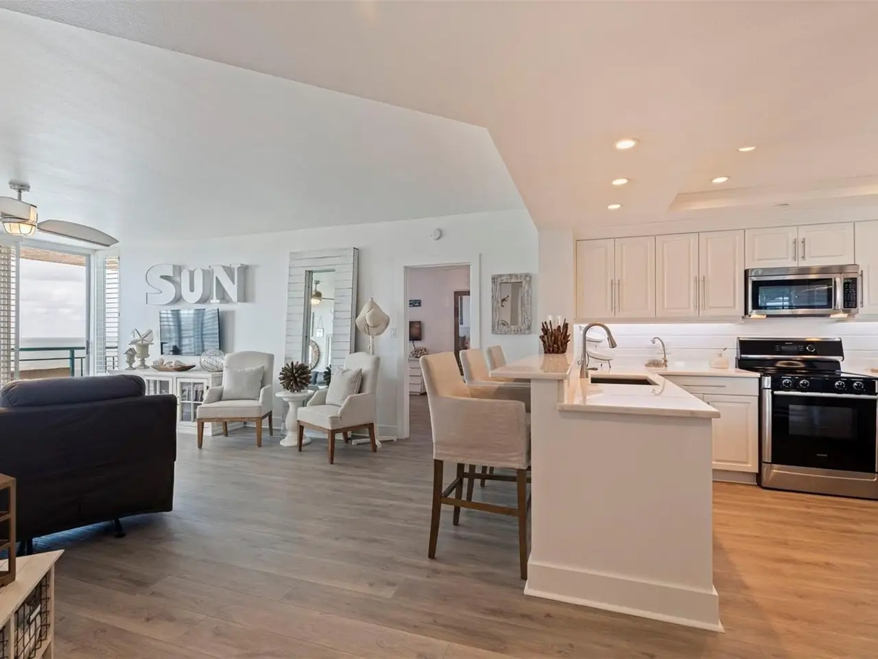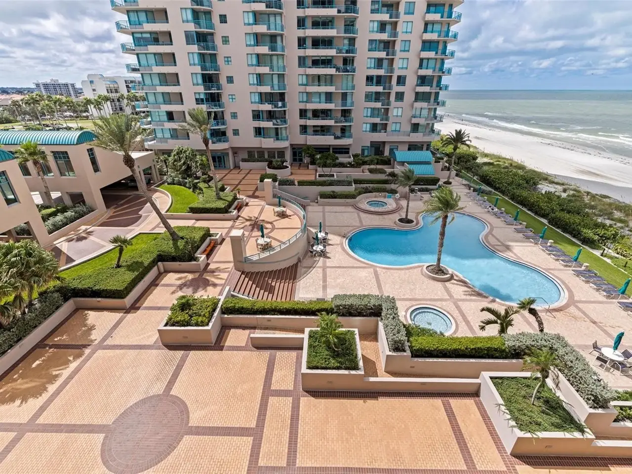 Under contract-accepting backup offers. Welcome to Coastal Chic!! This beautiful fully updated condo with southwest exposure has stunning sunsets everyday & views all the way down the beach. Luxury vinyl planking throughout makes for easy maintenance. Gourmet's delight eat-in kitchen has white shaker cabinets with marble tops & under cabinet lighting. Siemen's SS range, microwave & dishwasher with Whirlpool refrigerator. Breakfast bar opens to the living/dining room. Living room has shiplap accent wall. Popcorn removed from all ceilings. Designer fans & lighting throughout. Plantation shutters at every window & door. All interior doors replaced & updated trim with wide baseboards.. This split bedroom plan affords everyone their privacy. Guest bedroom has a shiplap accent wall along with large walk-in closet. Guest bath also has big tile -in shower. Both baths have custom wood vanities. Primary bedroom & lviing room have sliders that open to spacious balcony. Great for having a cool drink & watching the dolphin at play. Primary bathroom has wood vanity with double sinks, large jetted tub & nice tile shower. Huge walk-in closet. Designer furniture & furnishings included in sale. Fully turnkey. Just bring your toothbrush, bathing suit & flip flops. Coveted DEEDED PRIVATE GARAGE #18 in parking garage. A/C 2023 & water heater 2024. The Ultimar is a world class condo complex on Sand Key of famous Clearwater Beach. Miles of pure white sand. Lush tropical landscaped grounds are expertly maintained. 24 hr guard gated. True Resort Style complex has 3 geo thermal heated pools w/spas, 3 tennis courts, pickle ball, basketball ct, putting green, croquet lawn, grill area, firepit area, shuffleboard, corn hole, gym, steam & sauna, billiards rm, media rm, social rm with catering kitchen and baby grand piano. Walk to great restaurants & shops or catch the Beach Trolley right out in front of the building. A short drive to Tampa & the airport plus all of the sports venues of our championship teams. START LIVING THE FLORIDA BEACH LIFESTYLE TODAY!! Buyer to verify room dimensions. See Video. Call to make an appointment for your private viewing today!