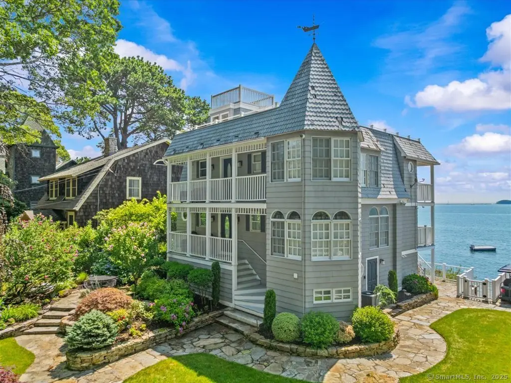 Spectacular waterfront estate! Unparalleled views of Long Island Sound & Duck Island + your own private sandy beach with 72' of frontage! 61 Grove Way is on the market for the first time in 29 years! Stately Victorian exterior aesthetic, designed to maximize the experience of waterfront living on every level of the home. Spacious open-concept remodeled interior living spaces blend elegance with functionality. State-of-the-art kitchen w/ heated floors, granite counters, gas range, high-end appliances, large island & sunny turret breakfast nook is a natural gathering place. Open Living/Dining Area w/ hardwood floors, floor-to-ceiling glass walls & large sliding doors allow sunlight to flood every corner while providing uninterrupted vistas of the shimmering water. Expansive covered decks extend from the house creating outdoor living spaces perfect for lounging, entertaining, or simply soaking in the serenity of the setting. Upper level offers 3 bedrooms designed as personal retreats. Master suite w/ glass sliders to water-facing balcony and bathroom w/ heated floor, stall shower & double sinks. Second bedroom also w/ glass sliders to share the covered deck. This level includes a 3rd bedroom, a cozy turret sitting room & front-facing covered deck. Ascend to the 3rd level for exquisite views of Long Island Sound from the rooftop terrace. Lower level is an entertainer's dream w/ Rec/Playroom, Full bath & laundry room + Event Kitchen offering storage galore! Lower level walks out to flagstone patio w/ outdoor kitchen, hot tub & al fresco dining areas, overlooking your private beach. Fabulous setting to be enjoyed year-round w/ space & a place for everyone! Professionally landscaped grounds with irrigation system. Swimming platform installed 2024 & associated mooring included with property. Member of Grove Beach Improvement Association. Year built states 1898 but was completely renovated in 1990.