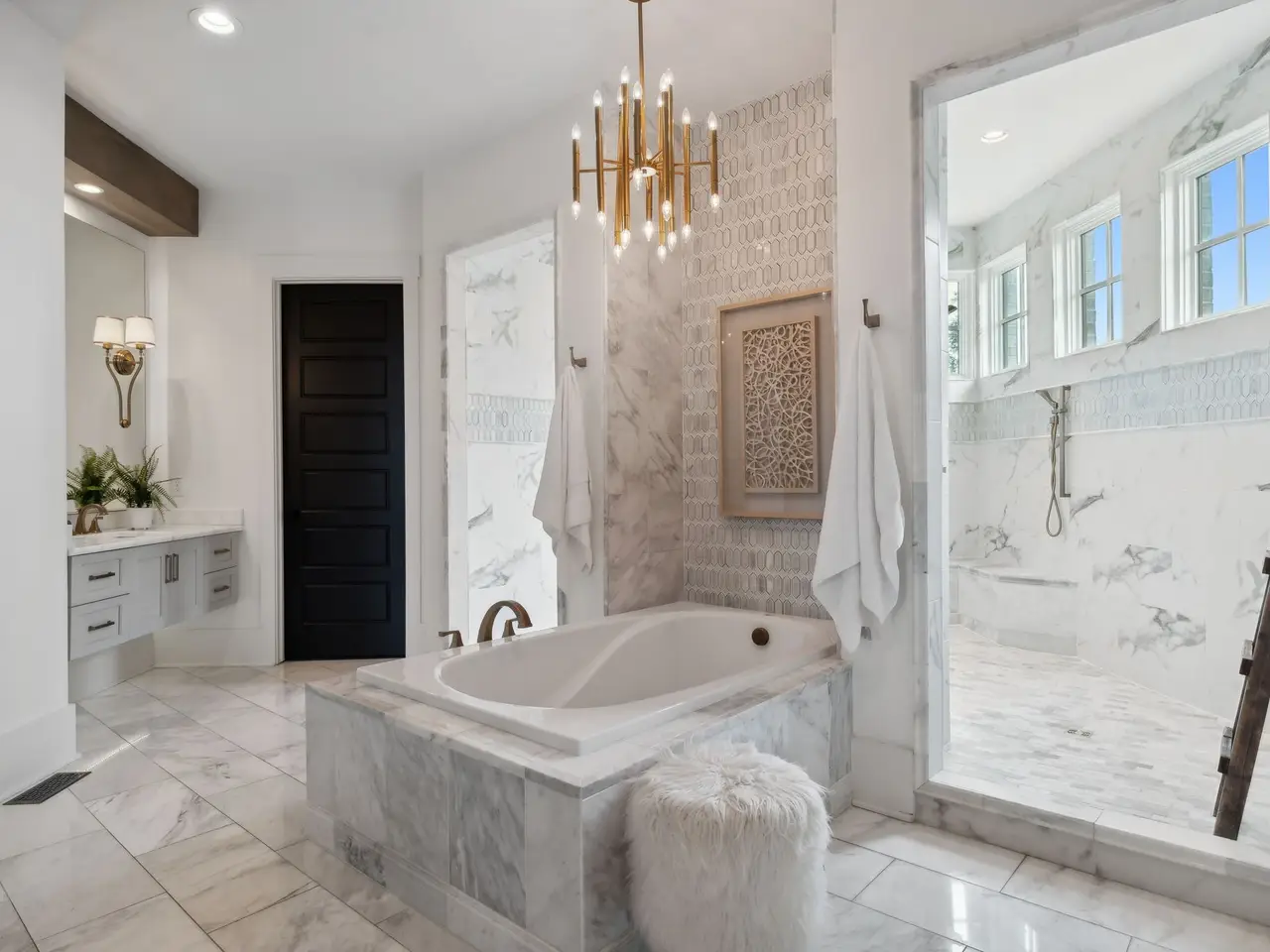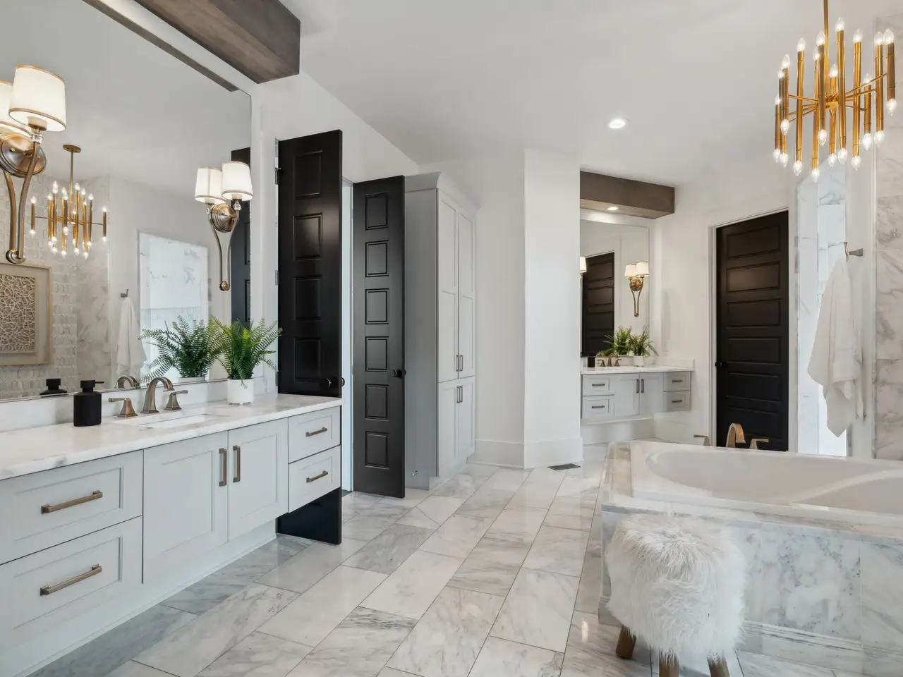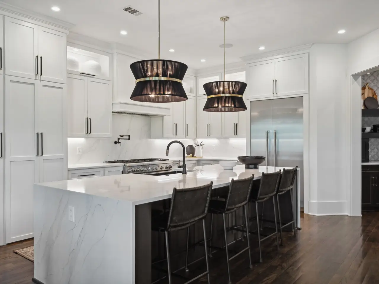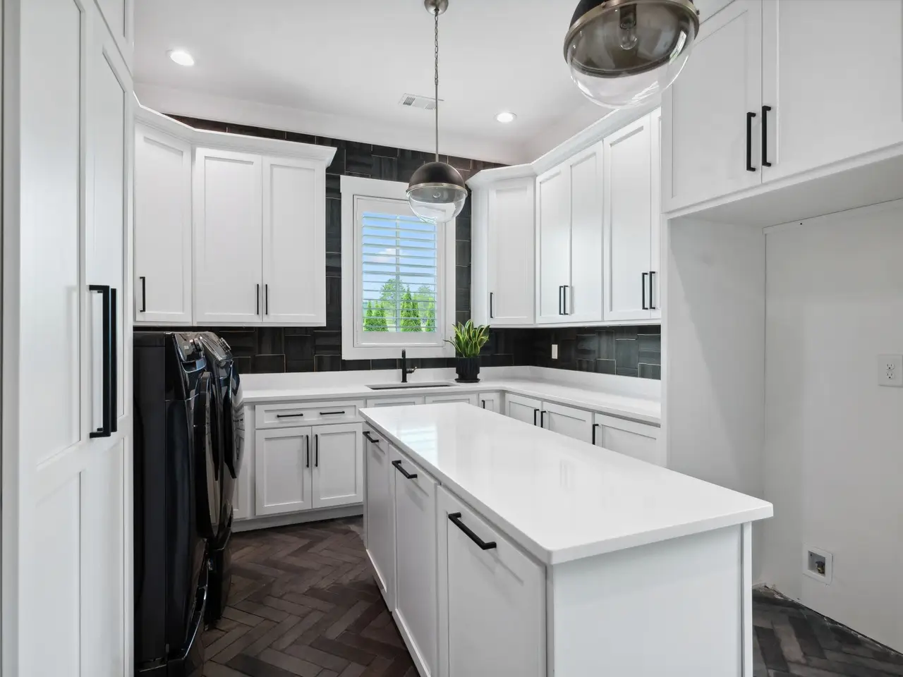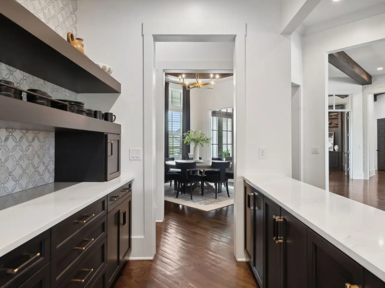 The main level also features a formal dining room with butler's pantry, private office with custom built-ins, spacious laundry room with island, and drop zone. The primary suite retreat overlooks the golf course with white brick accents, spa-inspired bath, soaking tub, dual vanities, and oversized dual-entry shower. Two additional en-suite bedrooms plus a powder room complete the main floor.