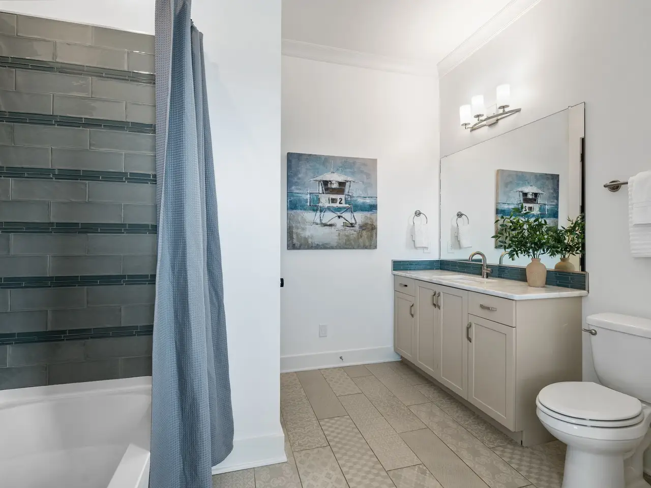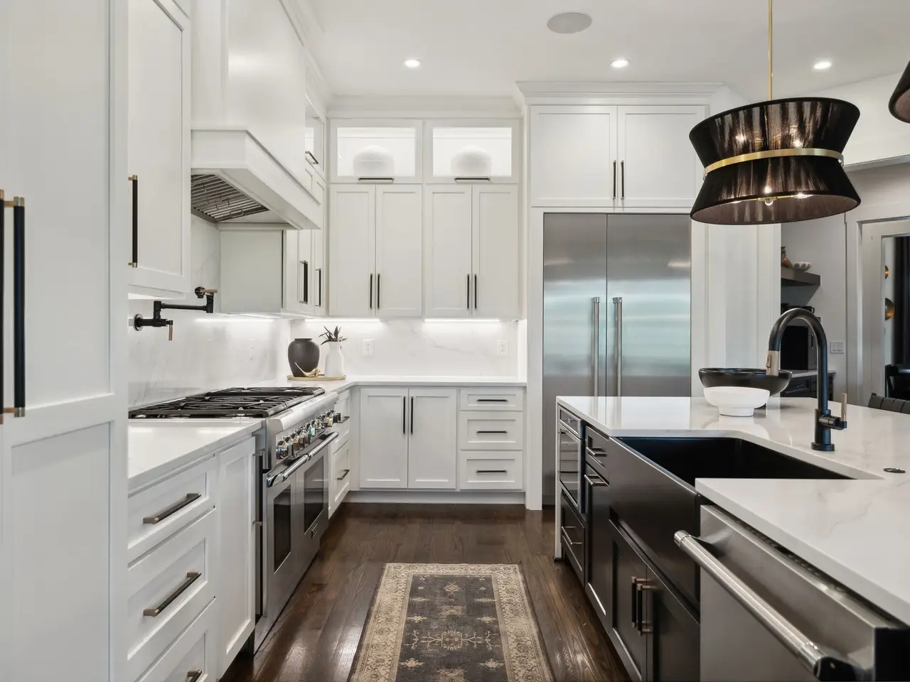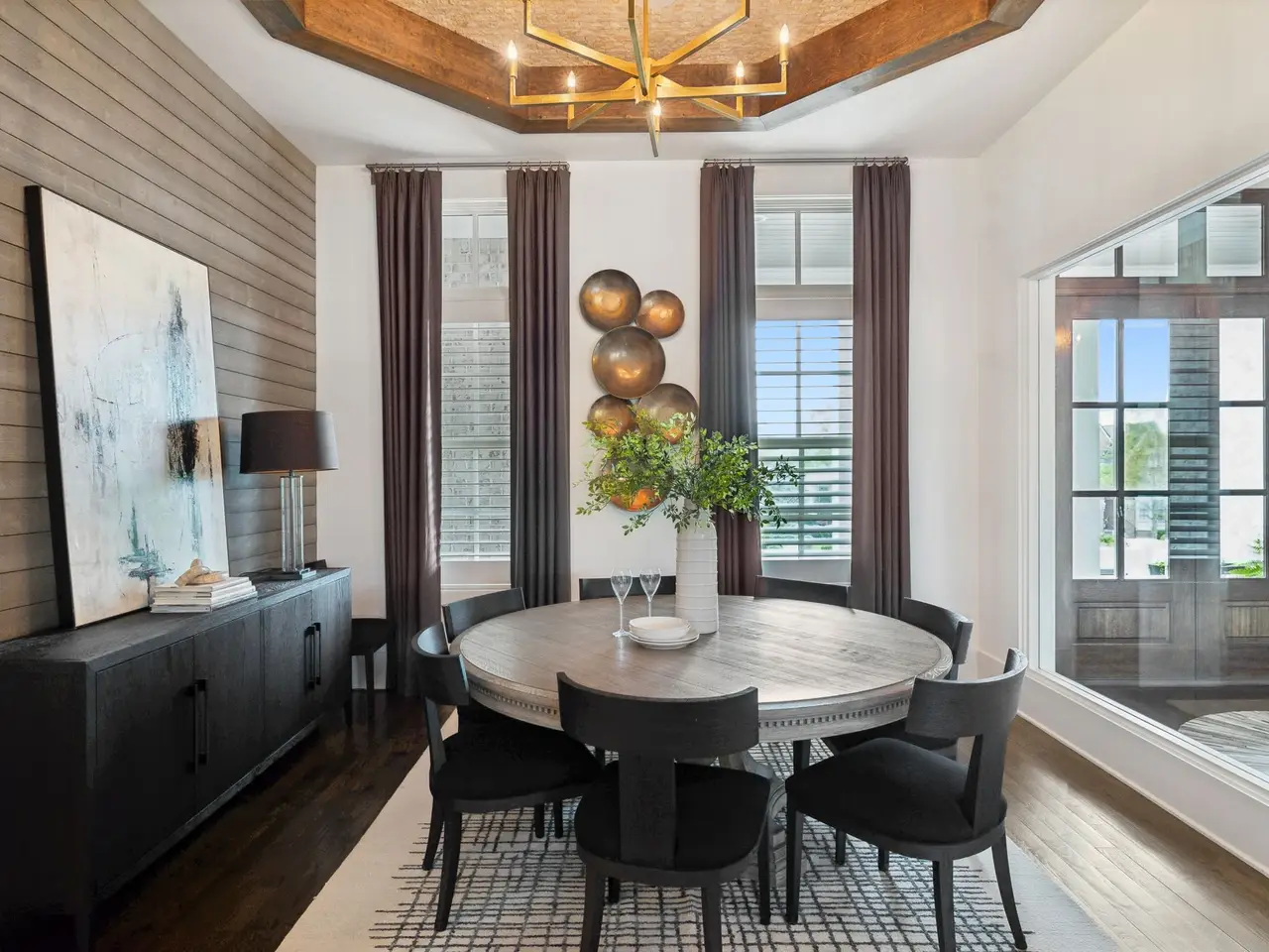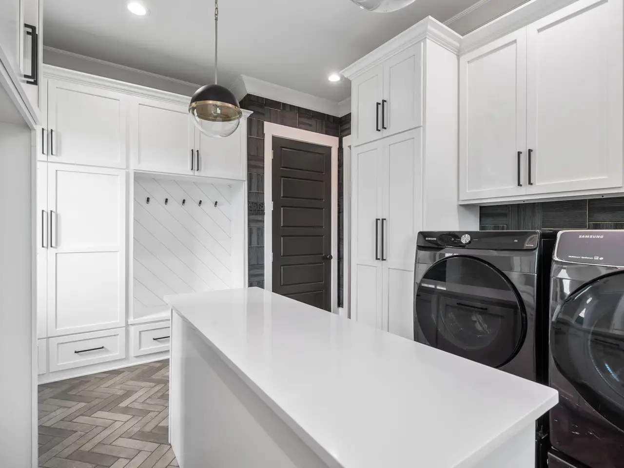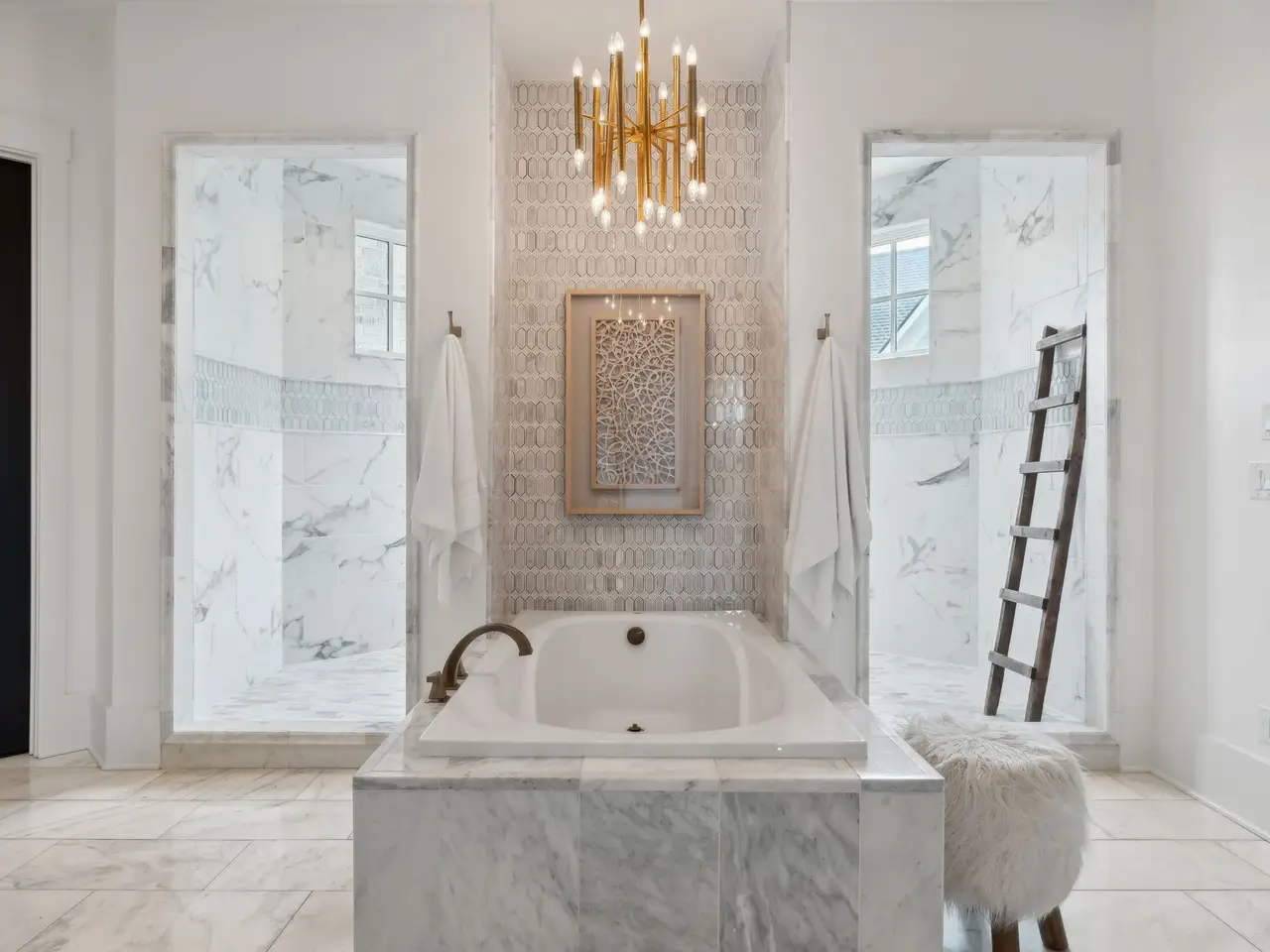 The main level also features a formal dining room with butler's pantry, private office with custom built-ins, spacious laundry room with island, and drop zone. The primary suite retreat overlooks the golf course with white brick accents, spa-inspired bath, soaking tub, dual vanities, and oversized dual-entry shower. Two additional en-suite bedrooms plus a powder room complete the main floor.