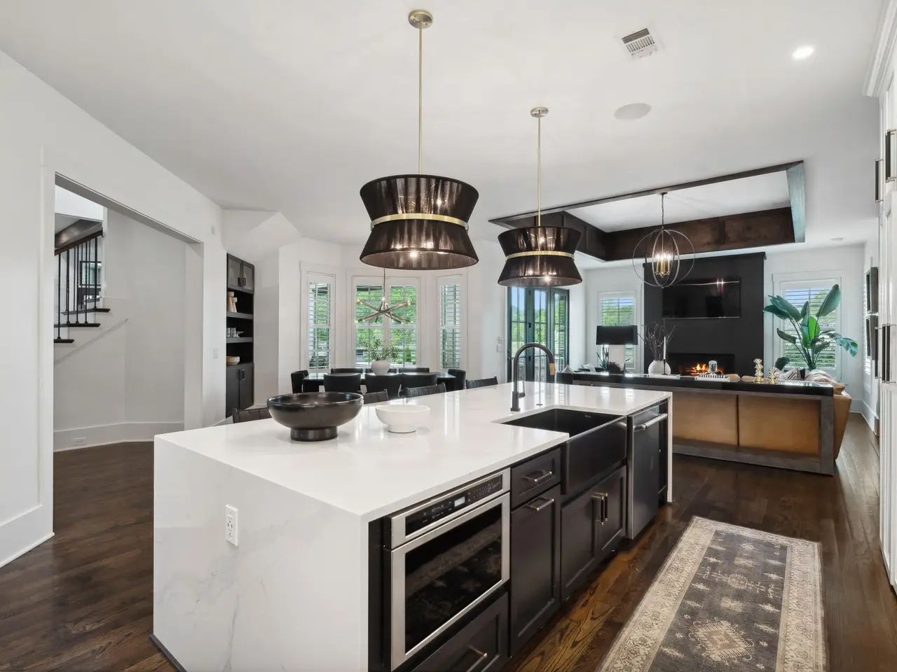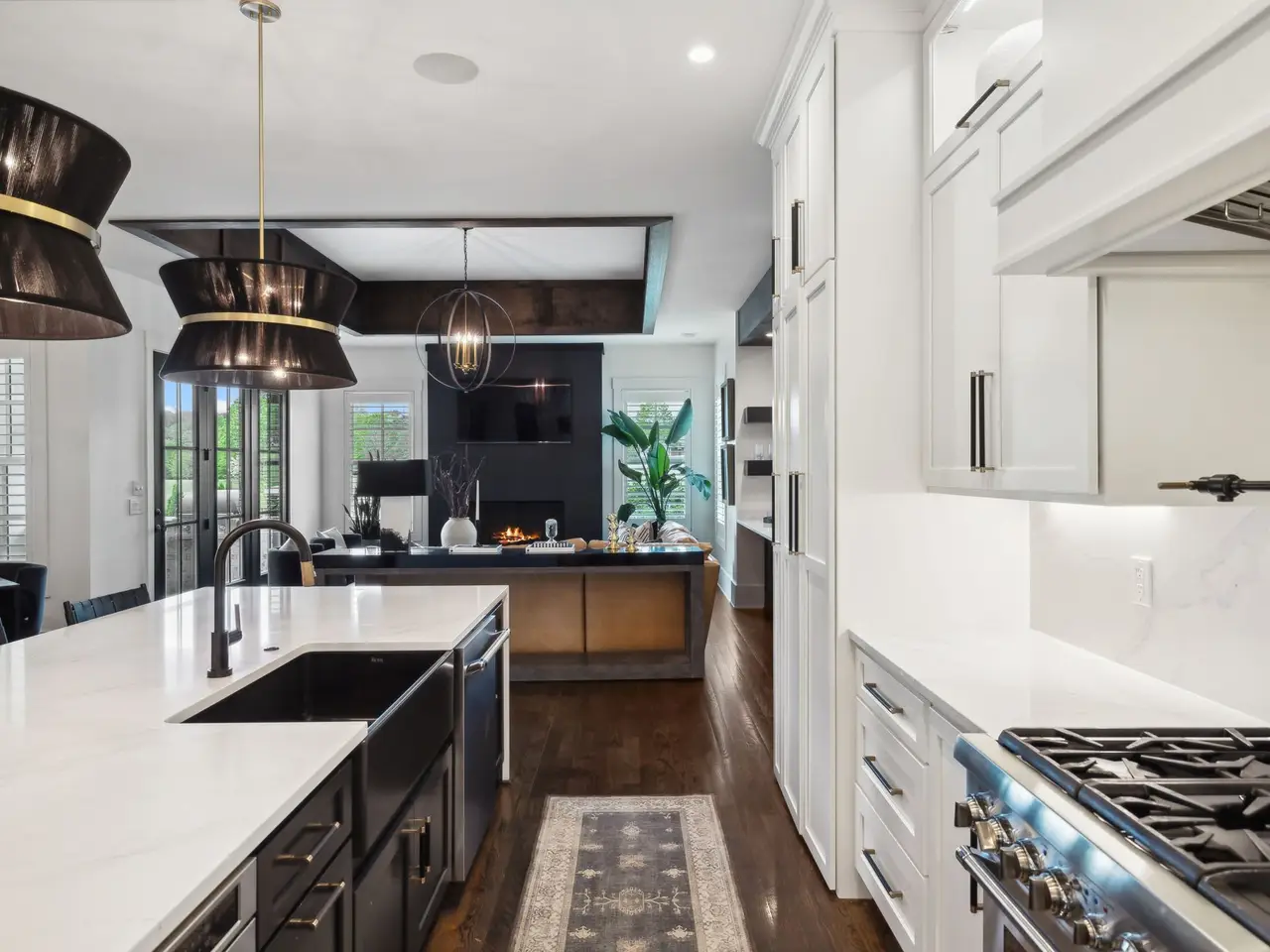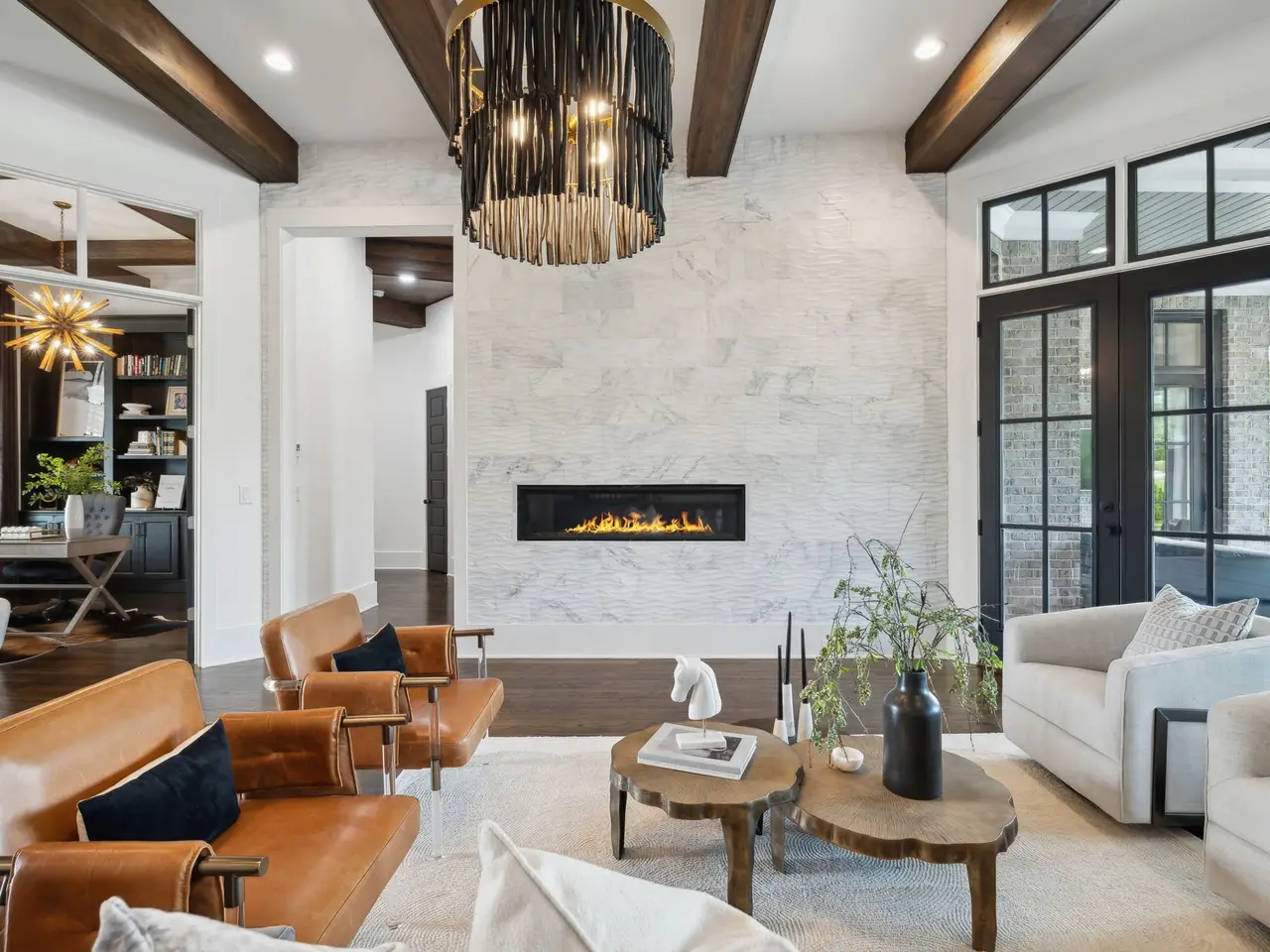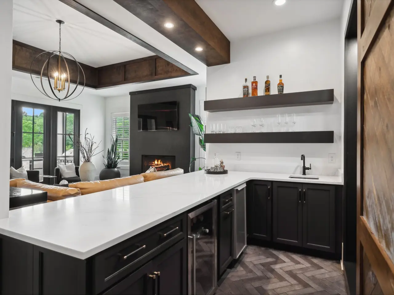 Step inside to an open-concept living room with floor-to-ceiling tile fireplace, gas logs, and expansive golf course views. The gourmet chef's kitchen is a centerpiece, boasting a quartz waterfall island, stainless steel appliances, ceiling-height custom cabinetry, pot filler, under-cabinet lighting, and hidden walk-in pantry. A second living area with wood-accented tray ceiling flows into a designer wet bar with wine display and dual beverage coolers--ideal for entertaining.