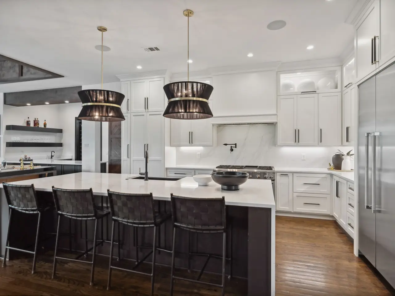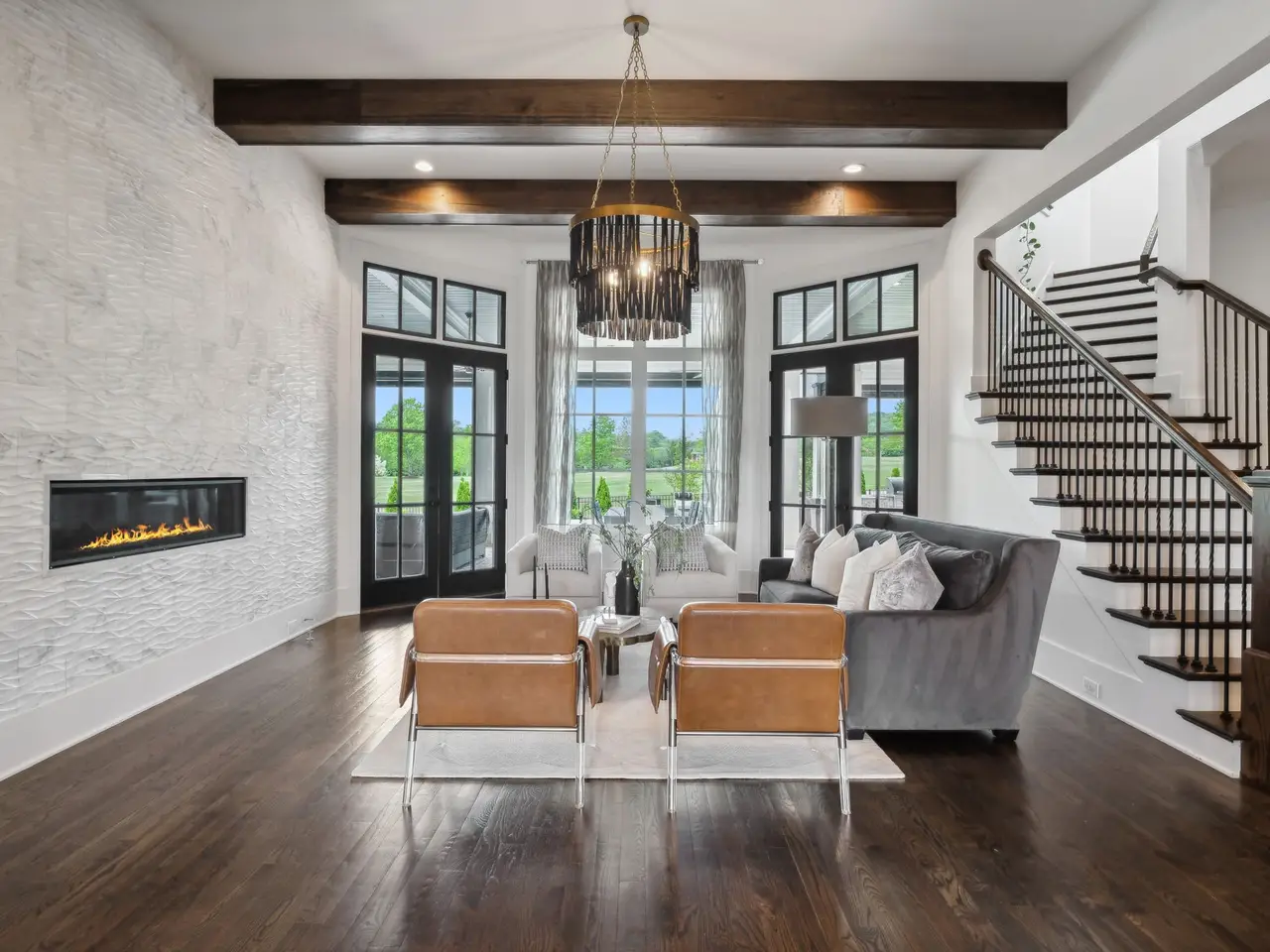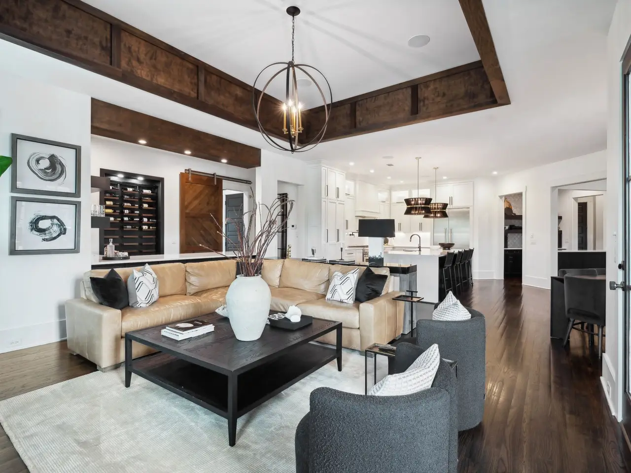 Step inside to an open-concept living room with floor-to-ceiling tile fireplace, gas logs, and expansive golf course views. The gourmet chef's kitchen is a centerpiece, boasting a quartz waterfall island, stainless steel appliances, ceiling-height custom cabinetry, pot filler, under-cabinet lighting, and hidden walk-in pantry. A second living area with wood-accented tray ceiling flows into a designer wet bar with wine display and dual beverage coolers--ideal for entertaining.